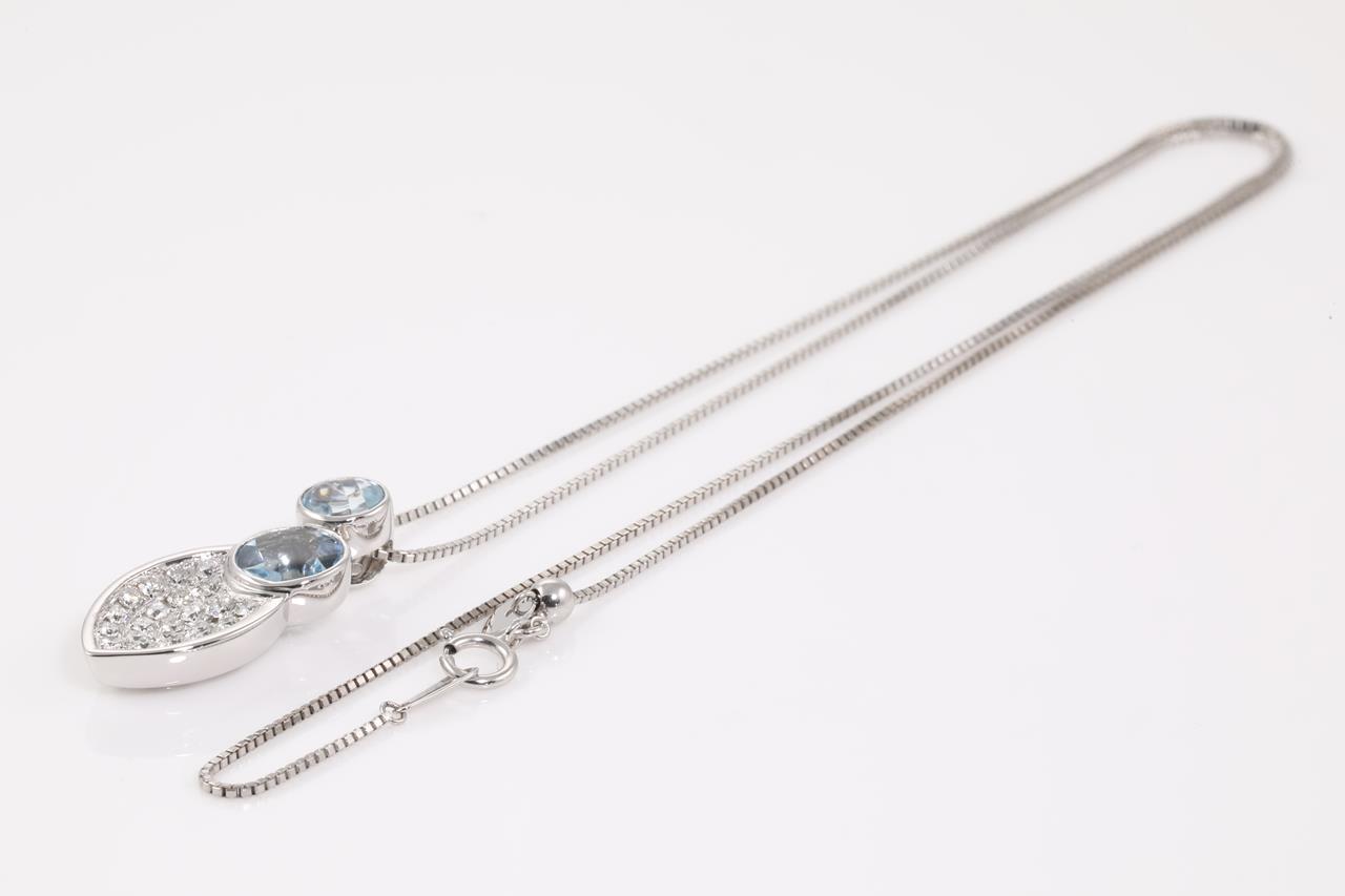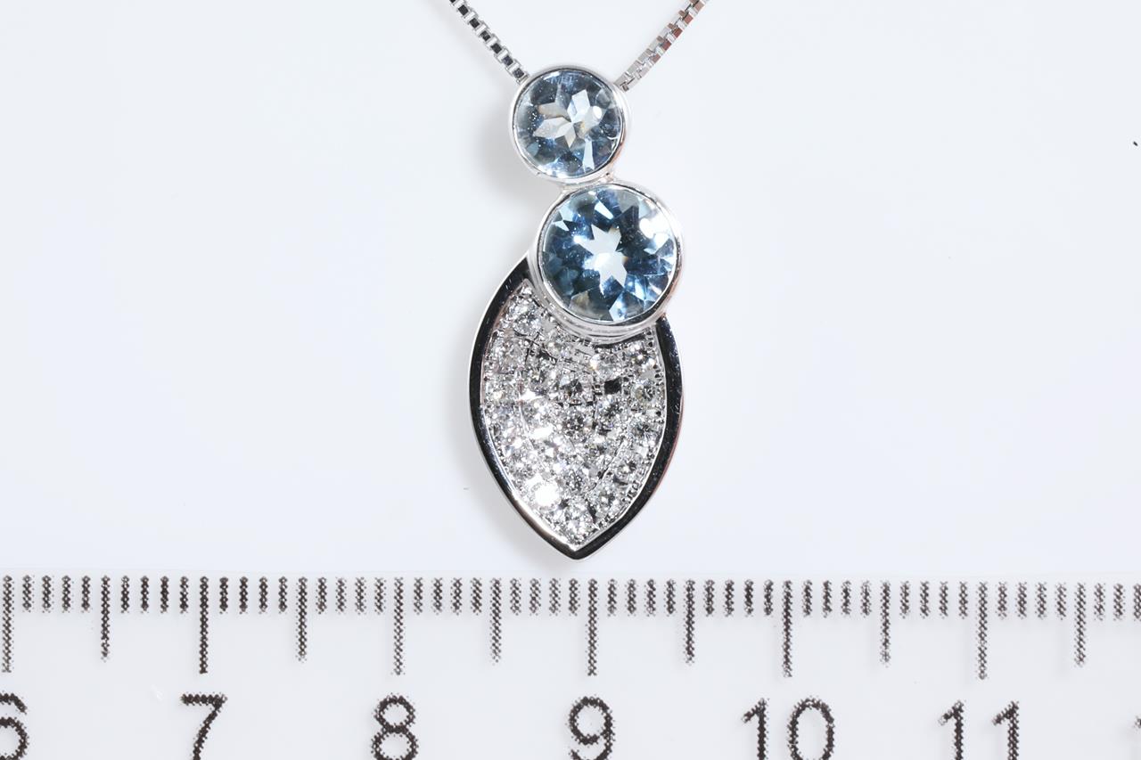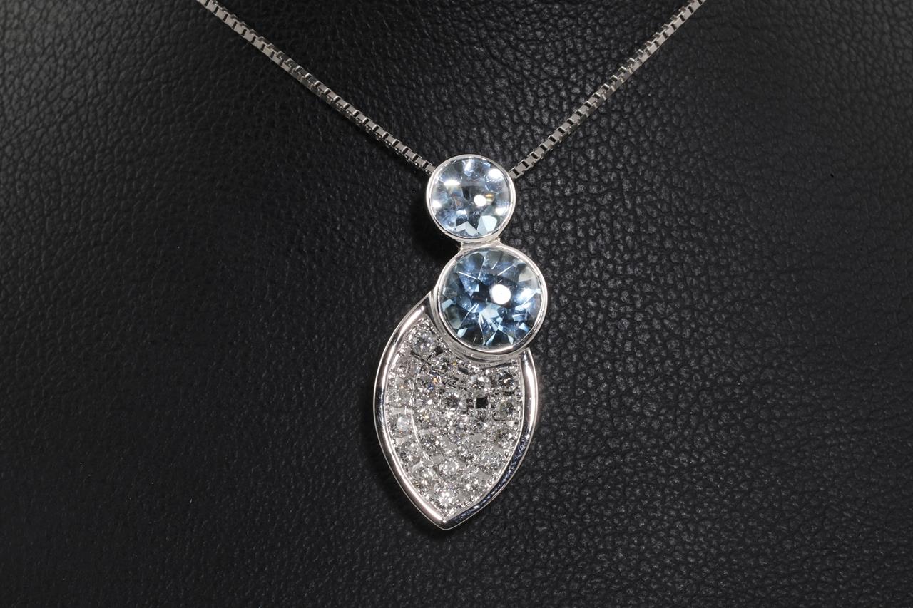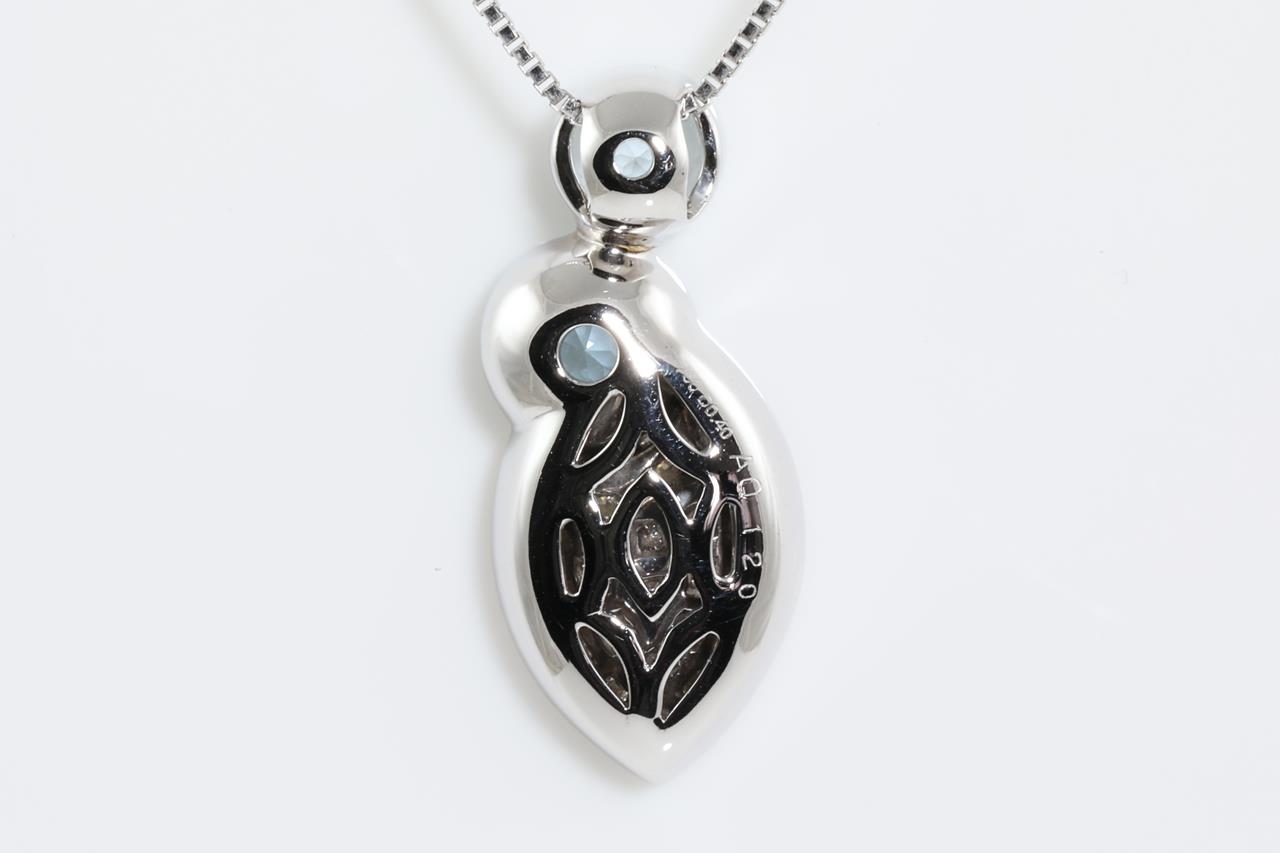 Aquamarine and diamond pendant with round Aquamarine totalling 1.20ct and Diamonds totalling 0.40cts (Estimated grading: G VS-SI). 18ct white gold with 44cm adjustable chain. Weight: 7.3g (Pre-owned)