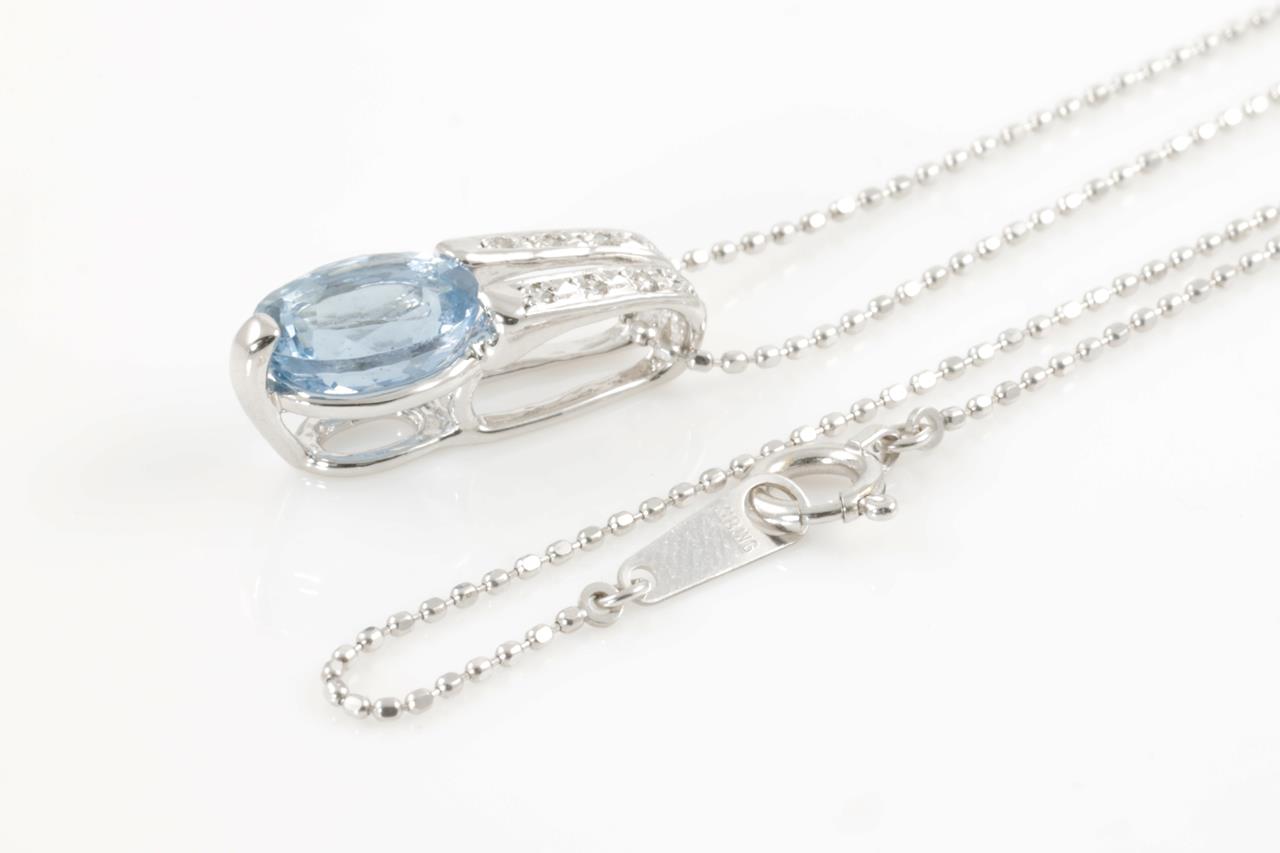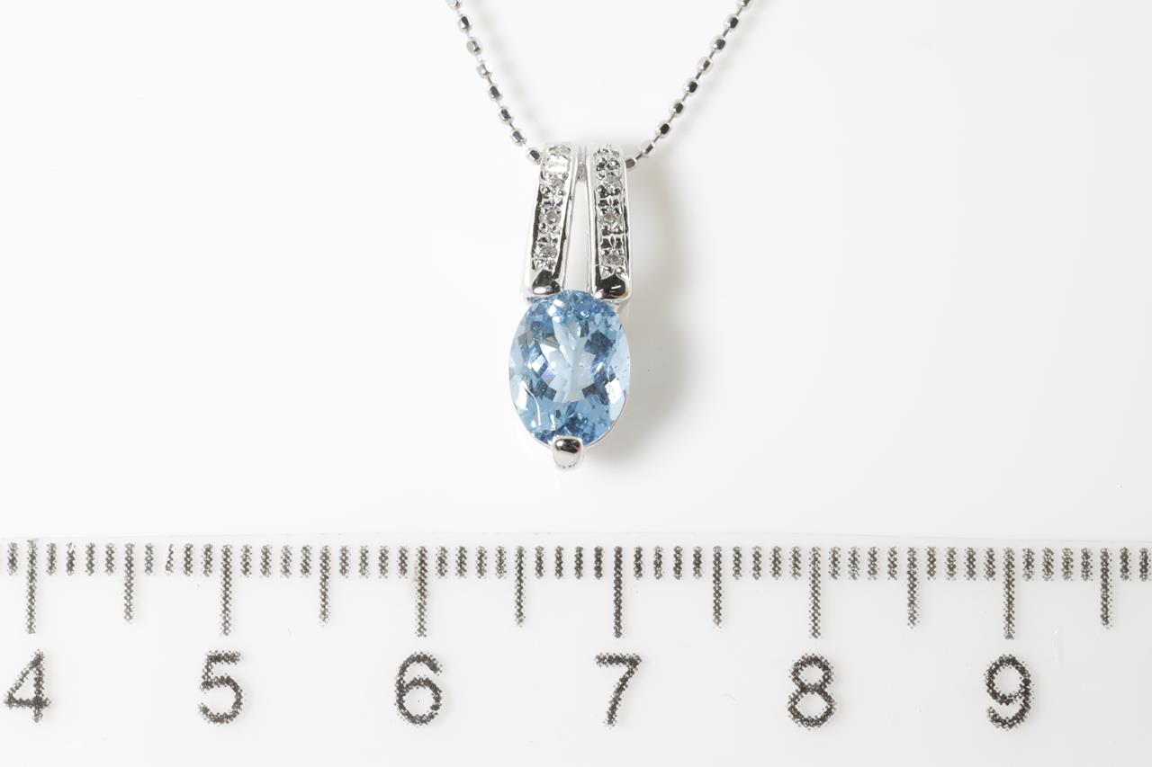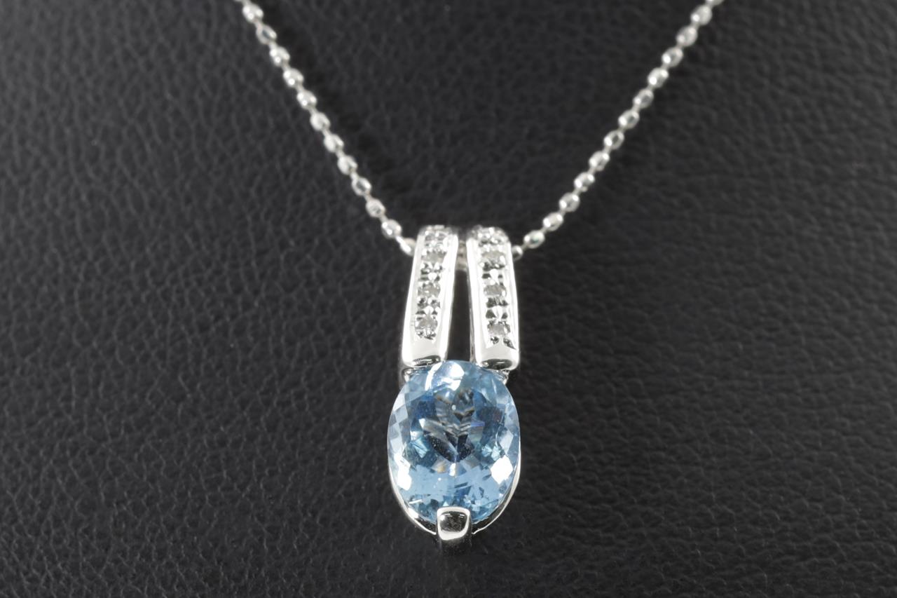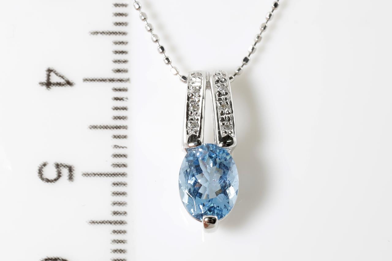 Aquamarine and Diamond pendant with an oval Aquamarine of 0.95ct and Diamonds totalling 0.04cts. 18ct white gold with adjustable 40cm chain. Weight: 2.8g (Pre-owned)