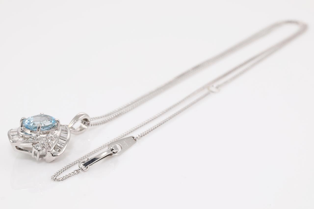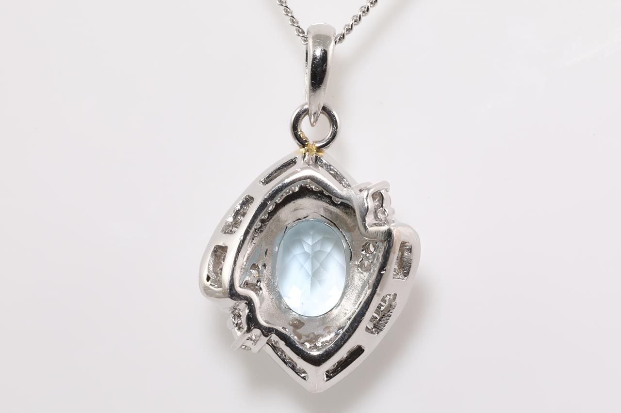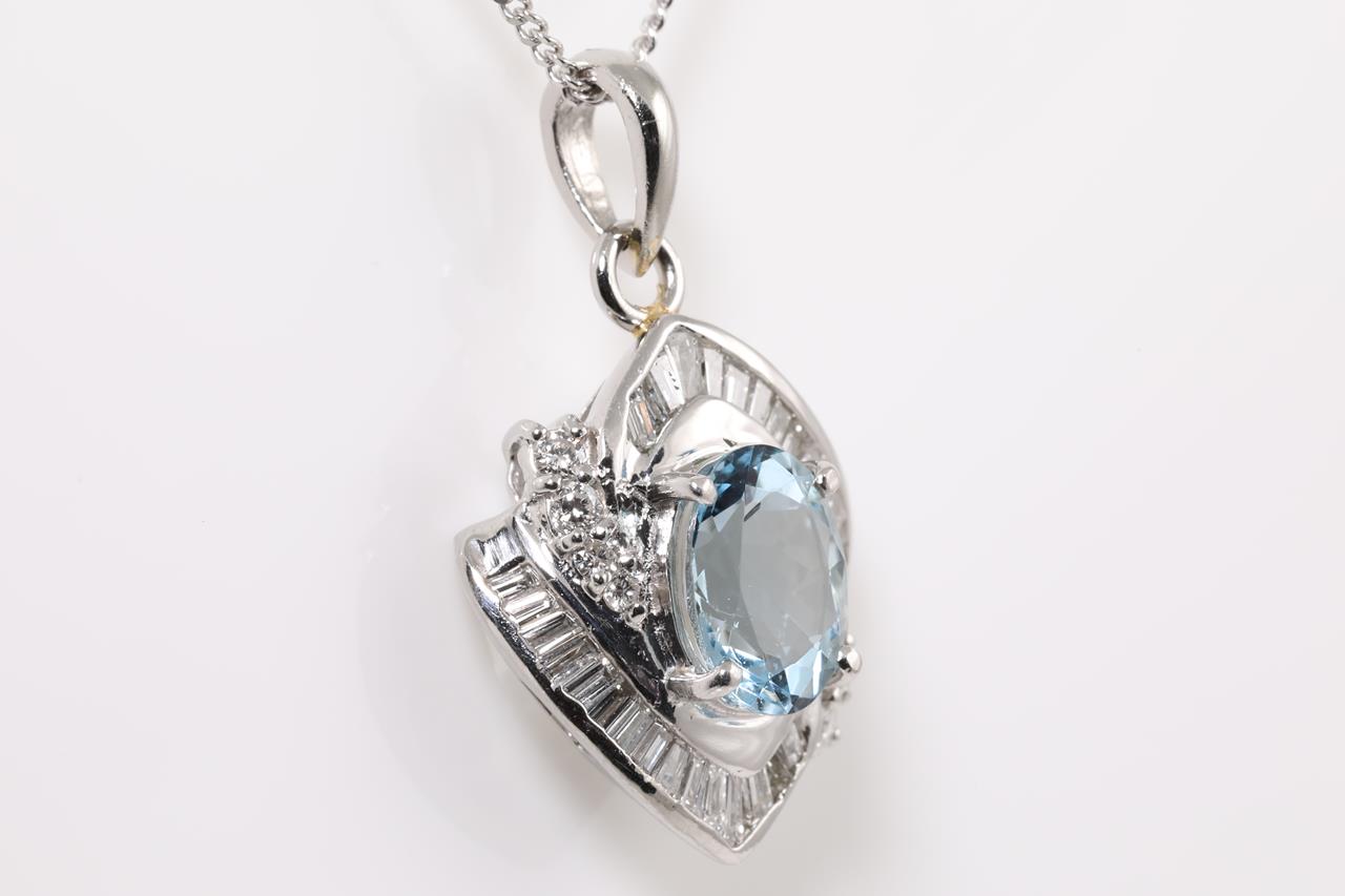 Aquamarine and Diamond pendant with oval shape Aquamarine of approximately 1.00ct and round & baguette cut Diamonds totalling approximately 0.69cts (Estimated grading: G-H SI). Note 2 damaged Diamonds. Platinum with 38cm platinum chain. Weight: 6.7g (Pre-owned)