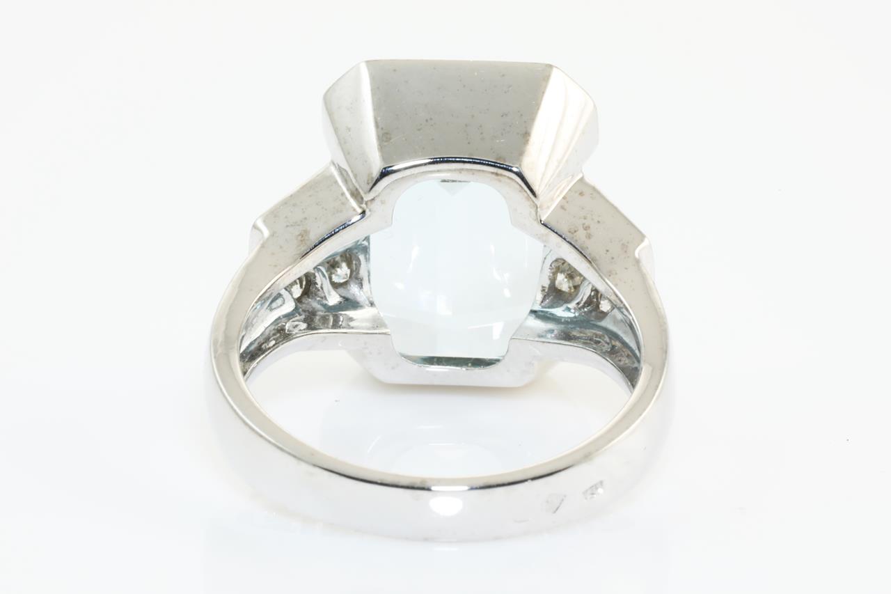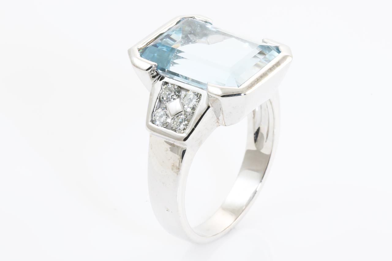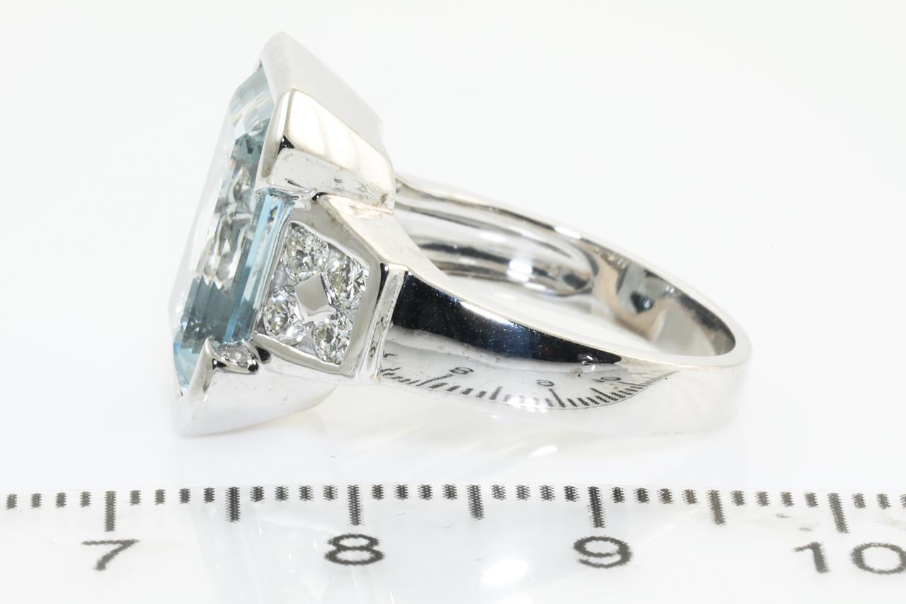 Aquamarine and Diamond ring with emerald cut Aquamarine of approximately 6.20ct and Diamonds totalling approximately 0.28cts. 18ct white gold. Ring size: M1/2 - Note this ring cannot be resized up, it can be resized down by ring clip. Weight: 8.9g (Pre-owned)