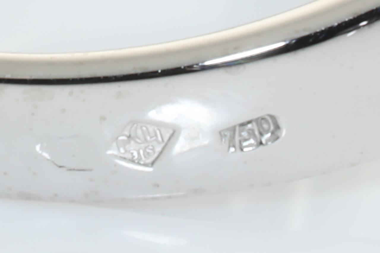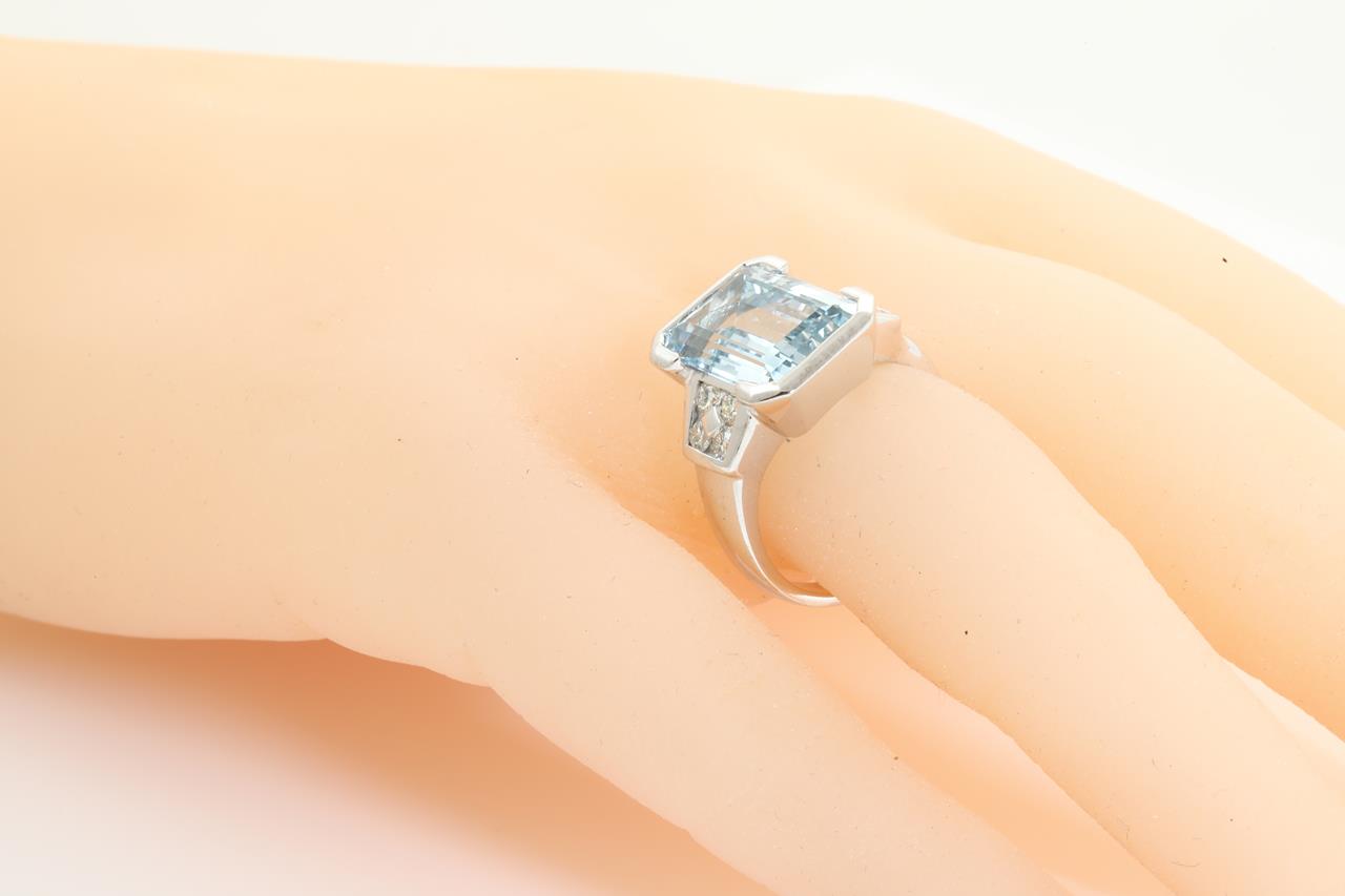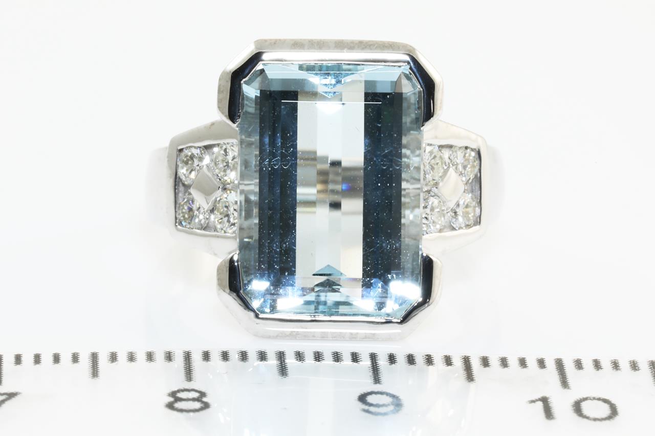 Aquamarine and Diamond ring with emerald cut Aquamarine of approximately 6.20ct and Diamonds totalling approximately 0.28cts. 18ct white gold. Ring size: M1/2 - Note this ring cannot be resized up, it can be resized down by ring clip. Weight: 8.9g (Pre-owned)
