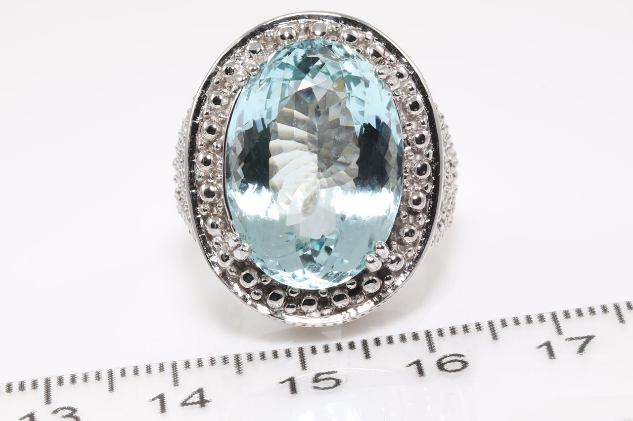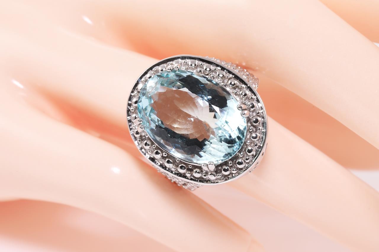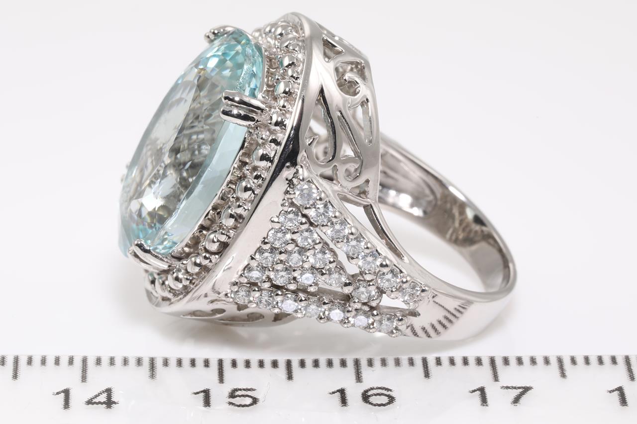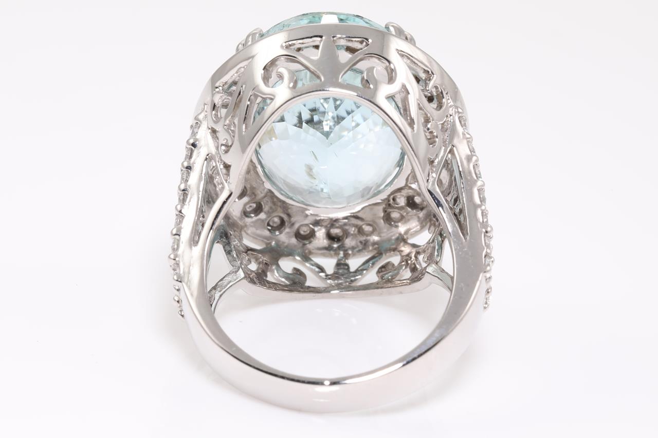 Aquamarine and Diamond Ring with oval shape Aquamarine of 14.62ct and round shape Diamonds totalling approximately 0.86ct (Estimated grading: H VS-SI). 14ct white gold. Ring size M1/2. Weight 13.8g. (Pre-owned)