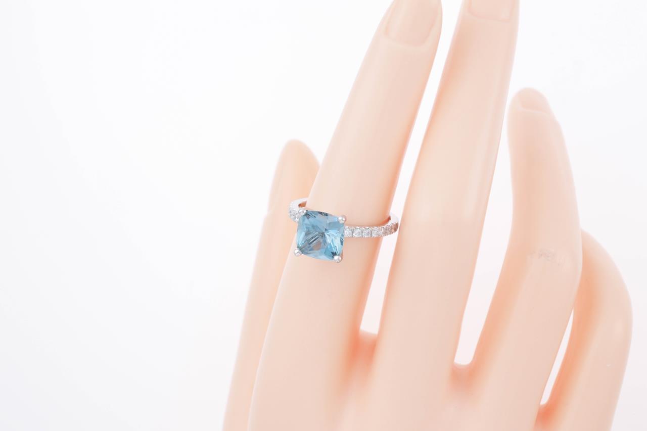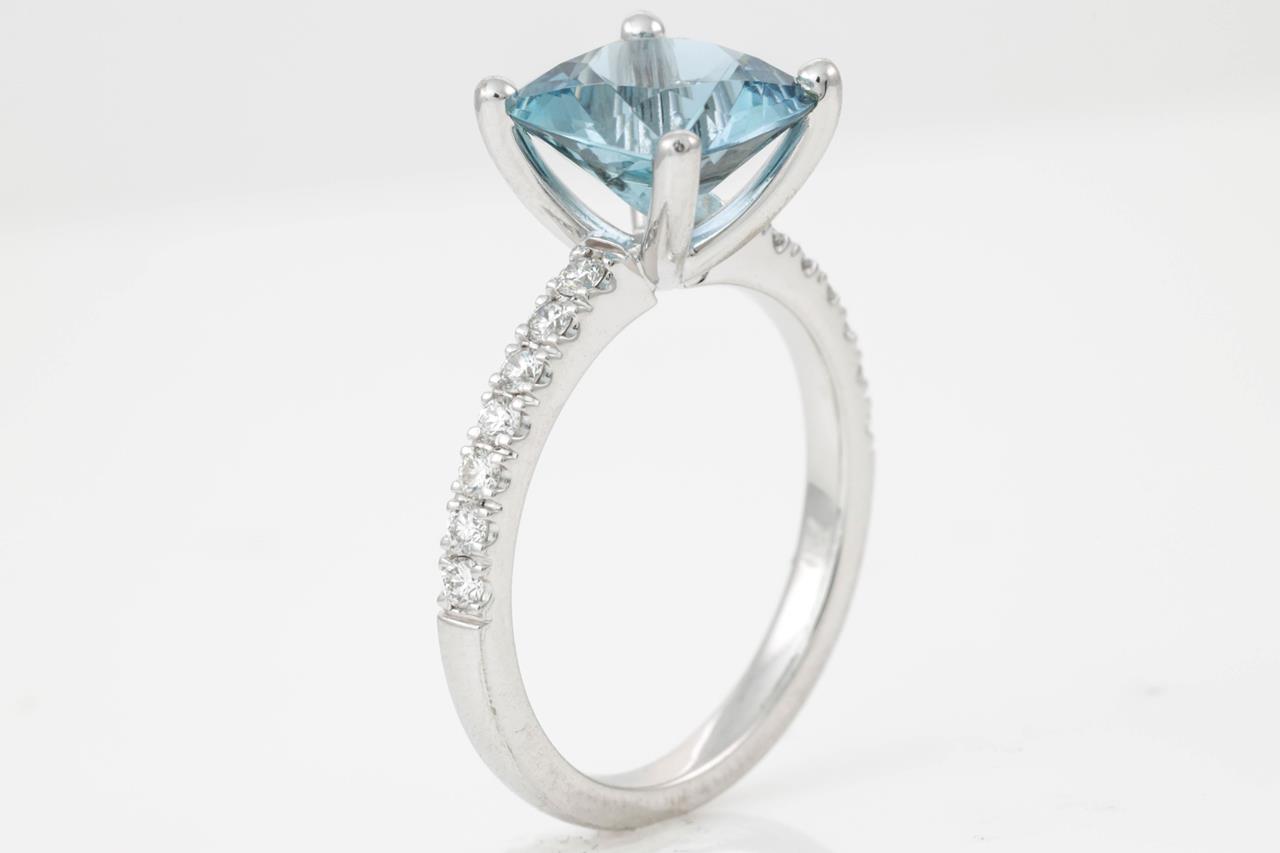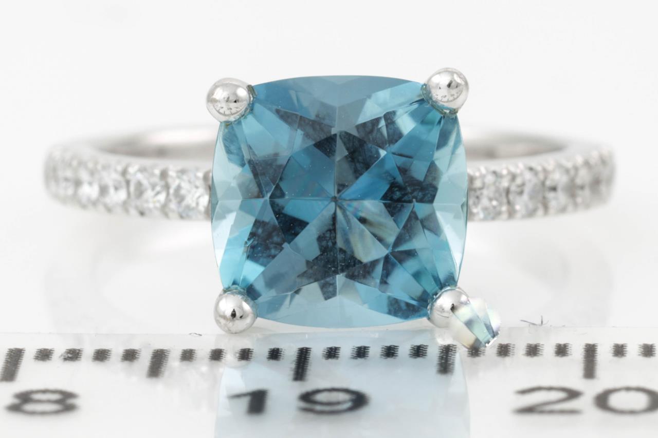 Aquamarine and Diamond Ring with 2.47ct square cushion cut aquamarine (with GSL Gemstone report #AA64674/1) and round Diamonds totalling approximately 0.28cts. 18ct white gold. Ring size M. Weight 4.6g. (Pre-owned)