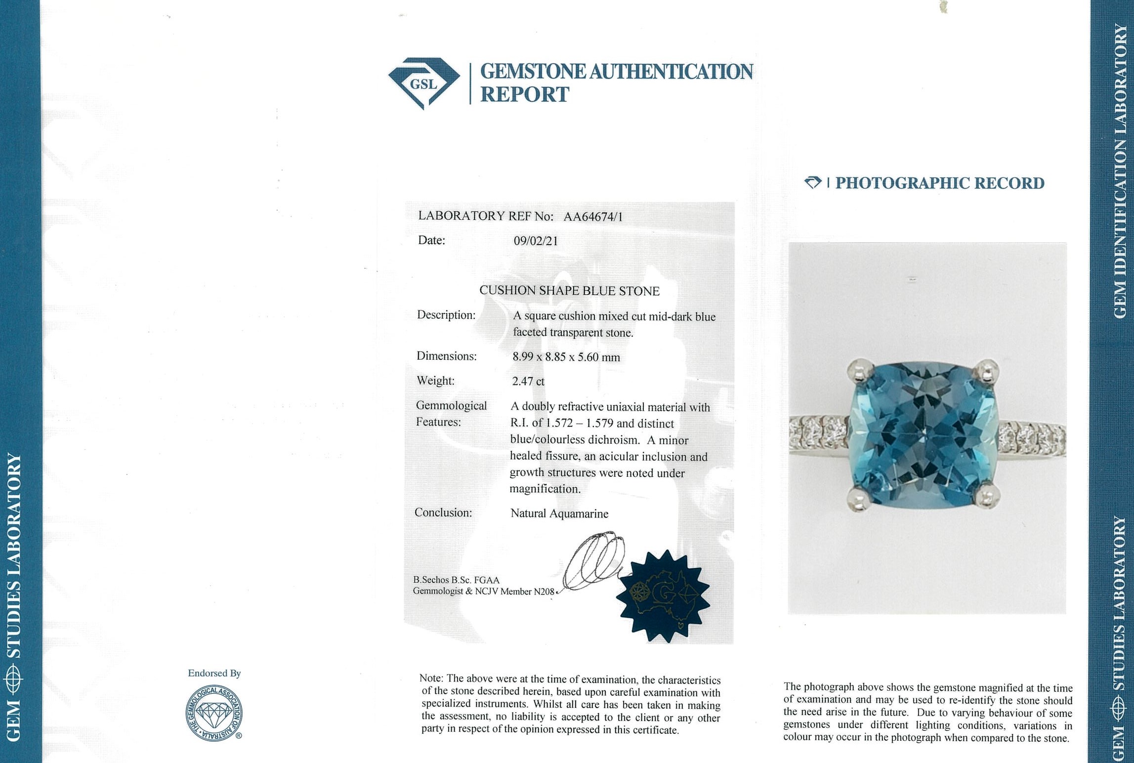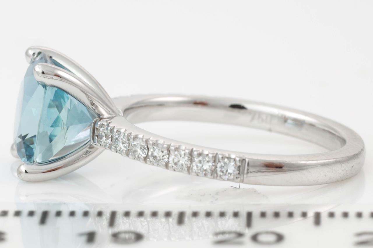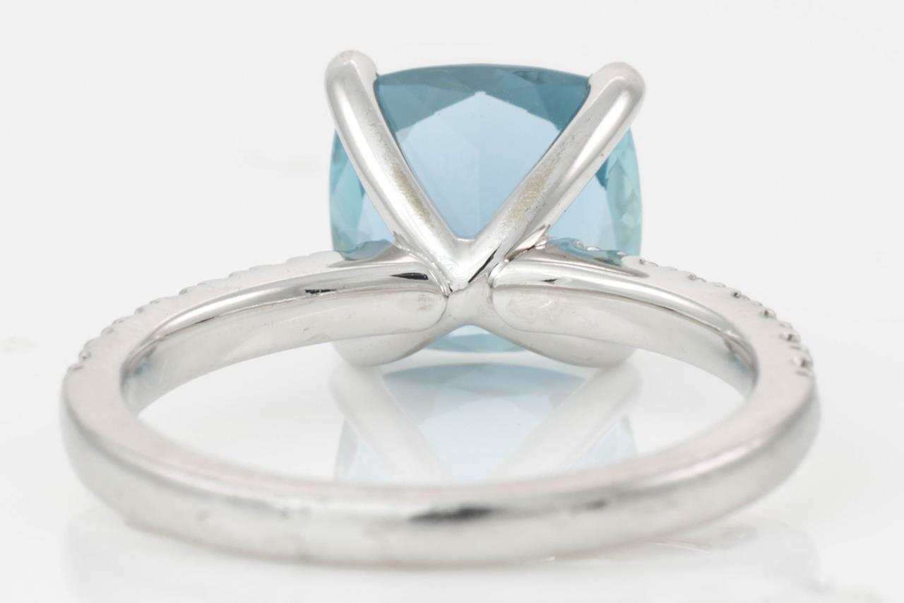 Aquamarine and Diamond Ring with 2.47ct square cushion cut aquamarine (with GSL Gemstone report #AA64674/1) and round Diamonds totalling approximately 0.28cts. 18ct white gold. Ring size M. Weight 4.6g. (Pre-owned)