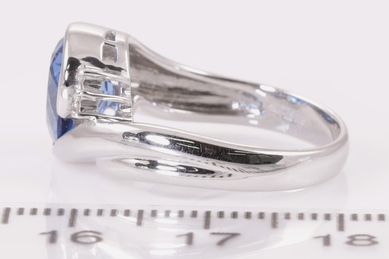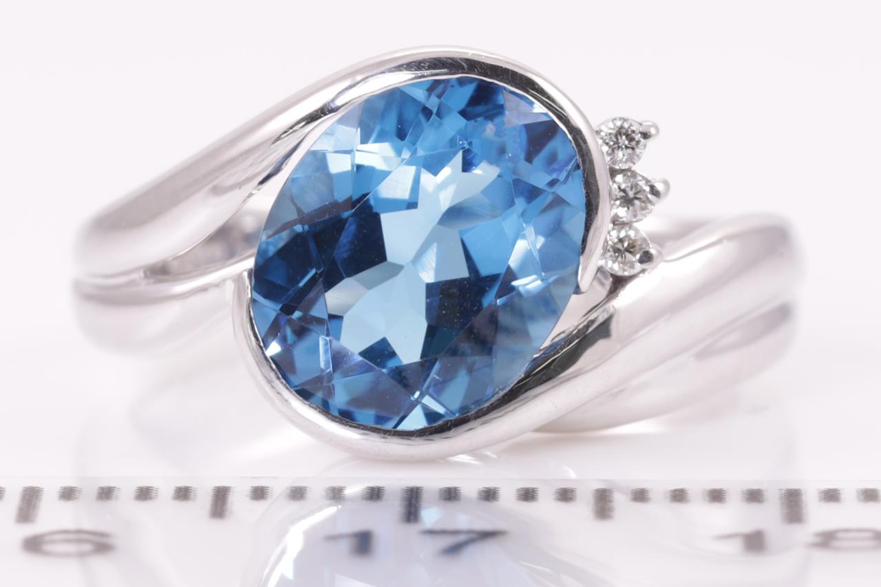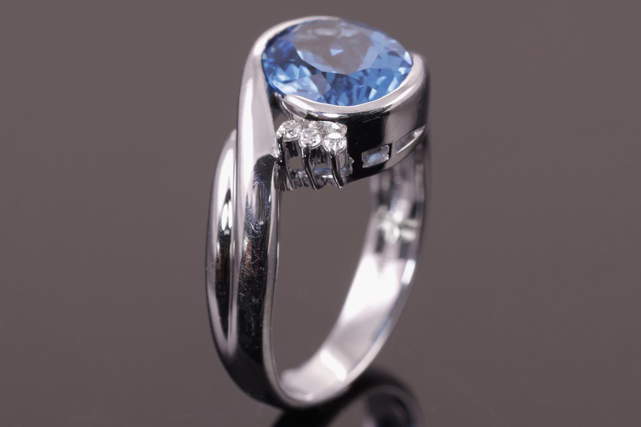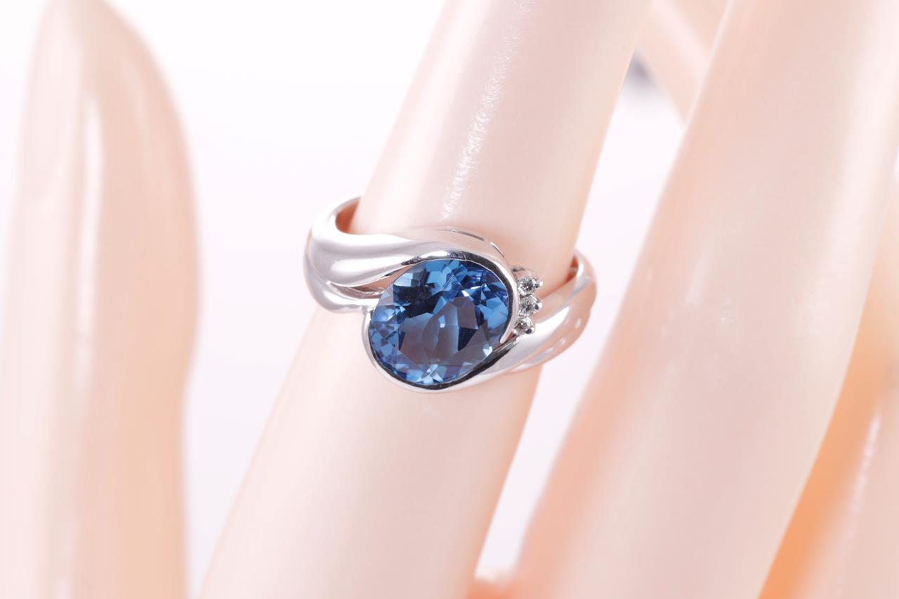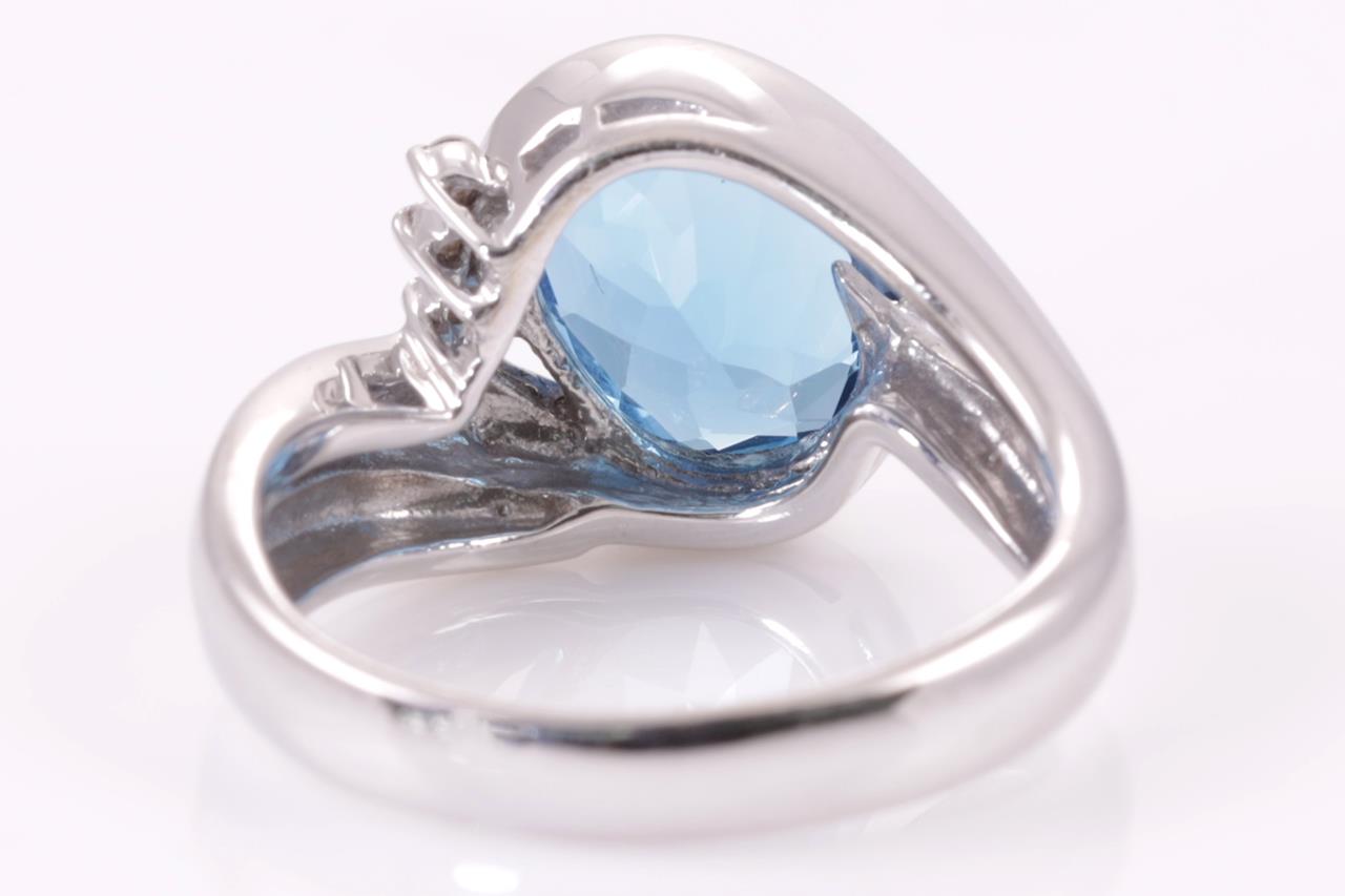 Aquamarine and Diamond Ring with oval cut Aquamarine of 2.16ct and Diamonds totalling 0.23ct. Platinum. Ring size K. Weight: 7.4g (Pre-owned)