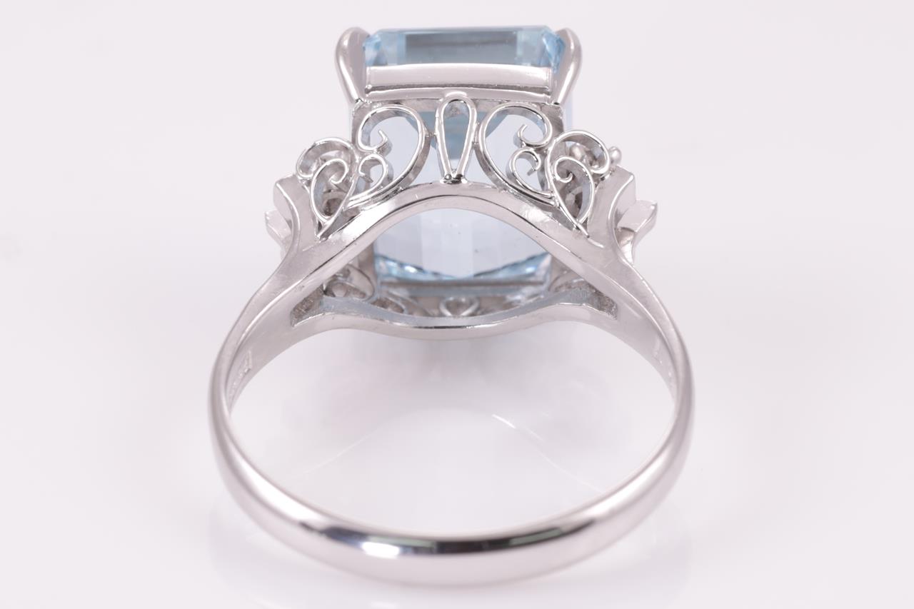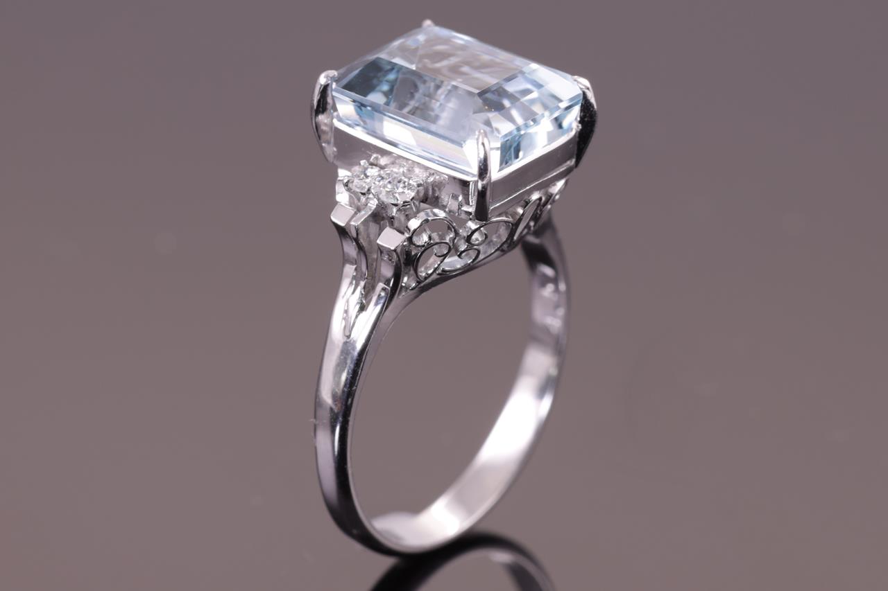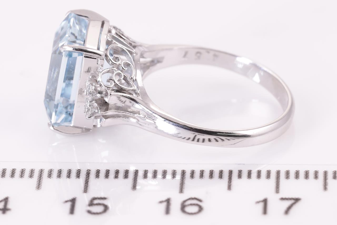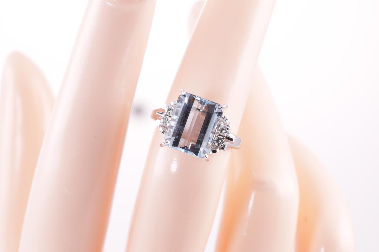 Aquamarine and Diamond Ring with emerald cut Aquamarine of 4.57ct and round Diamonds totalling 0.10cts. Platinum. Ring size L. Weight: 5.1g (Pre-owned)