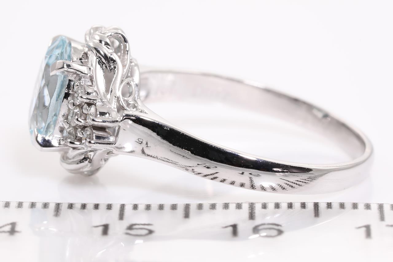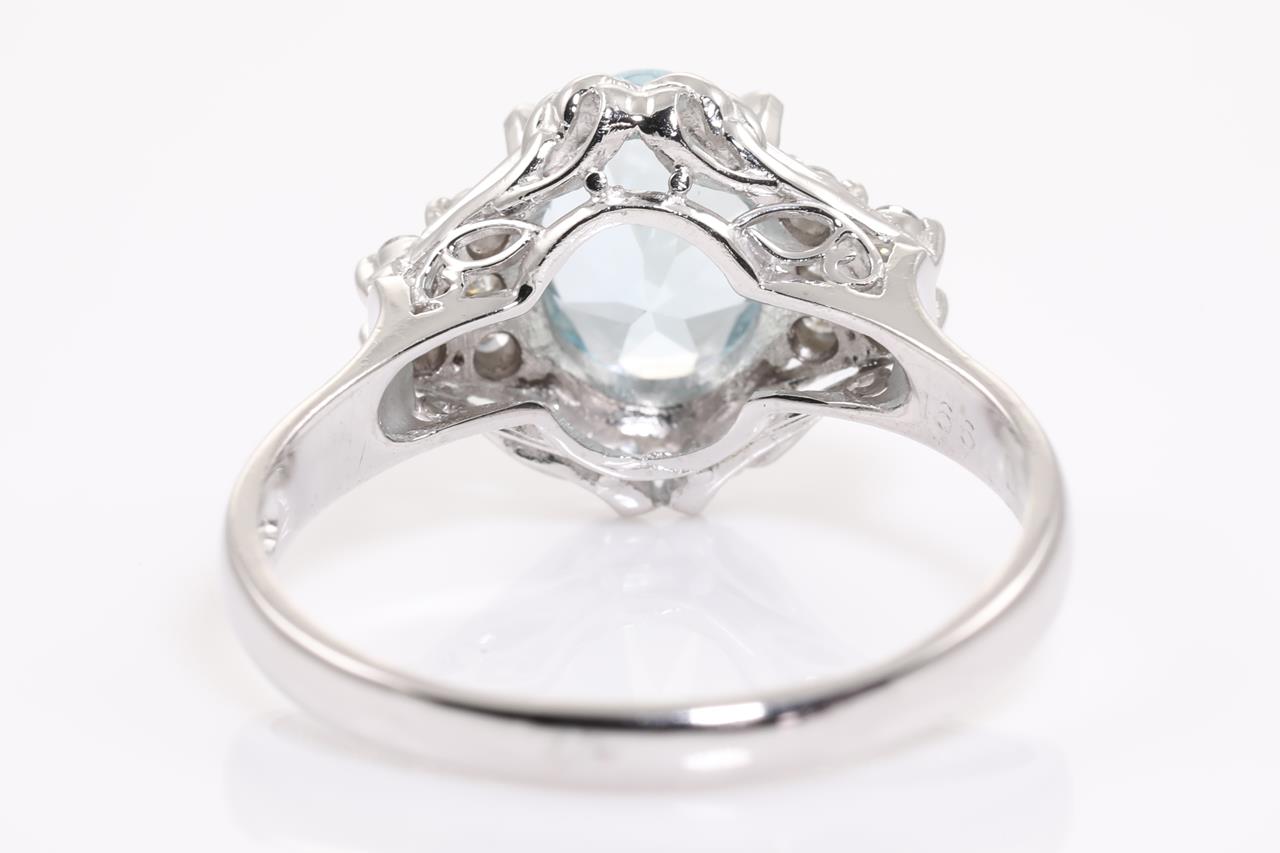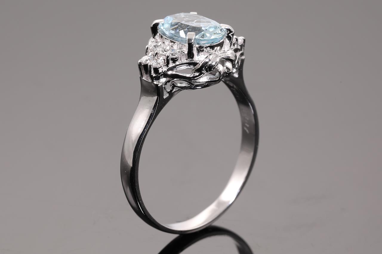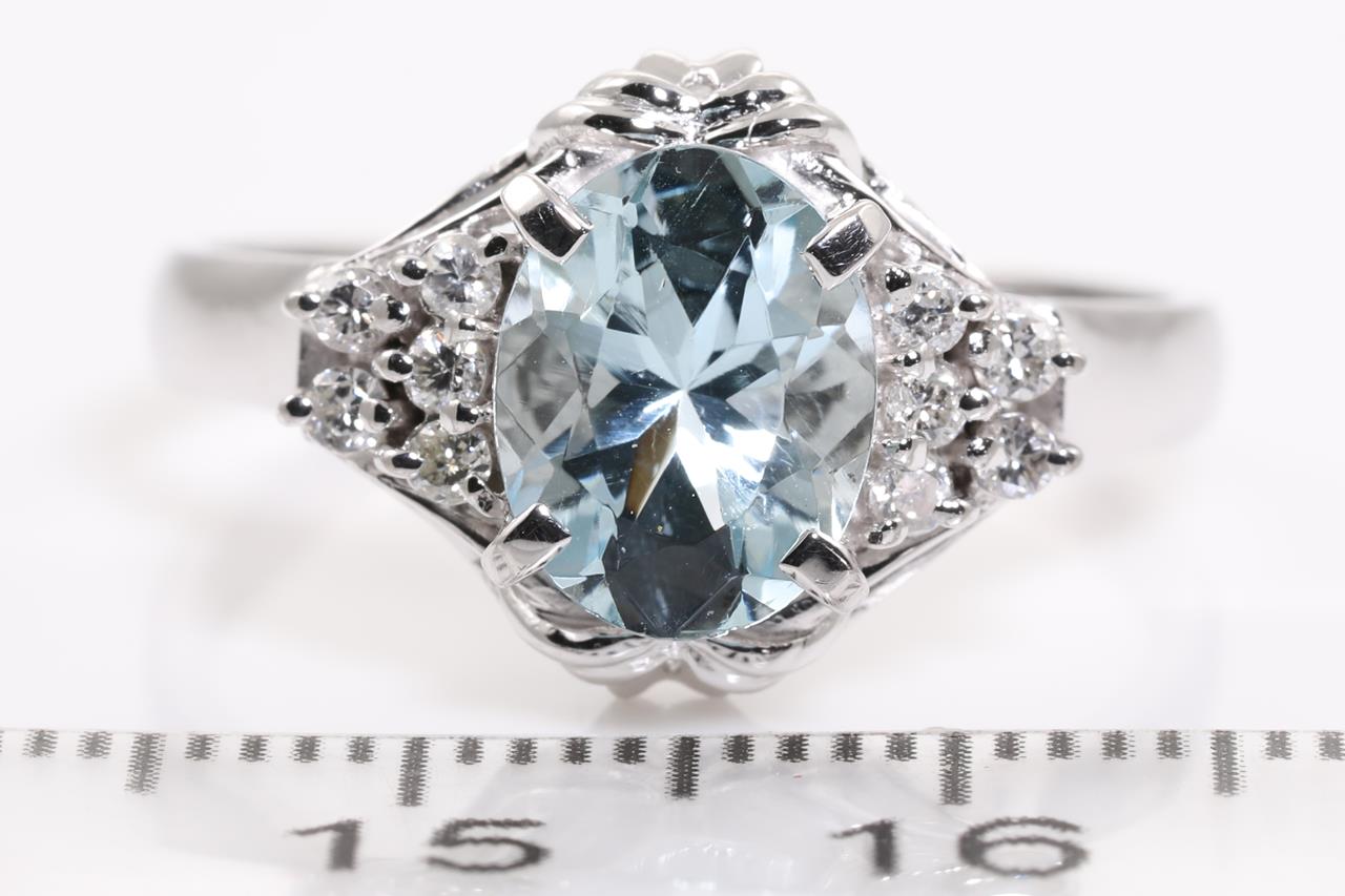 Aquamarine and Diamond ring with centre oval cut Aquamarine of 1.66ct and round Diamonds totalling 0.17cts. Platinum. Ring size: R. Weight: 5.4g. (Pre-owned)