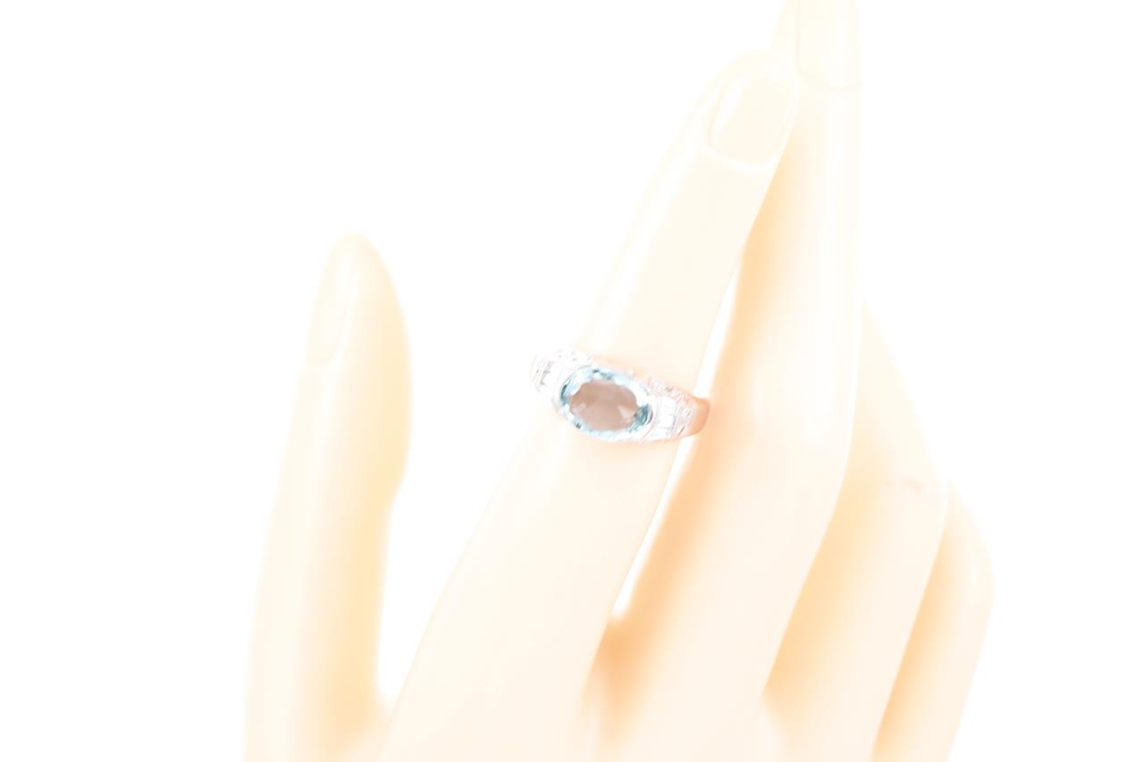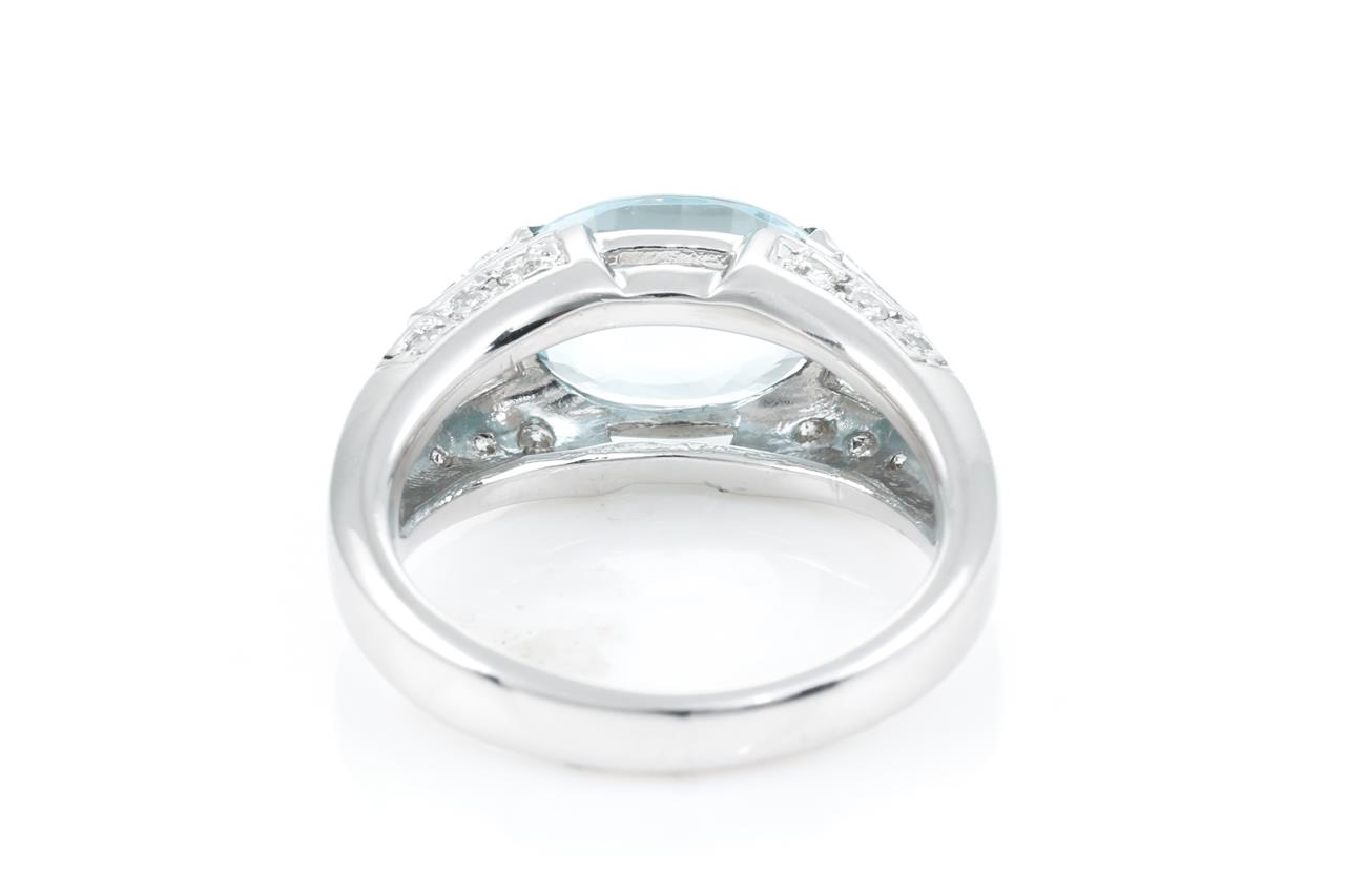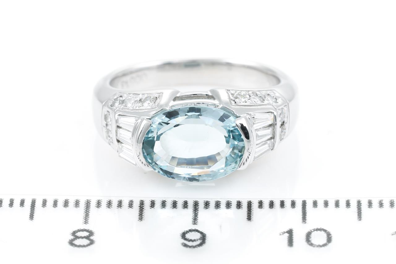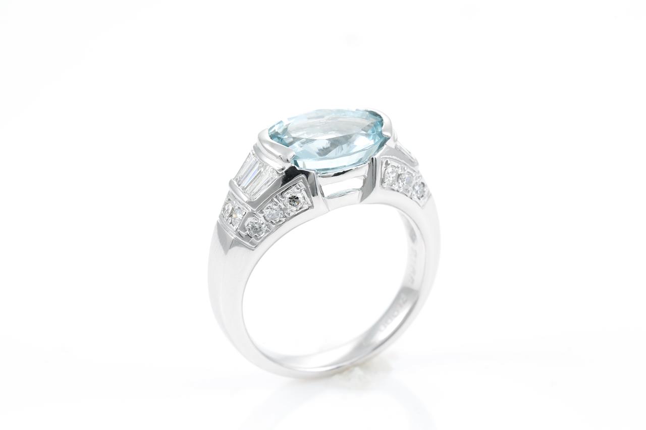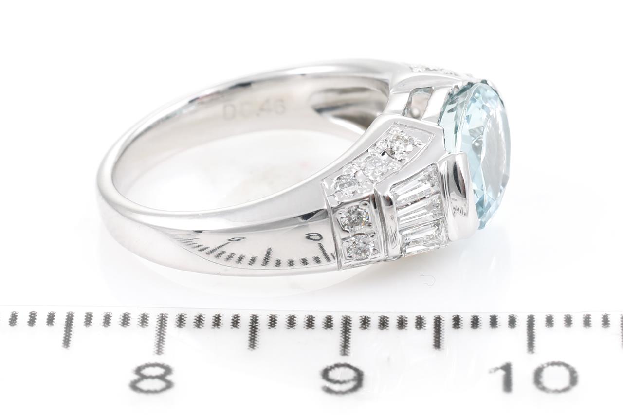 Aquamarine and Diamond ring with centre oval cut Aquamarine of 2.15ct and surrounding round and baguette cut Diamonds totalling 0.46cts (Estimated grading: G-H VS-SI). Platinum. Ring size: I1/2. Weight: 7.6g. (Pre-owned)