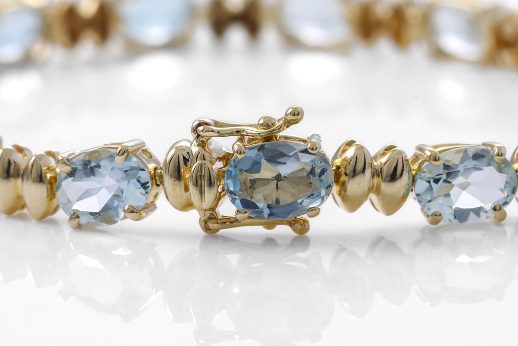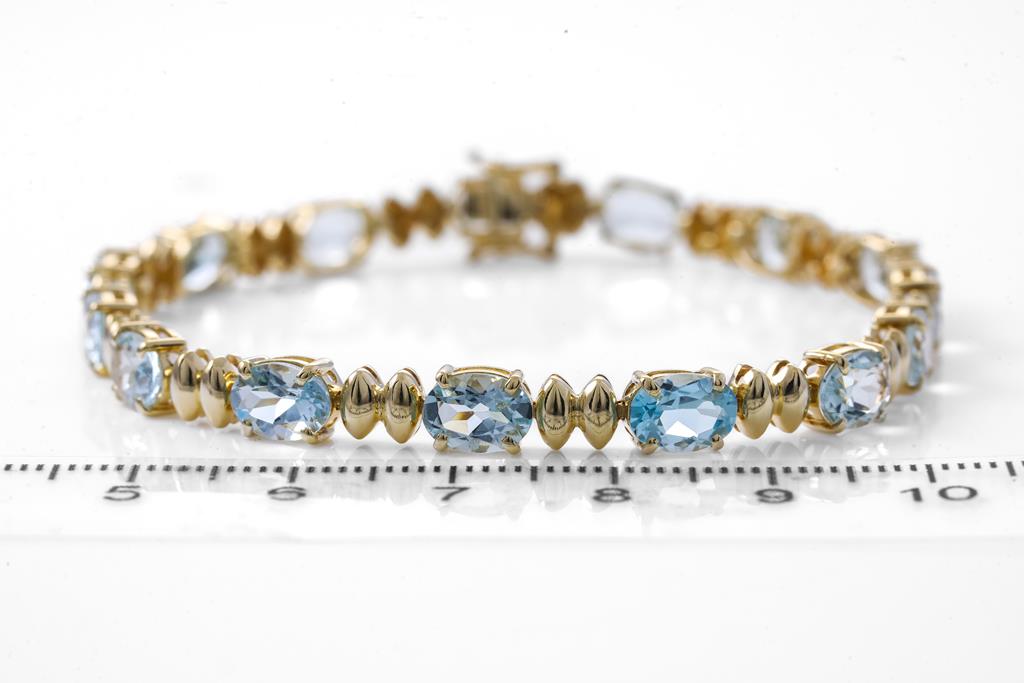 Aquamarine bracelet with 15 oval Aquamarine totalling approximately 9.75cts. 14ct yellow gold. Length: 19.5cm. Weight: 10.8g. (Pre-owned)