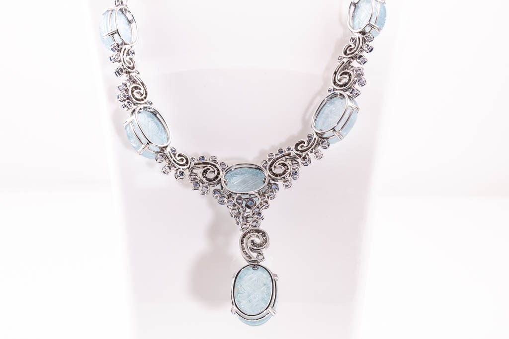 Aquamarine, Sapphire and Diamond necklace with oval shape Aquamarine totalling 82.40ct, round shape Sapphires totalling 6.95cts and round shape Diamonds totalling 1.13cts. 18ct white gold with 44cm chain. Weight: 55.6g. With Certificate (Pre-owned)