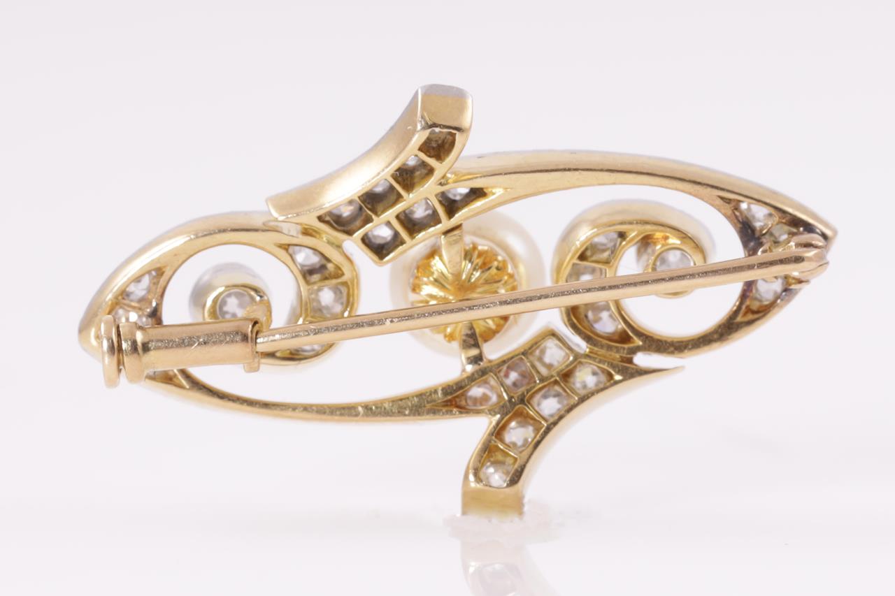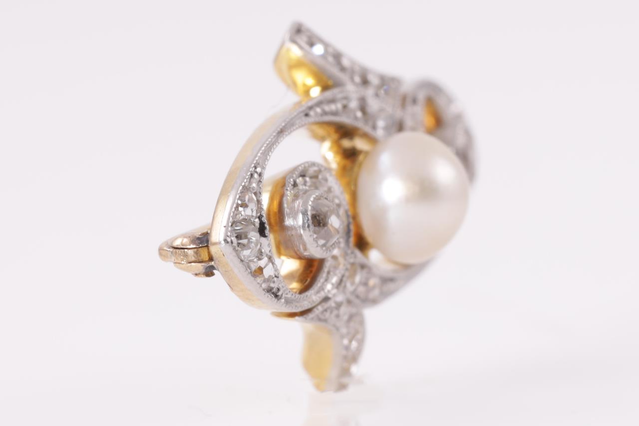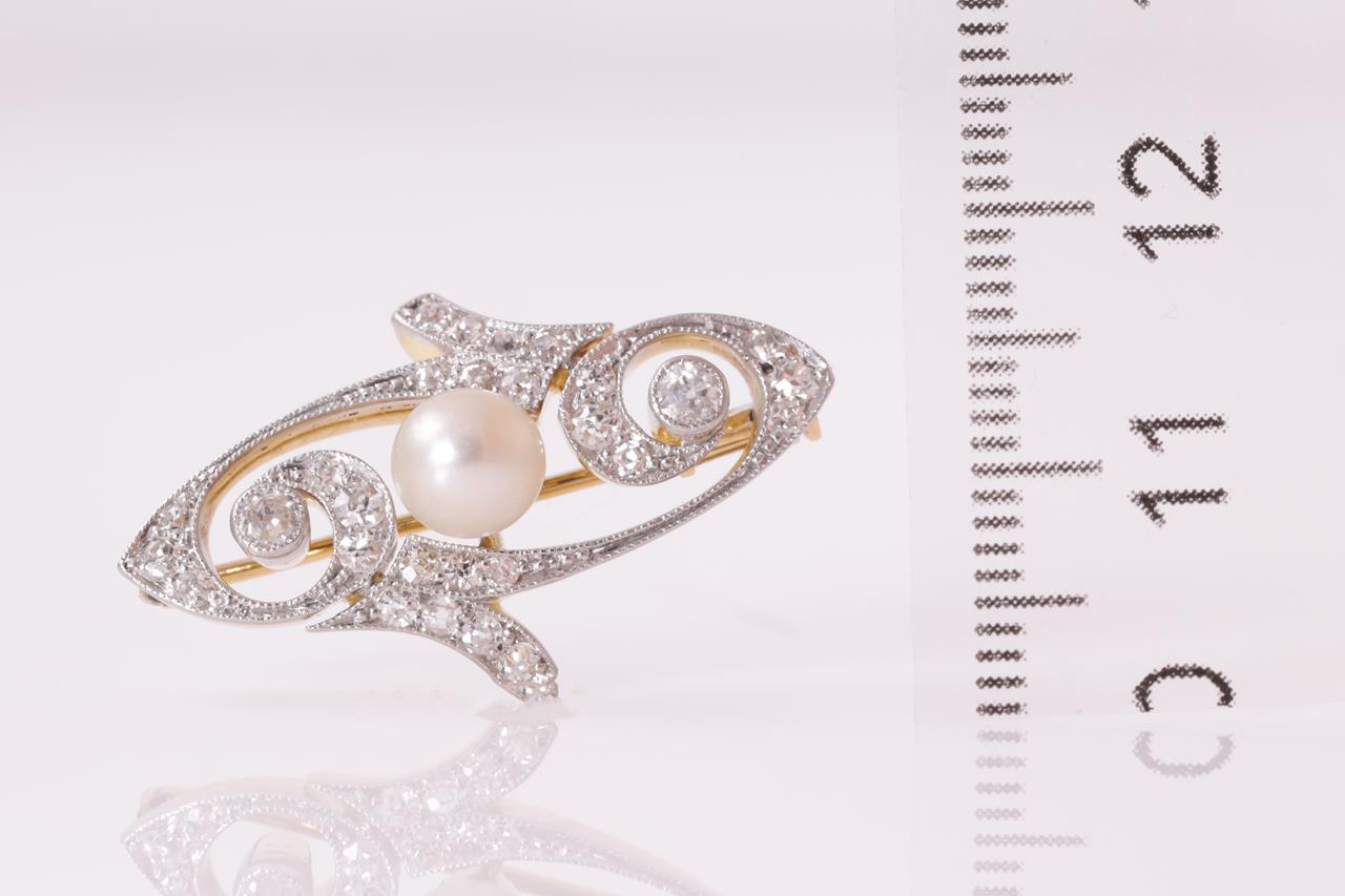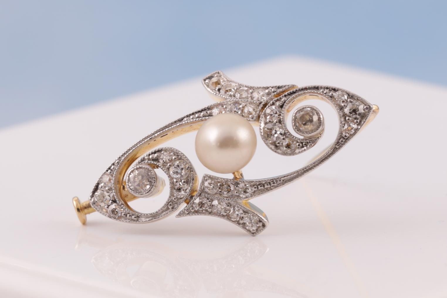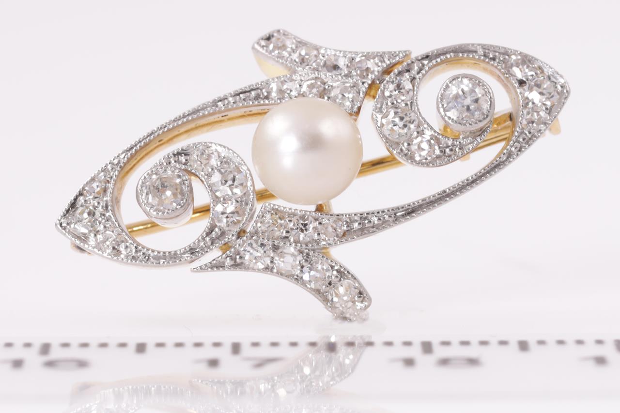 Art Nouveau Diamond and Pearl Brooch with round Diamonds totalling approximately 0.40cts (estimated grading TBA) and button shaped culteured Pearl of 5.7mm. 18ct yellow gold and platinum - acid tested, not stamped. Length 3.7mm. Weight 4.6g. (Pre-owned)