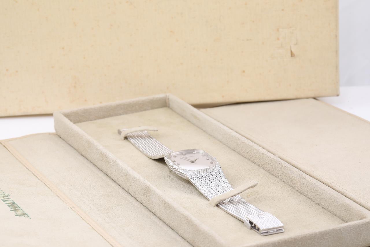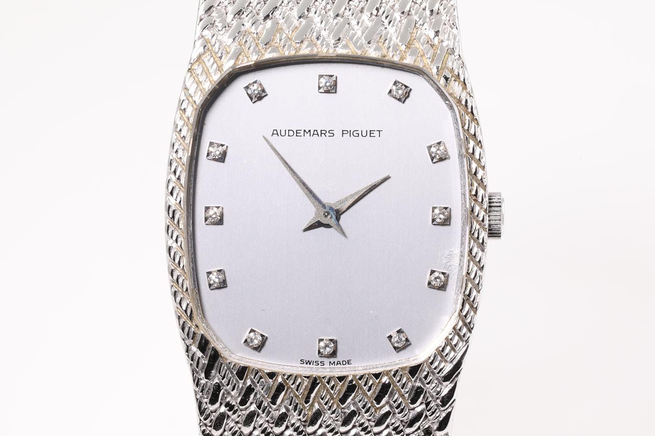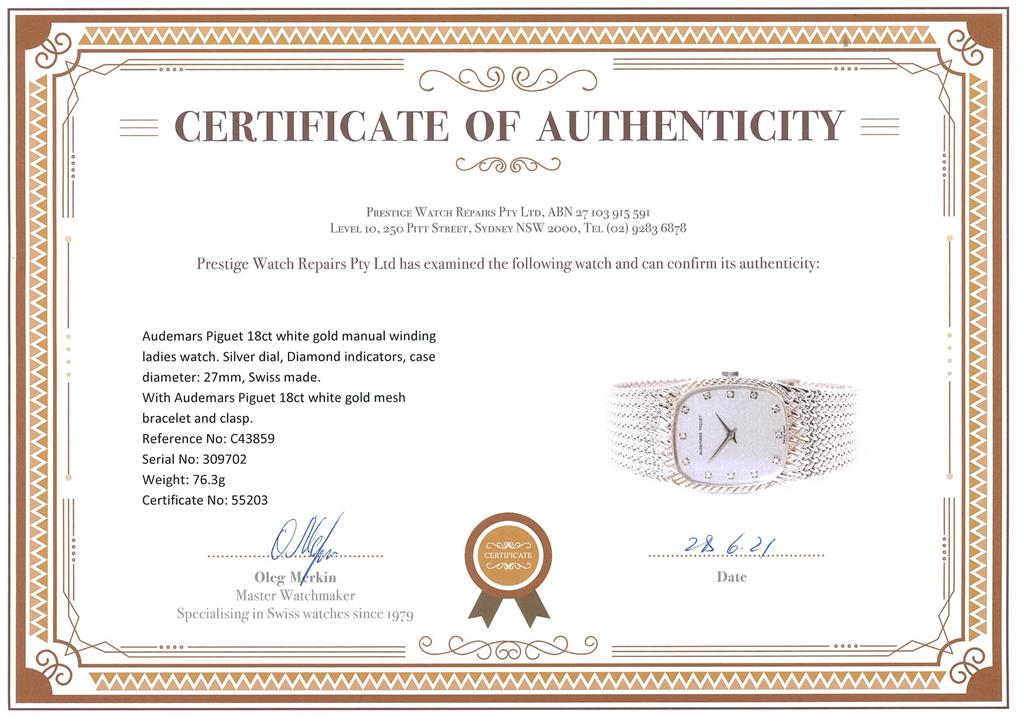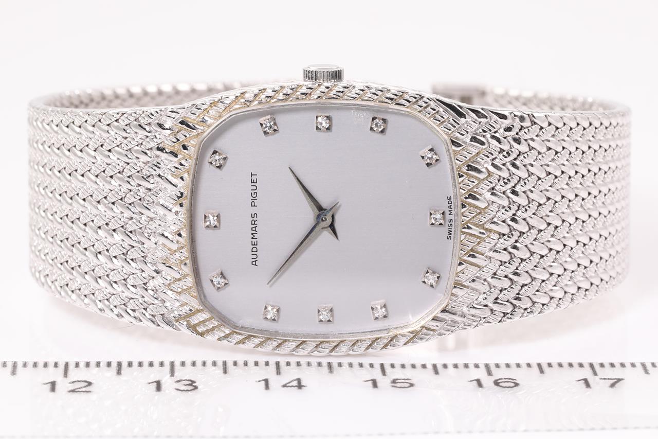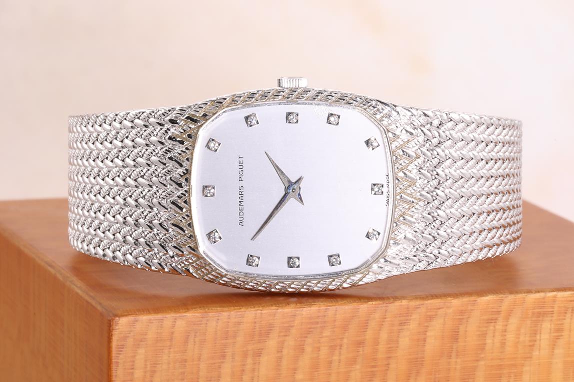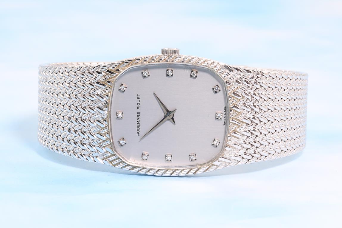 Audemars Piguet 18ct white gold manual winding ladies watch. Silver dial, Diamond indicators, case diameter: 27mm, wrist size: 16cm, Swiss made. Ref #C43859. With Audemars Piguet 18ct white gold bracelet and clasp. With certificate of authenticity and Audemars Piguet box. 6 month watchmaker warranty from the date of full service. (Pre-owned)