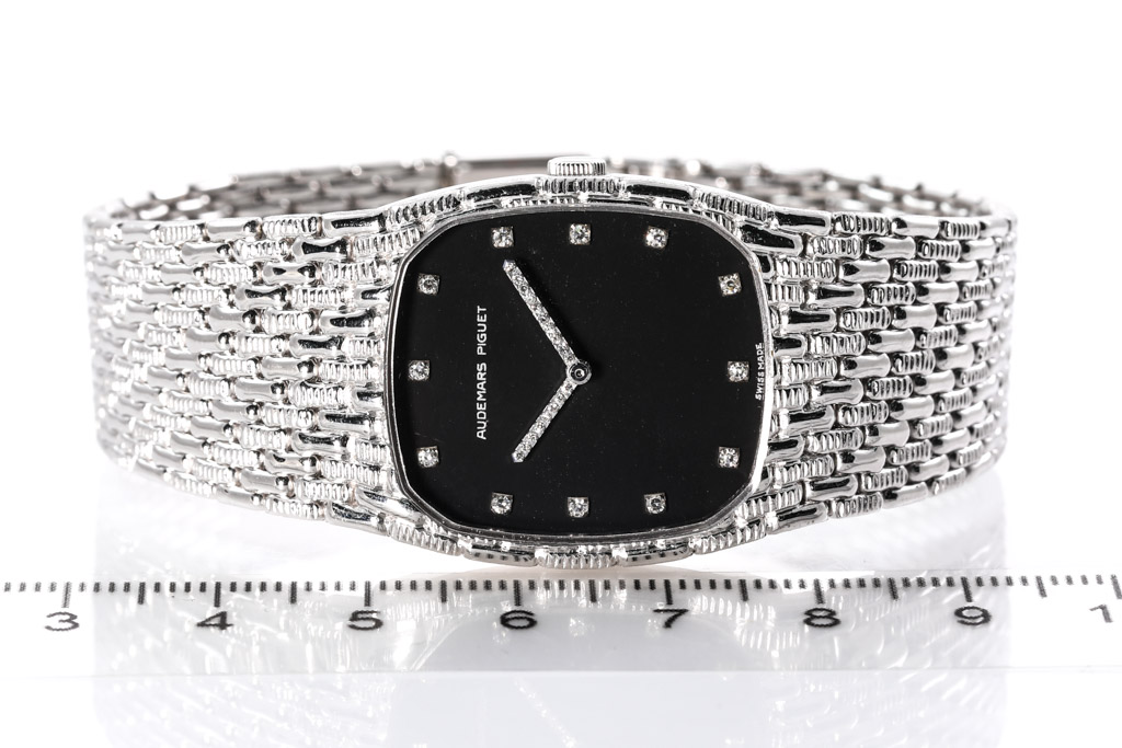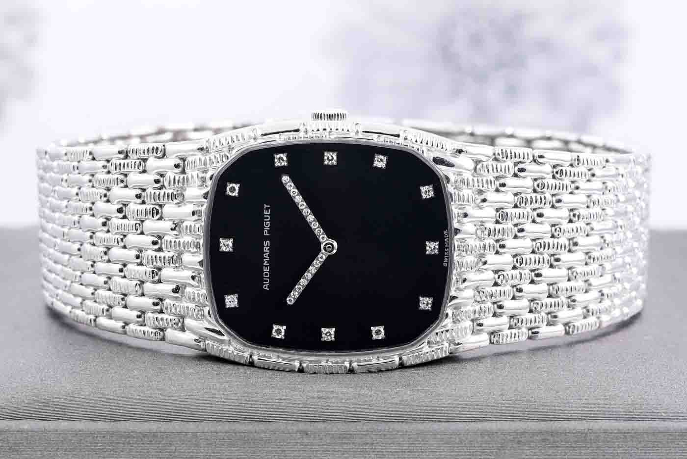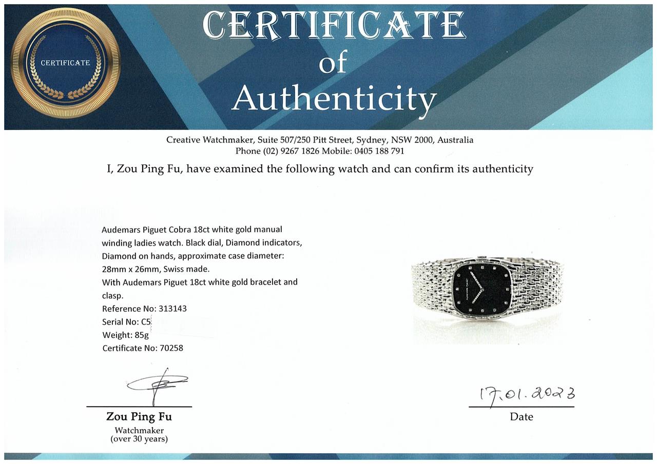 Audemars Piguet Cobra 18ct white gold manual winding ladies watch. Black dial, Diamond indicators, Diamond on hands, approximate case diameter: 28mm x 26mm, wrist size: 16.5cm, Swiss made. Ref# 313143. With Audemars Piguet 18ct white gold bracelet and clasp. With Certificate of Authenticity and Audemars Piguet. 3 month FSA warranty (Pre-owned)