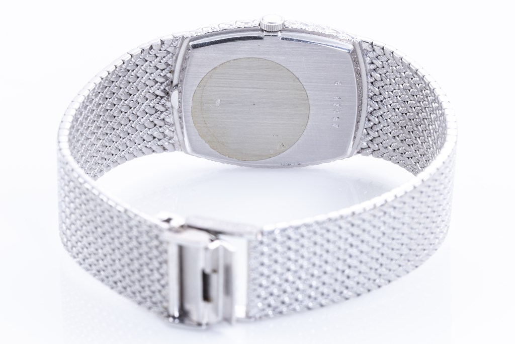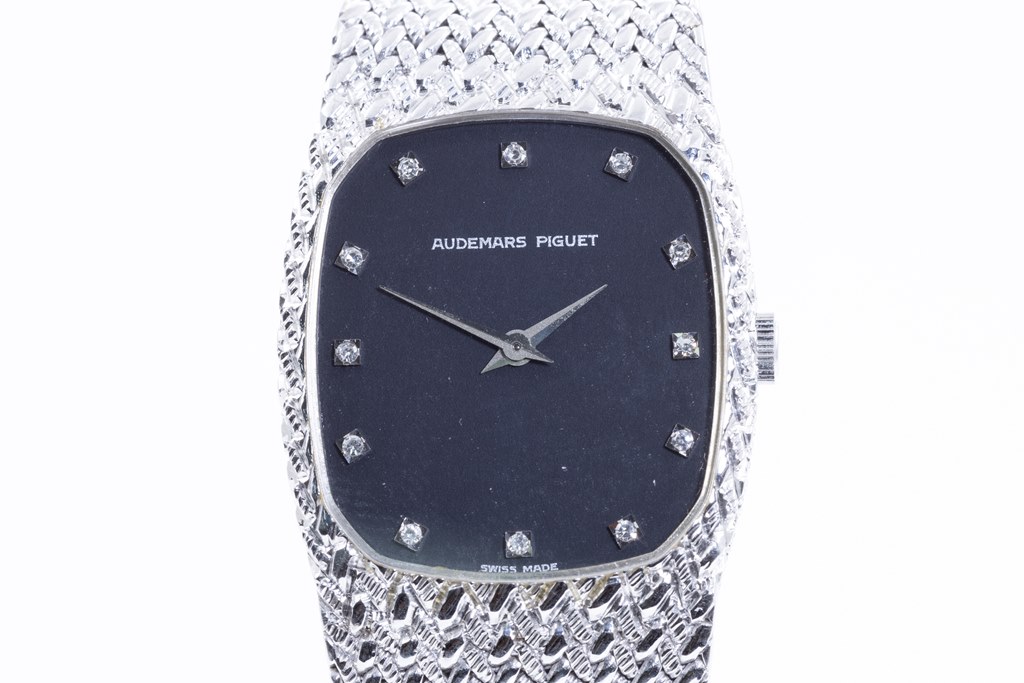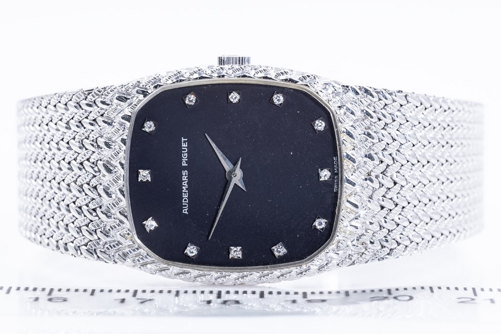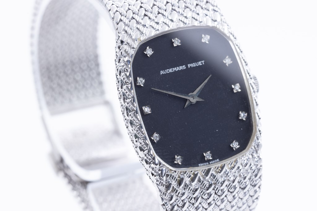 Audemars Piguet Cobra 18ct white gold manual winding watch. Black dial, diamond indicators, case diameter: 27mm, wrist size: 17.5cm, Swiss made. Ref# 587. With Audemars Piguet 18ct white gold bracelet and clasp. With Certificate of Authenticity and 3 month FSA warranty. (Pre-owned)