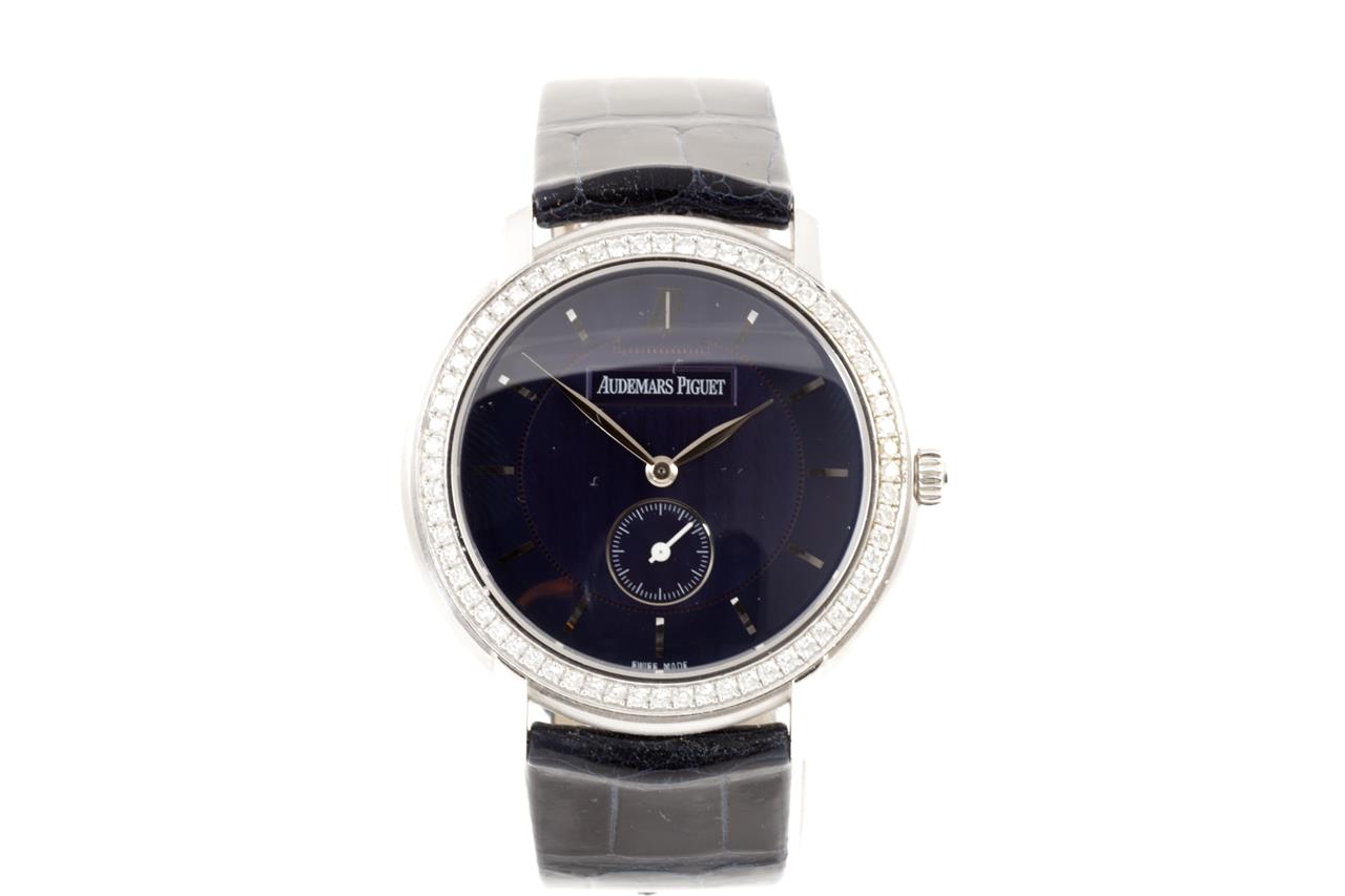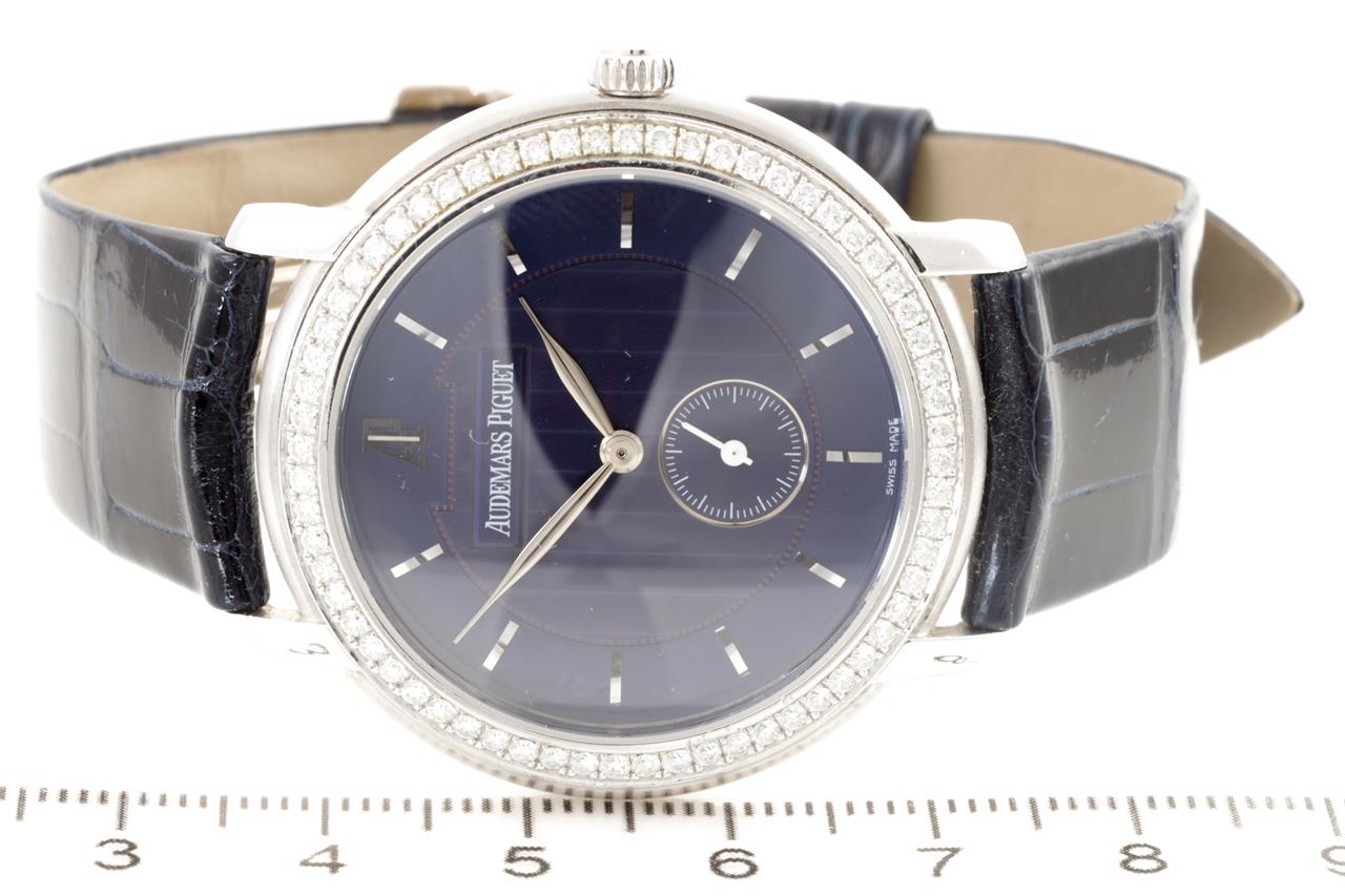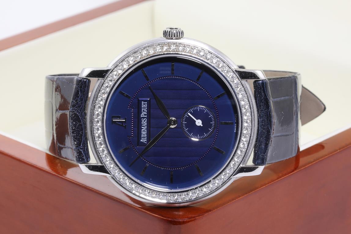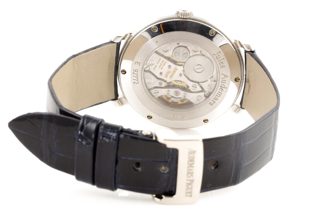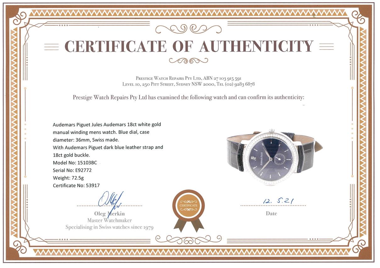 Audemars Piguet Jules Audemars 18ct white gold manual winding mens watch. Blue dial, case diameter: 36mm, length: 20cm, Swiss made. Ref# 15103BC. With Audemars Piguet dark blue leather strap and 18ct gold buckle. With Certificate of Authenticity, invoice for new strap dated 10/06/2021 and Audemars Piguet box. 3 month FSA warranty. (Pre-owned)
