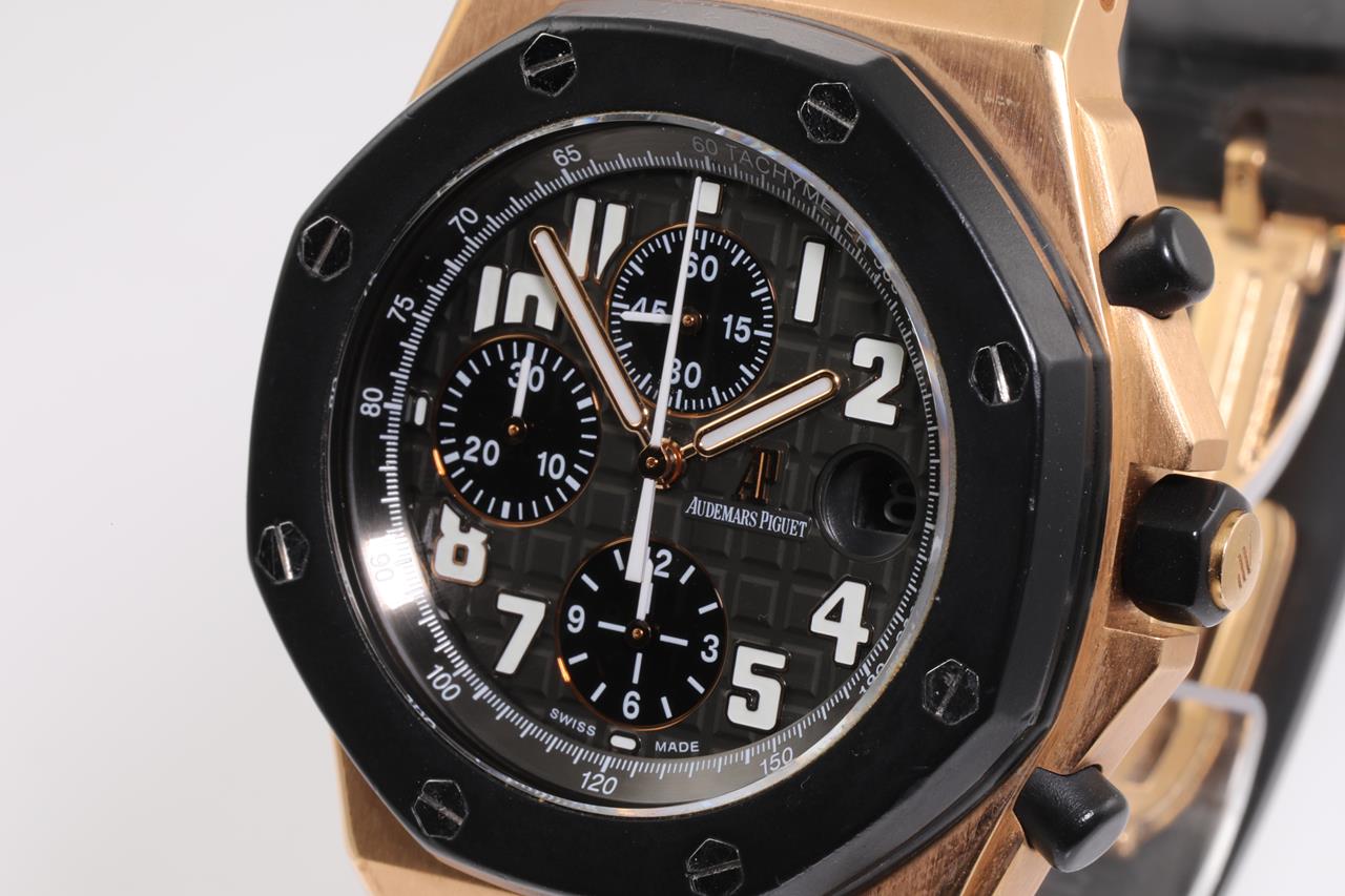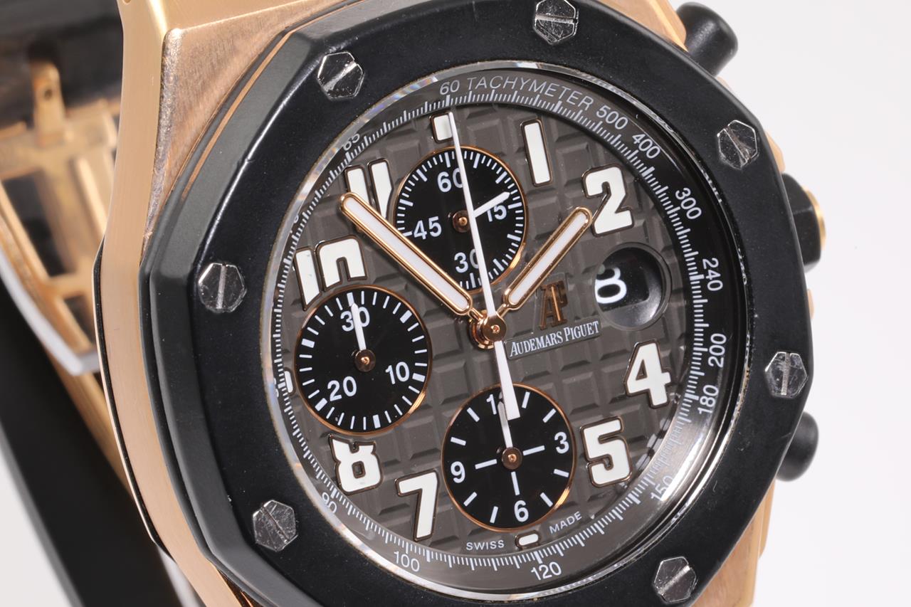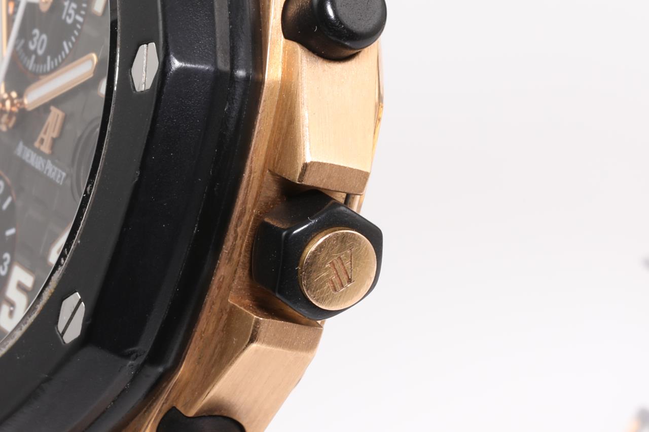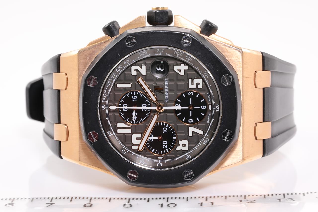 Audemars Piguet Royal Oak Offshore 18ct rose gold and ceramic automatic mens watch. Black chronograph dial, date, case diameter: 44mm, wrist size: 18cm (adjustable), Swiss made. Ref# 26401RO.OO.A002CA.02. With Audemars Piguet black rubber strap and 18ct clasp. With certificate of authenticity. 3 month FSA warranty. (Pre-owned)