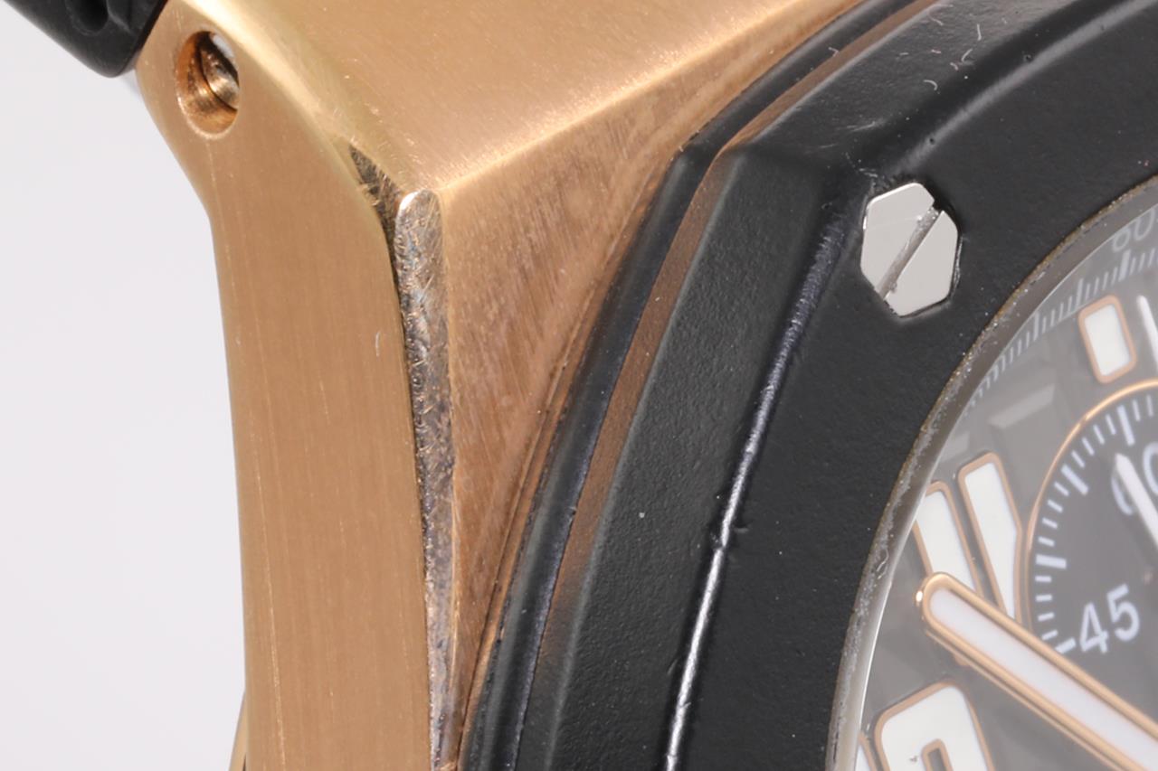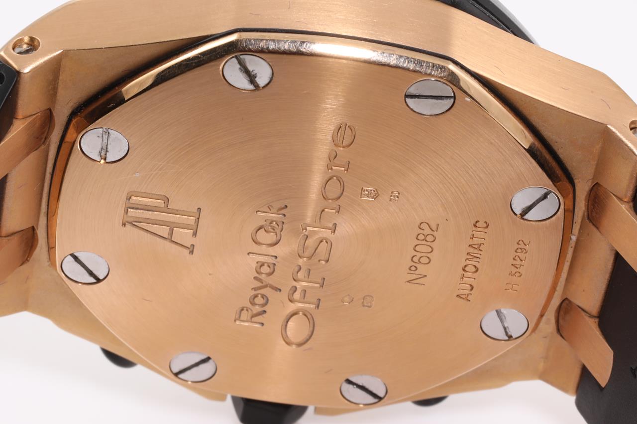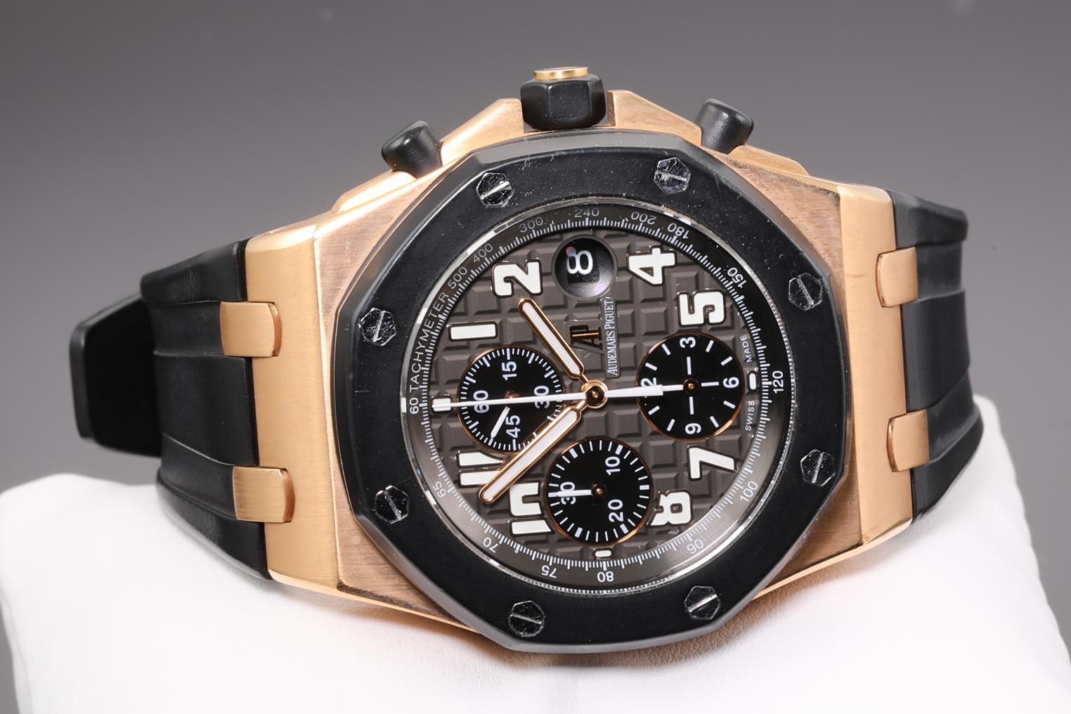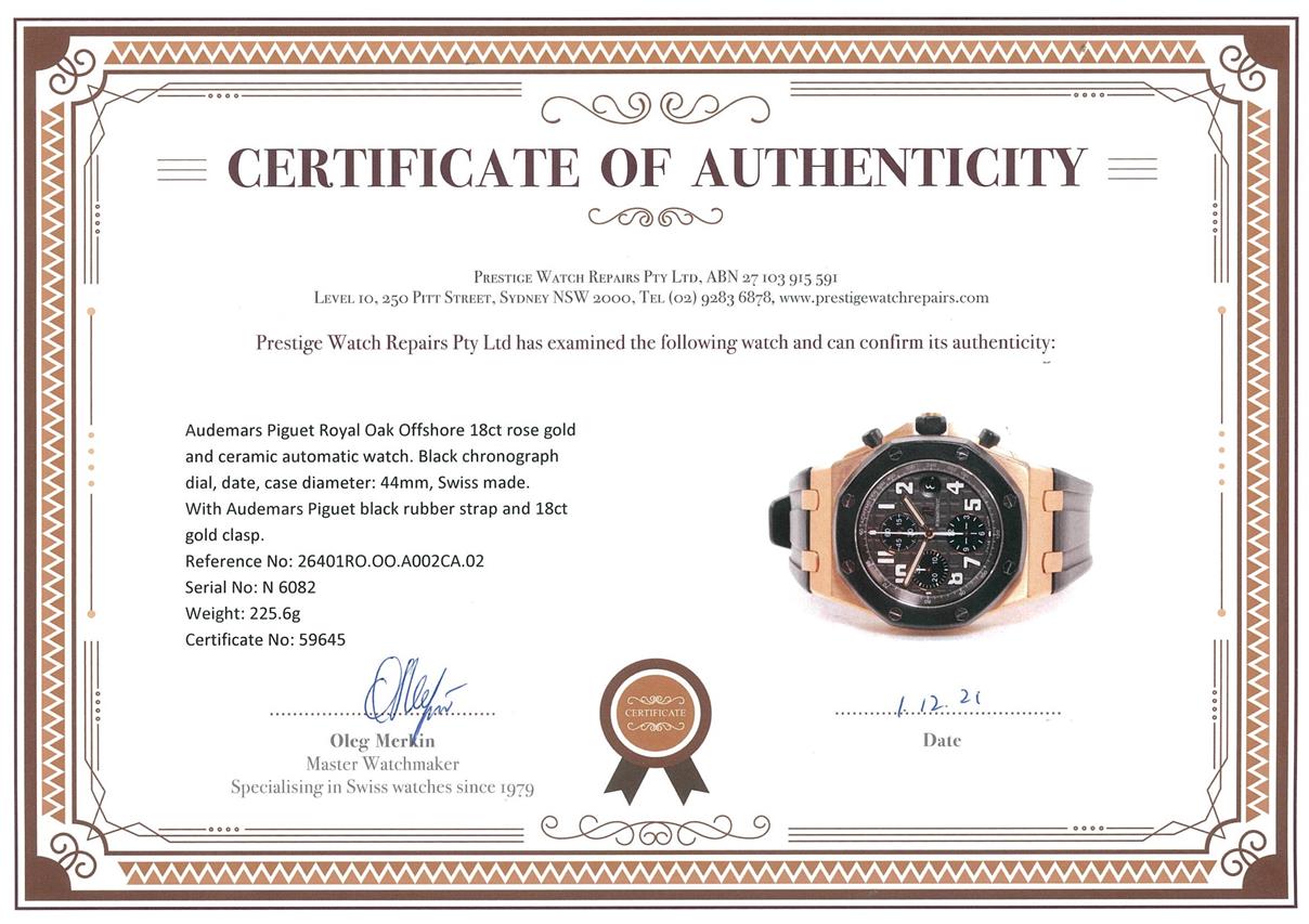 Audemars Piguet Royal Oak Offshore 18ct rose gold and ceramic automatic mens watch. Black chronograph dial, date, case diameter: 44mm, wrist size: 18cm (adjustable), Swiss made. Ref# 26401RO.OO.A002CA.02. With Audemars Piguet black rubber strap and 18ct clasp. With certificate of authenticity. 3 month FSA warranty. (Pre-owned)