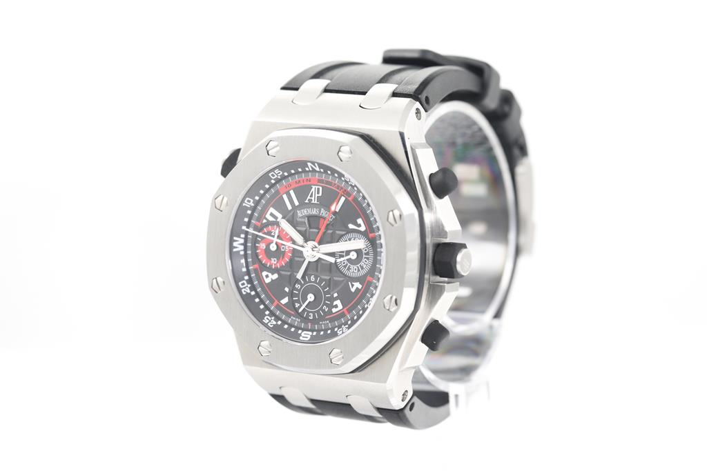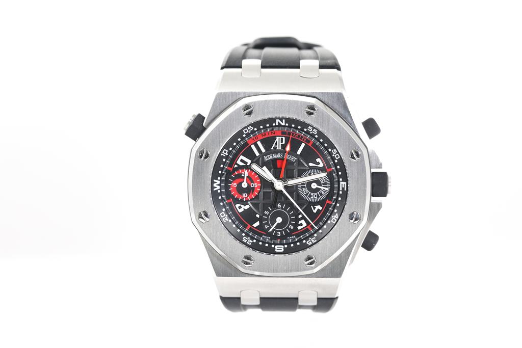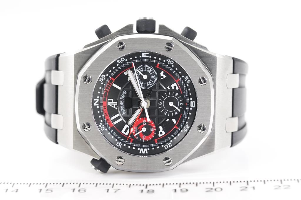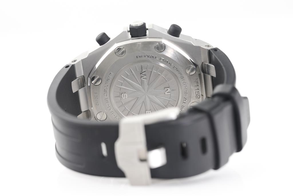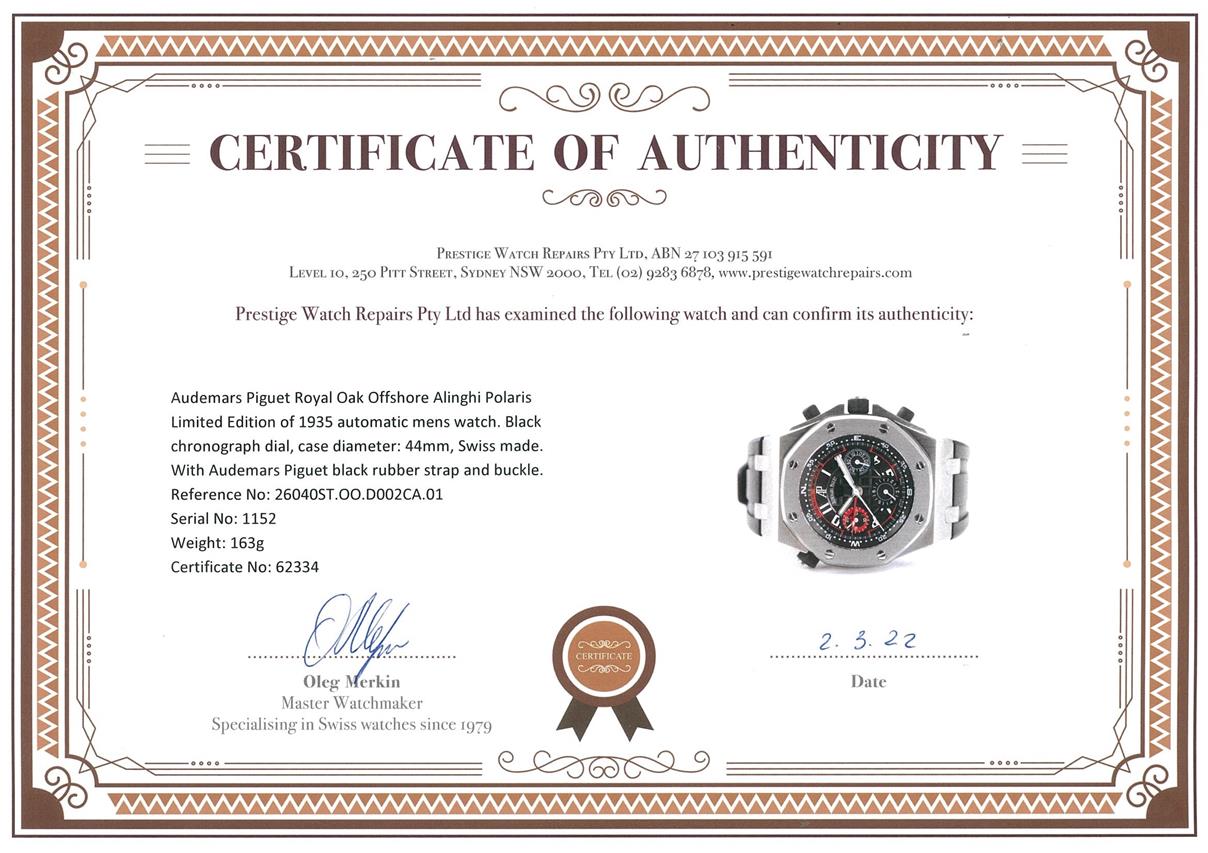Audemars Piguet Royal Oak Offshore Alinghi Polaris Limited Edition of 1935 automatic mens watch. Black chronograph dial, case diameter: 44mm, length: 21cm, Swiss made. Ref# 26040ST.OO.D002CA.01. With Audemars Piguet black rubber strap and buckle. With Certificate of Authenticity. 3 month FSA warranty. (Pre-owned)