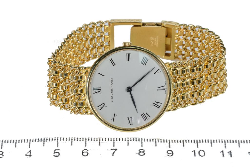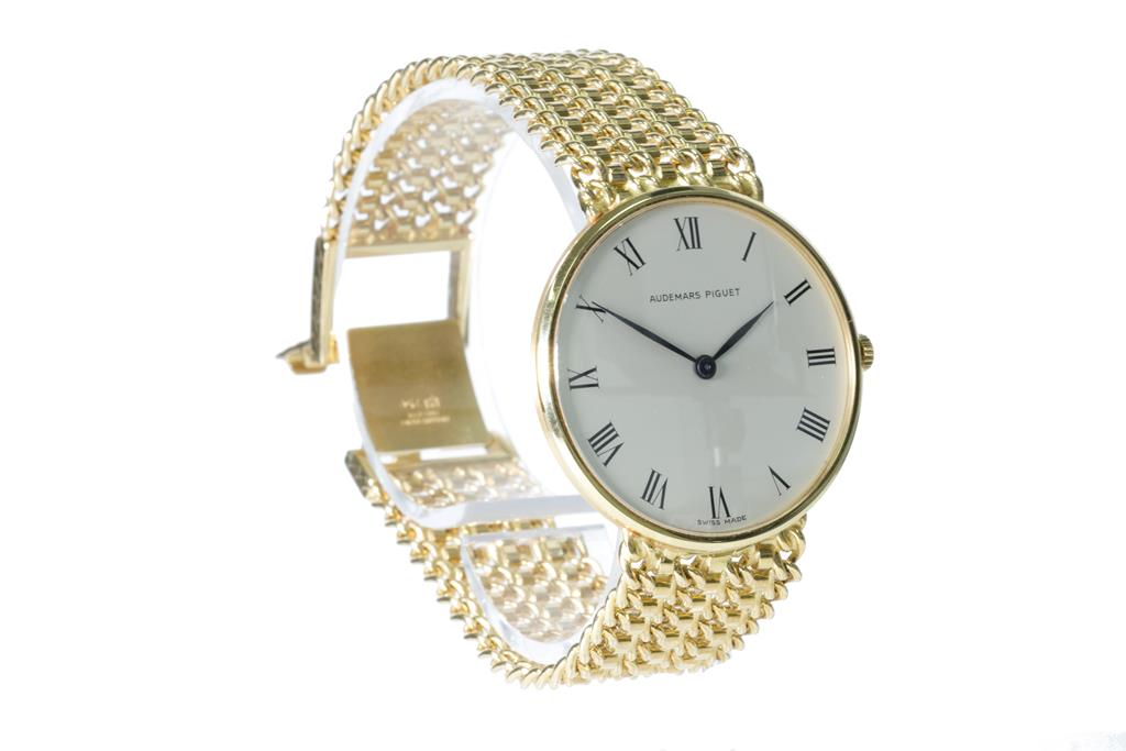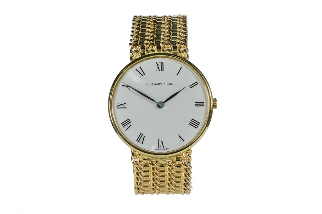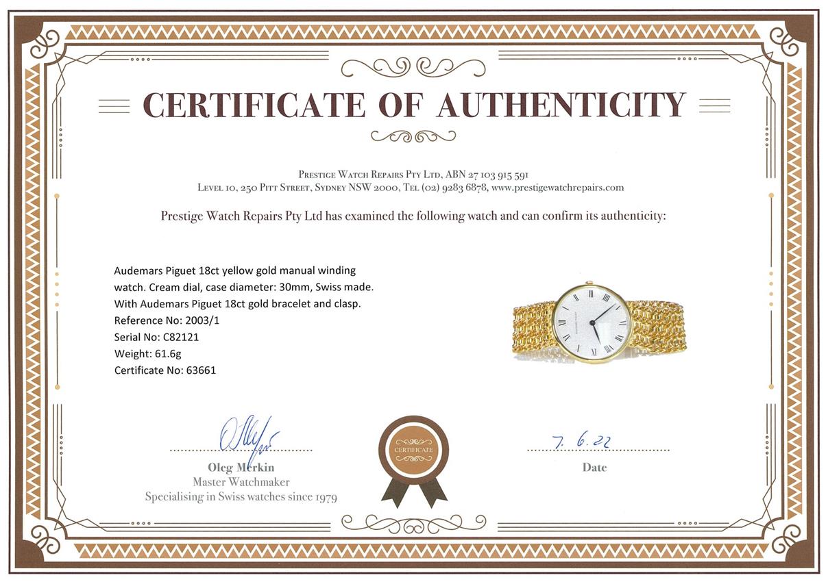 Audemars Piguet 18ct yellow gold manual winding watch. Cream dial, case diameter: 30mm, wrist size: 16cm, Swiss made. Ref# 2003/1. With Audemars Piguet 18ct yellow gold bracelet and clasp. With Certificate of Authenticity. 3 month FSA warranty. (Pre-owned)