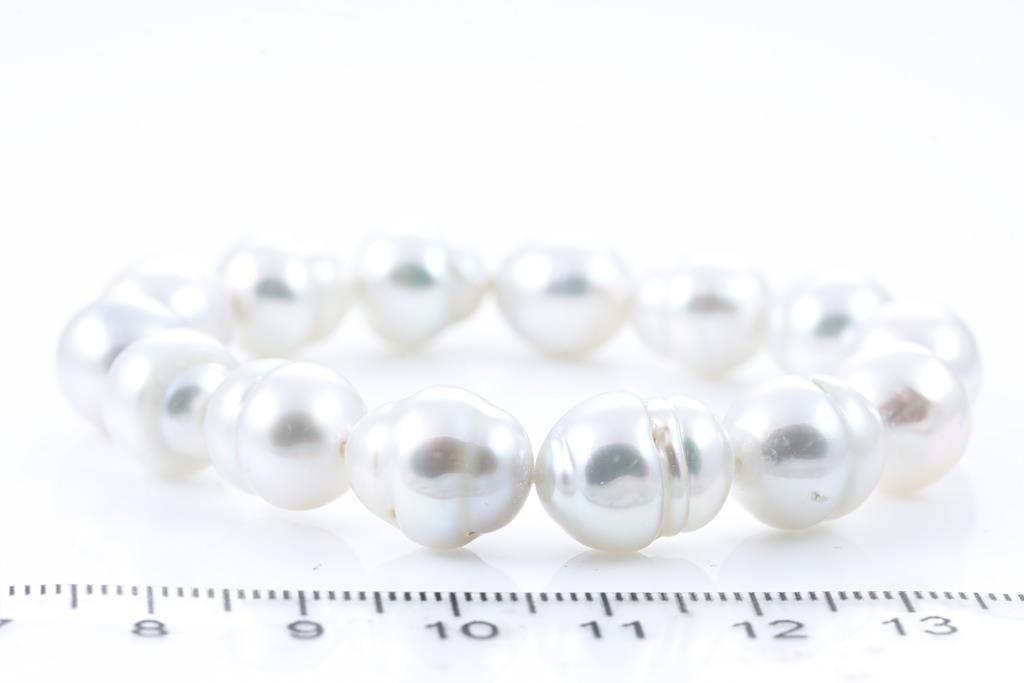 Pearl elasticated stretch bracelet with 14 silvery white Australian South Sea circle pearls of 10.9mm - 9.8mm. Length: 16cm. Weight: 23.4g. (New)