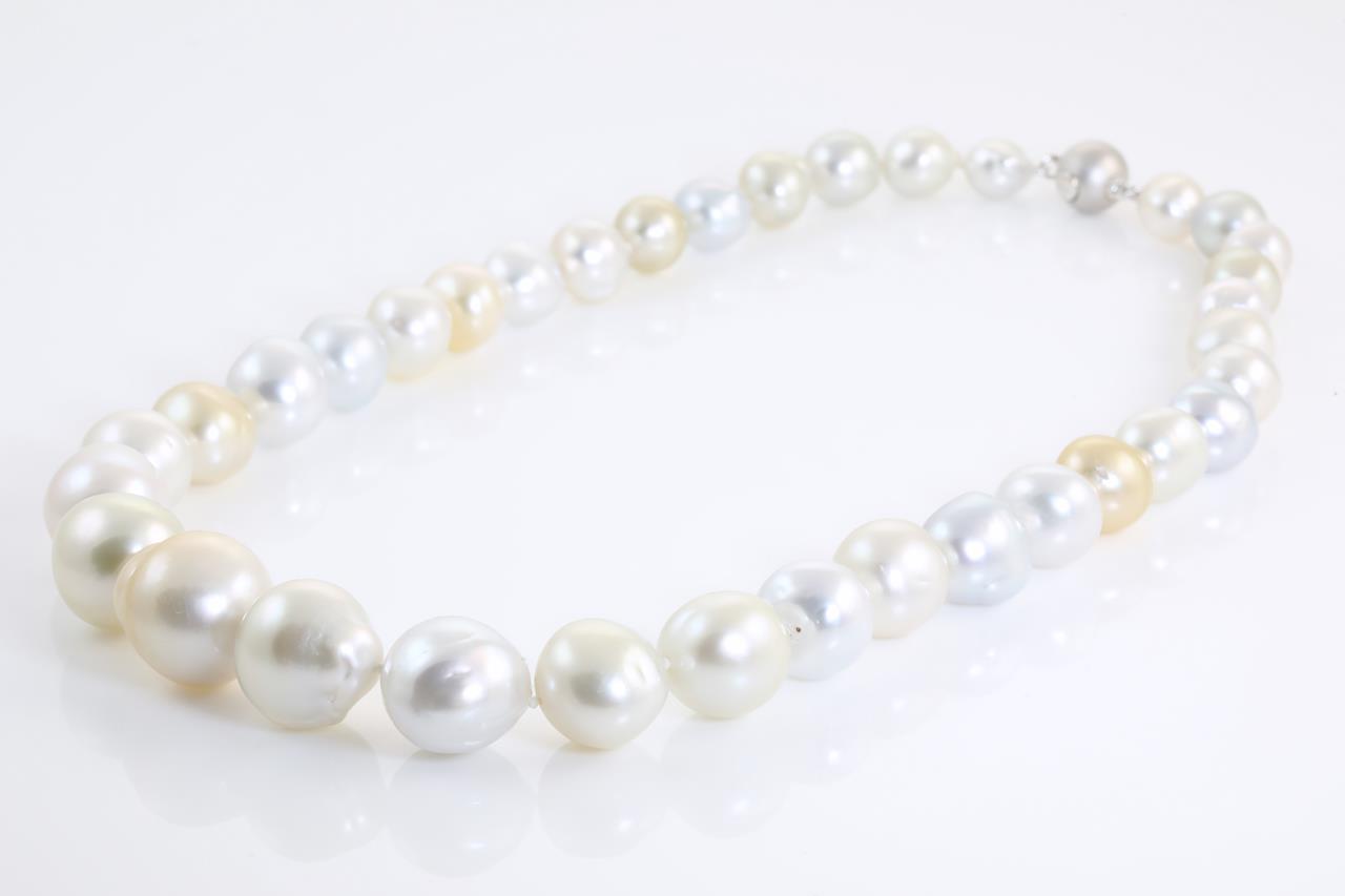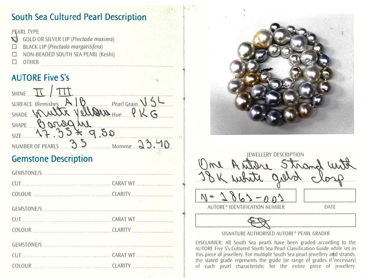 Autore pearl necklace with 35 mixed shade graduated South Sea Pearls of 9.5mm-17.3mm. With 18ct white gold Autore clasp. Length: 47cm. With Autore certificate #N-1861-001. (As New)
