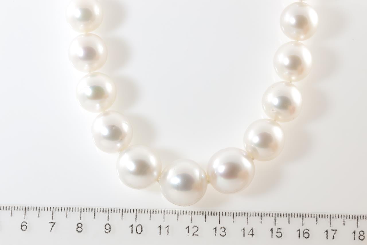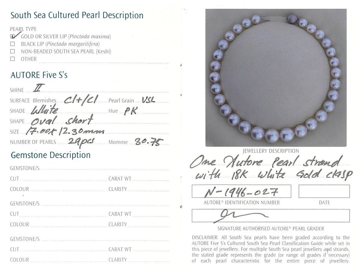 Autore pearl necklace with 29 graduated white oval short Australian South Sea Pearls of 17.0mm-12.3mm. With 18ct white gold Autore clasp. Length: 47cm. With Autore certificate #N-1946-027. Weight: 116.4g. (New)