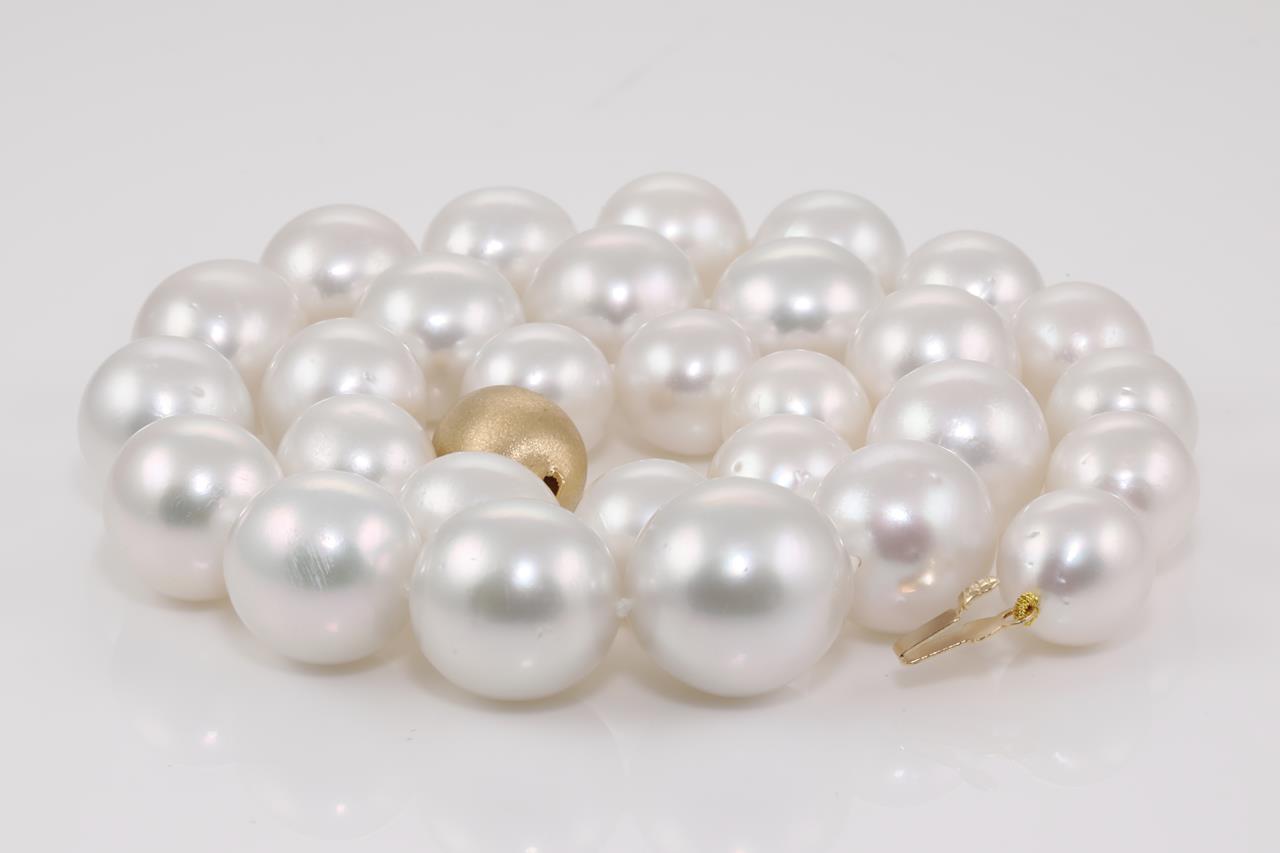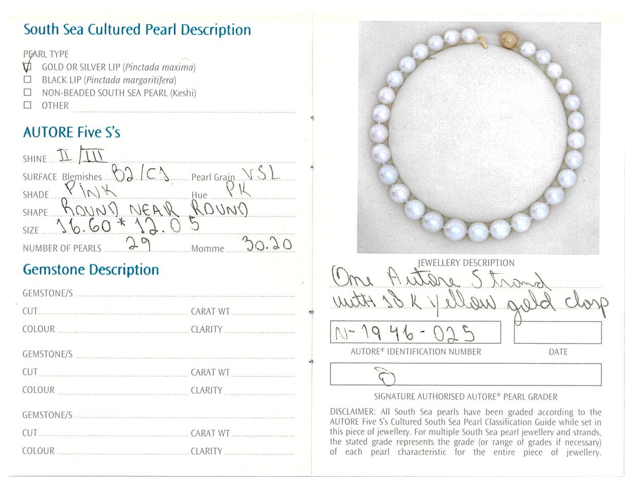 Autore pearl necklace with 29 graduated round near round pink Australian South Sea Pearls of 16.6mm-12.05mm. 18ct yellow gold Autore clasp. Length: 46cm. Weight: 114.4g. With Autore certificate #N-1946-025. (New)