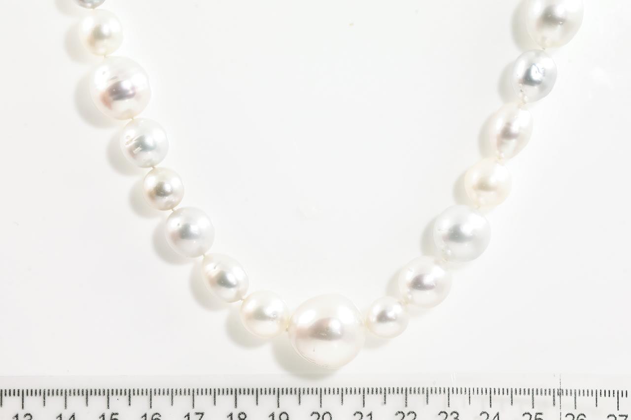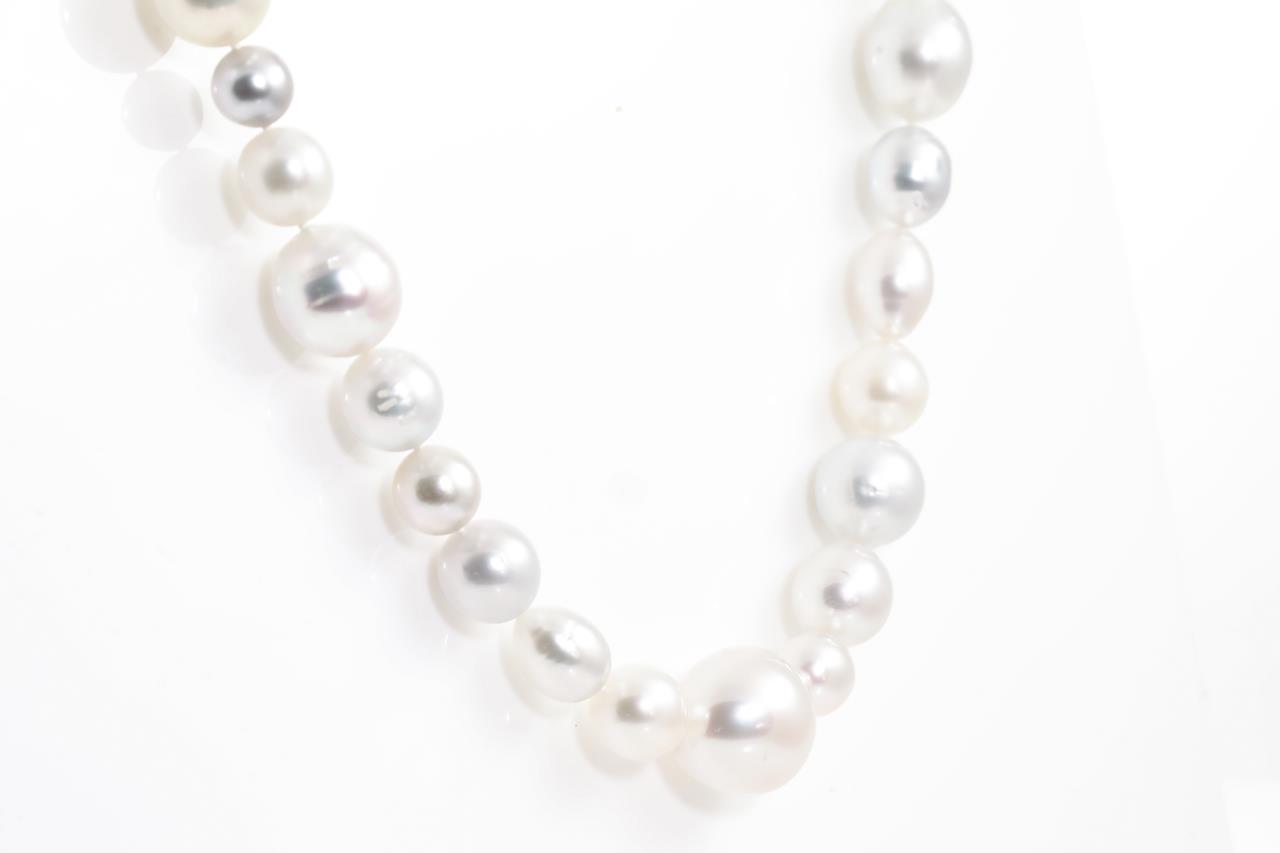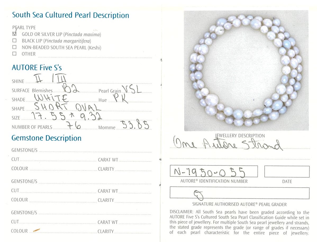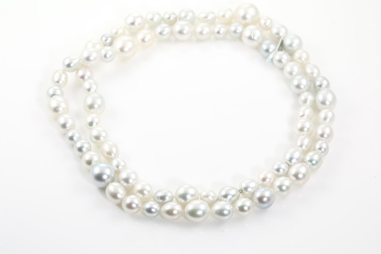 Autore pearl rope necklace with 76 short oval white Australian South Sea Pearls of 17.5mm-9.3mm. With 18ct white gold invisible clasp. Length: 112cm. Weight: 201.6g. With Autore certificate #N-1950-055. (New)