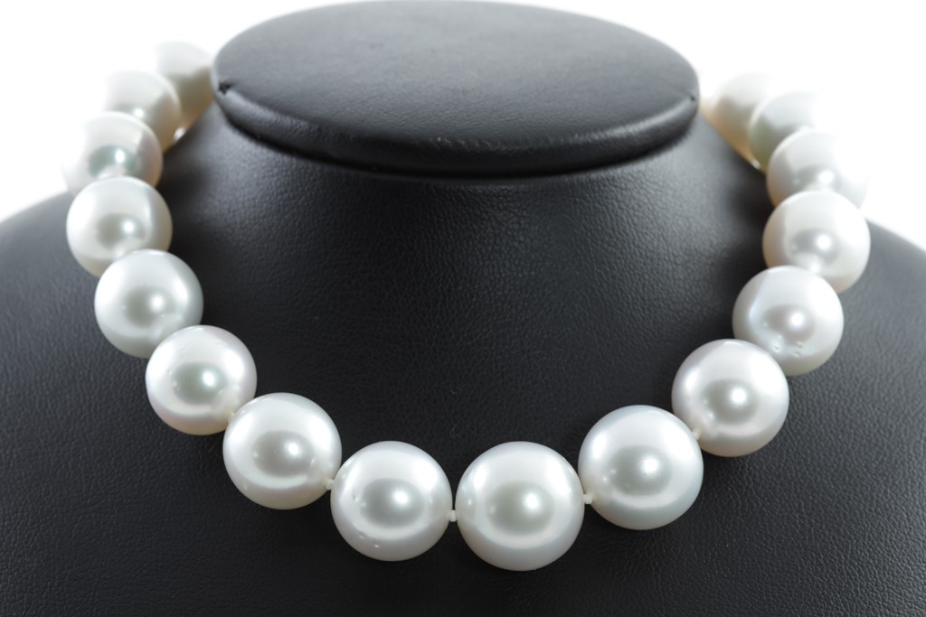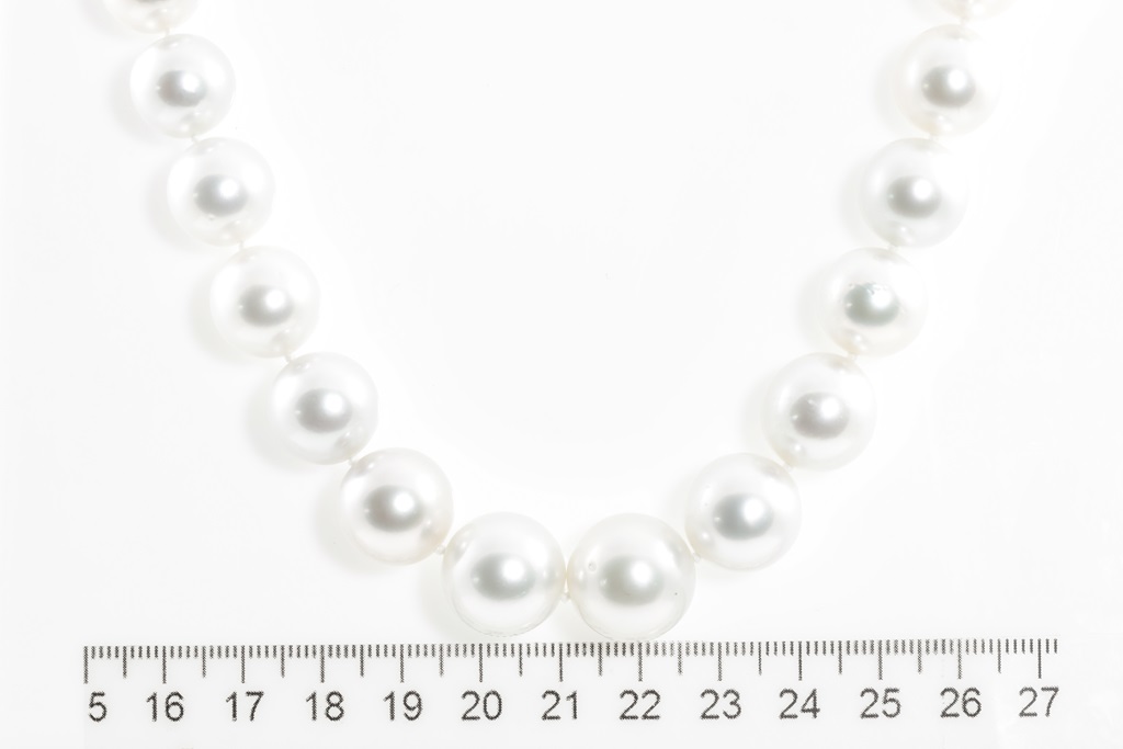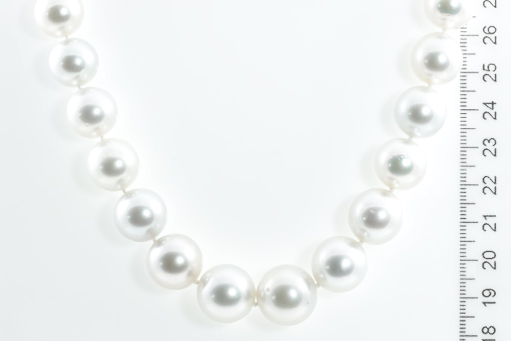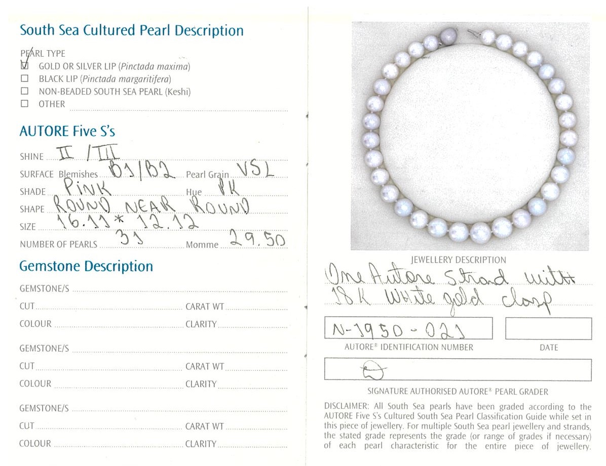Autore pearl graduated necklace with 31 round near round pink Australian South Sea Pearls of 15.5mm-12.0mm. With 18ct white gold clasp. Length: 58.5cm. Weight: 117.9g. With Autore certificate #N-1946-024. (New)