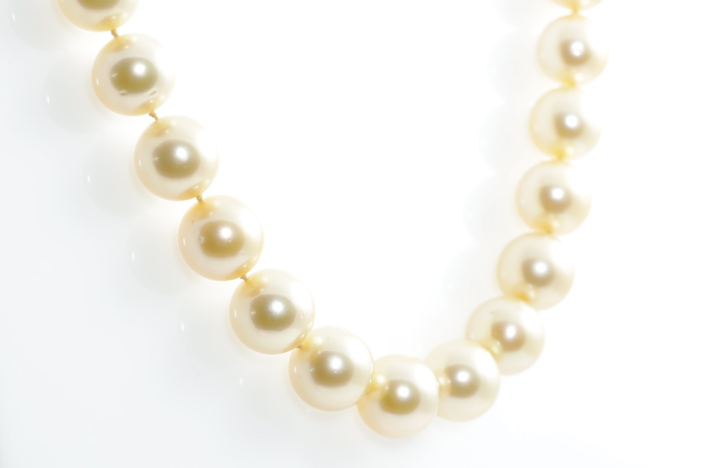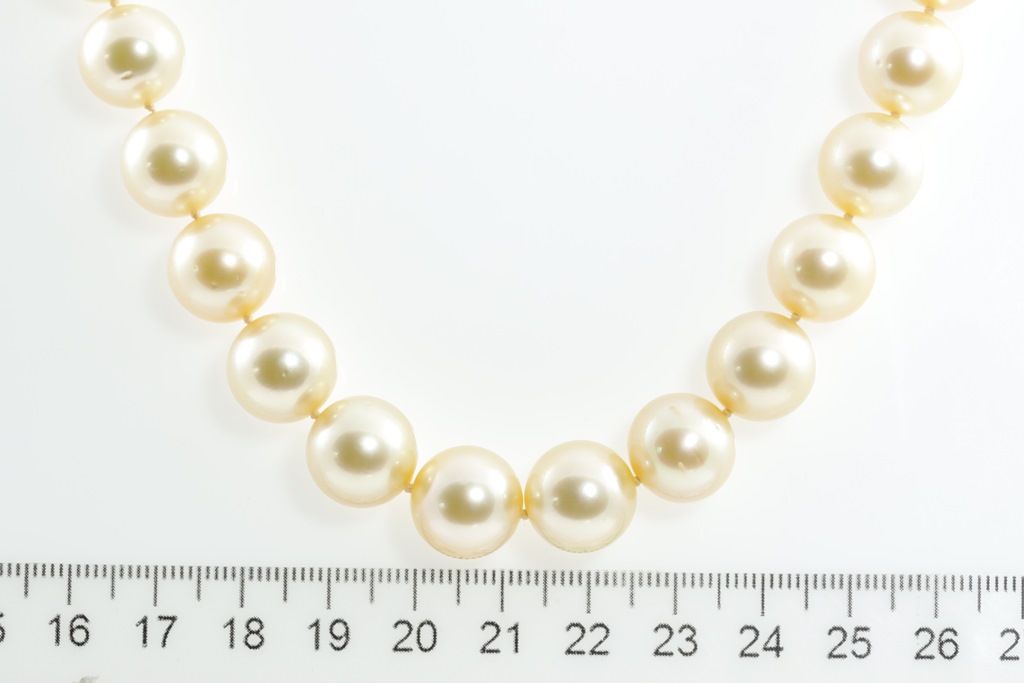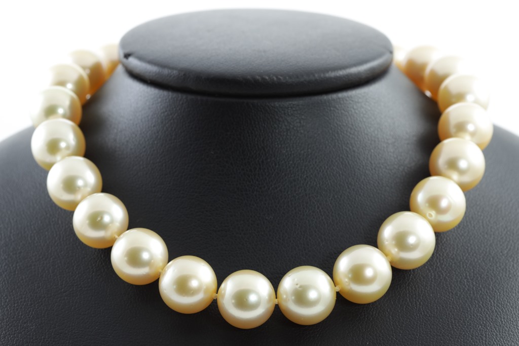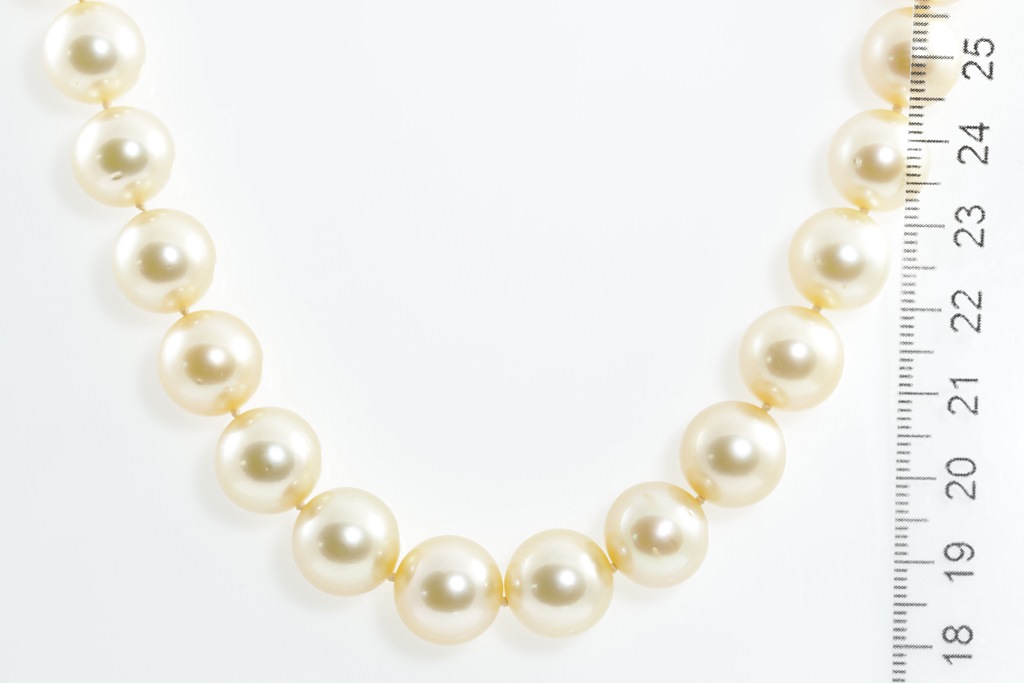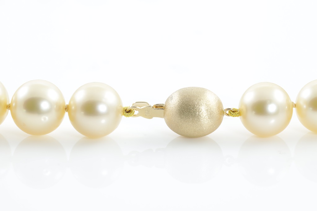 Autore pearl necklace with 35 oval short yellow South Sea Pearls of 12.9mm-11.0mm. With 18ct yellow gold clasp. Length: 57.0cm. Weight: 91.8g. With Autore certificate #N-1945-004. (New)