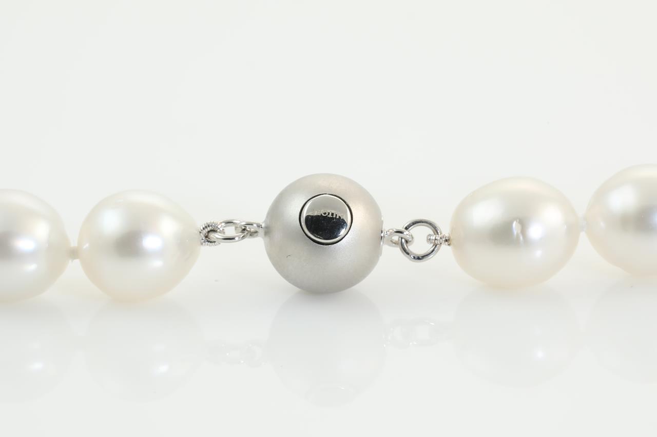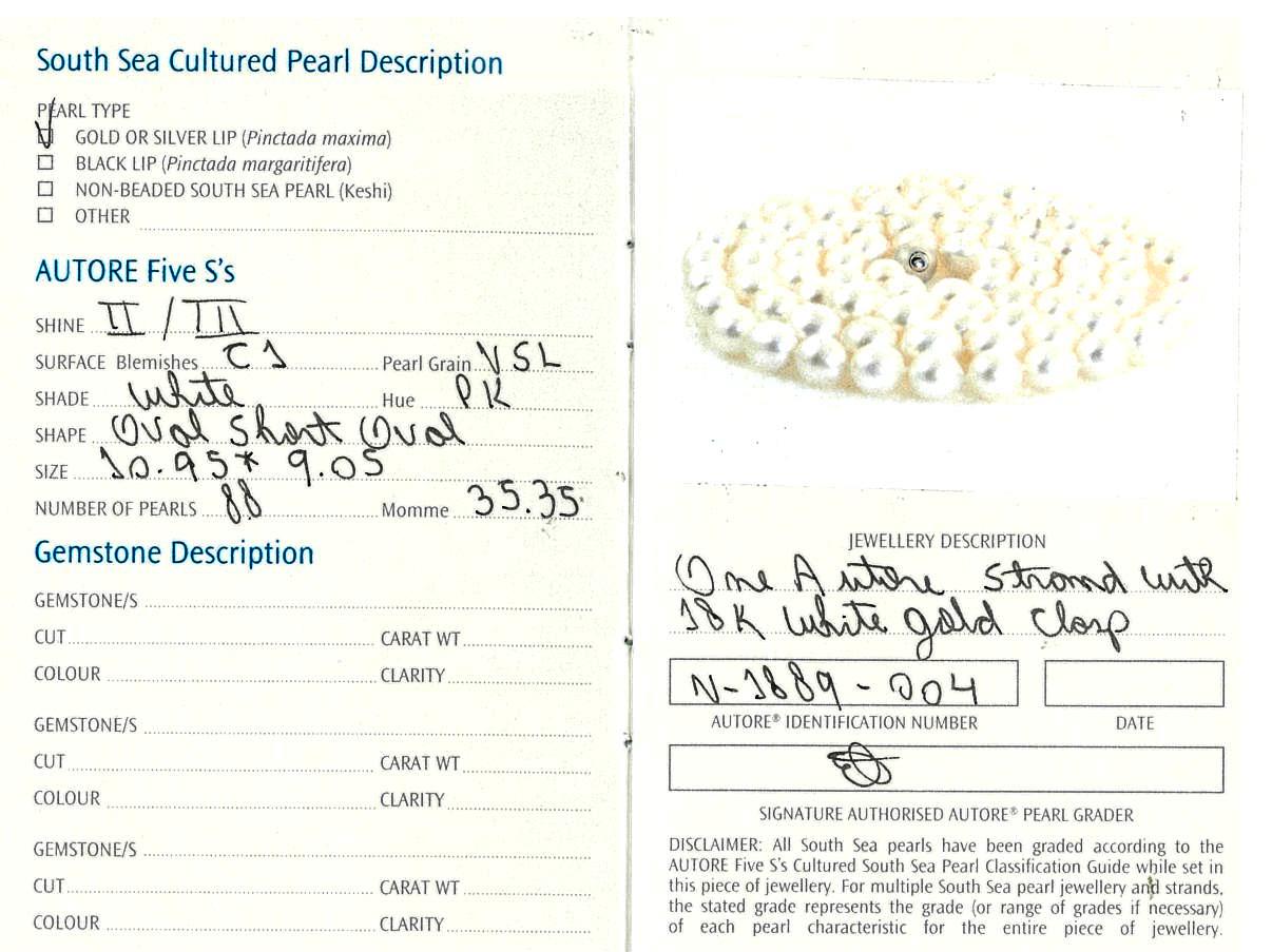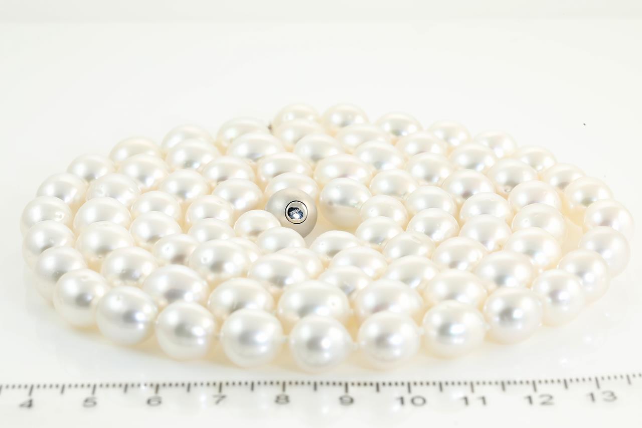 Autore pearl rope necklace with 88 white oval Australian South Sea Pearls of 9.05mm-10.95mm. With 18ct white gold Autore clasp. Length: 101cm. With Autore certificate #N-1889-004. Weight: 134.1g (As New)
