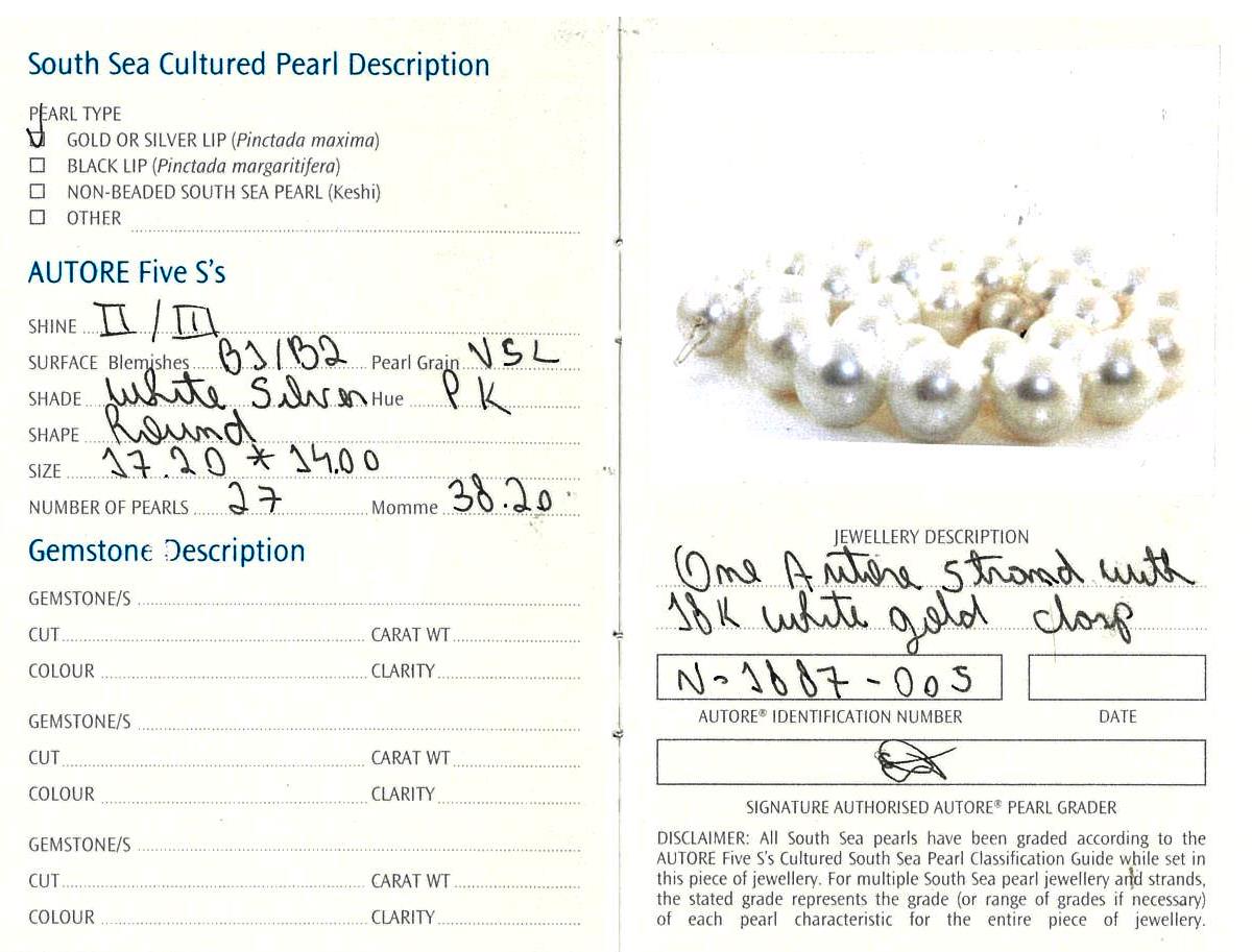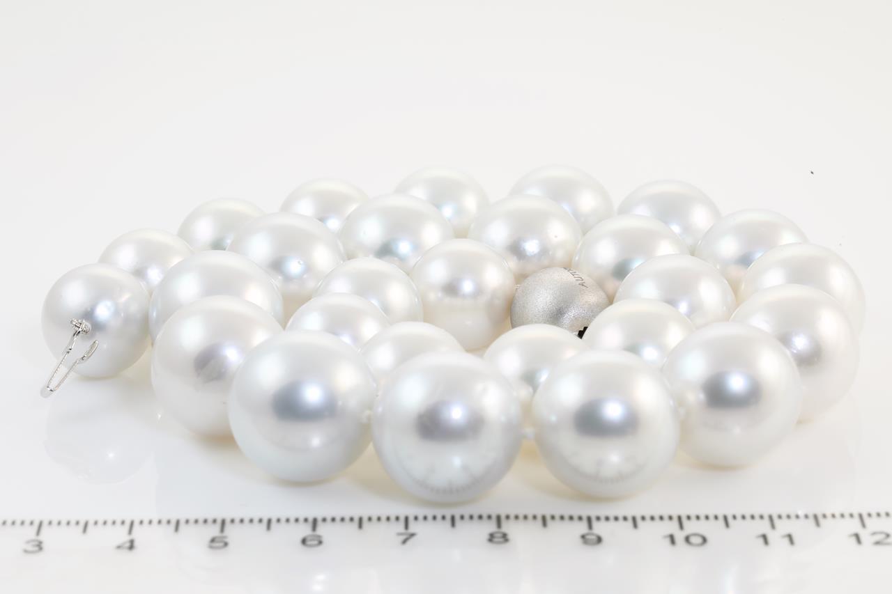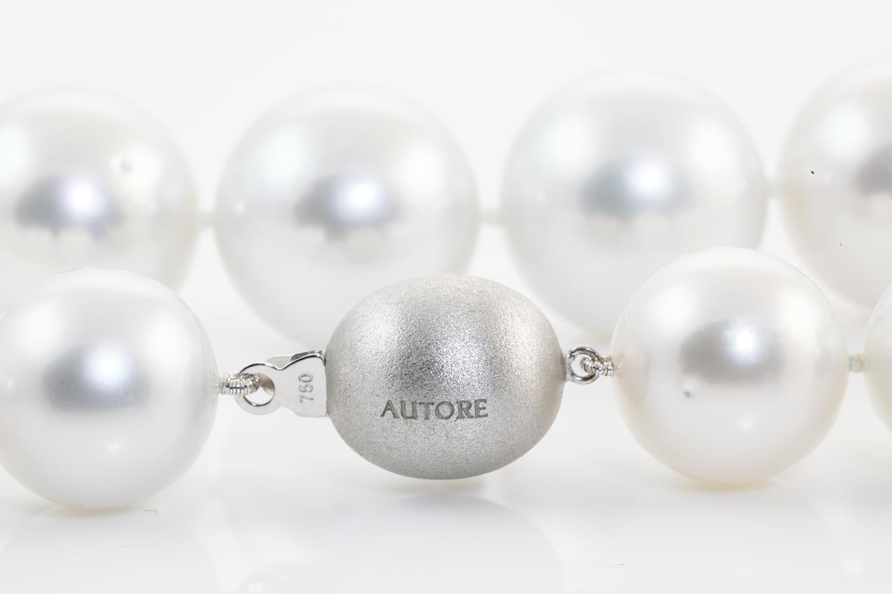 Autore south sea pearl necklace with 27 graduated pearls of 14.0mm - 17.2mm. With 18ct white gold clasp. Length: 45.5cm. Weight: 144.4g. With Autore certificate #N-1887-005. (As New)