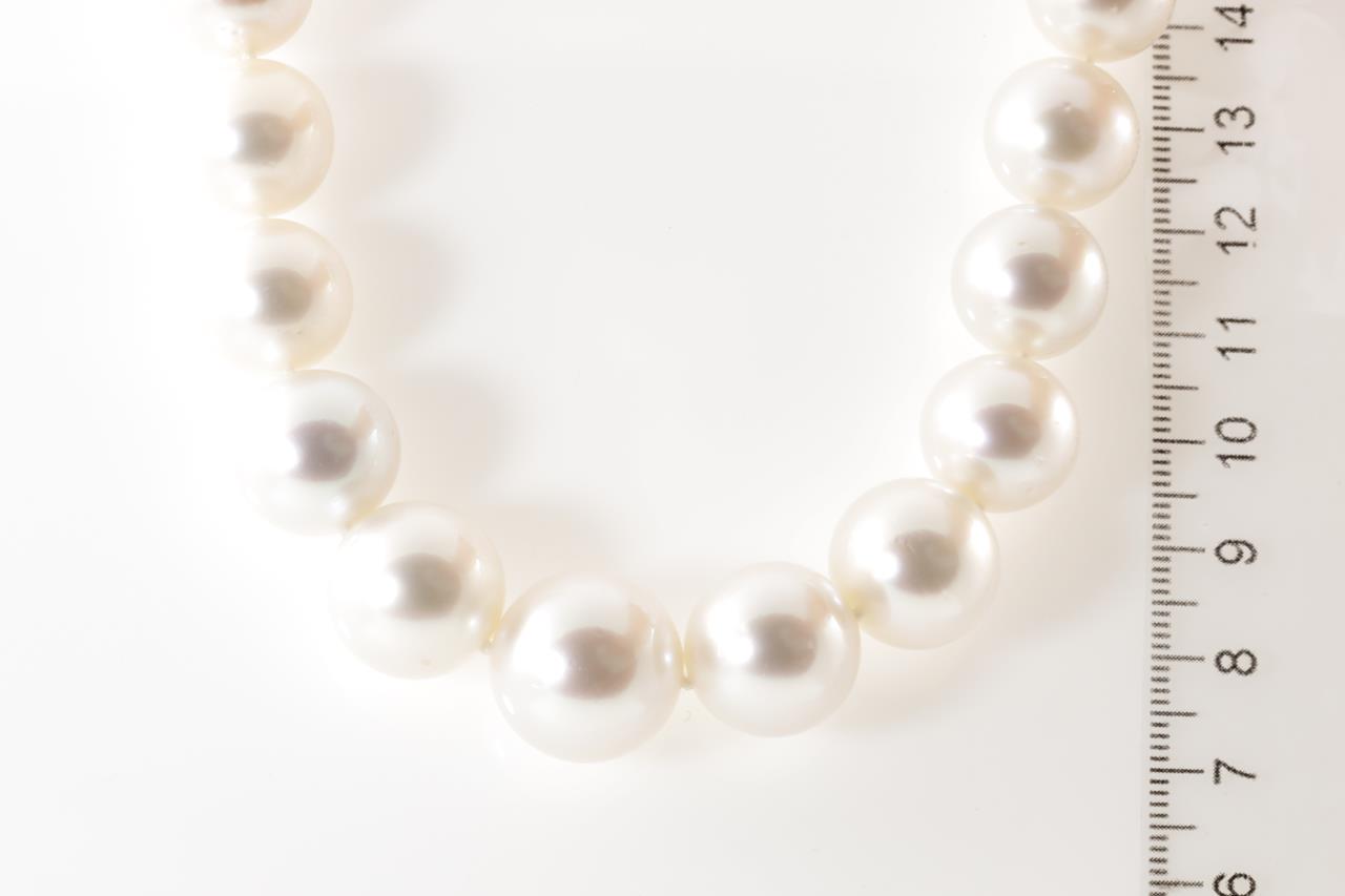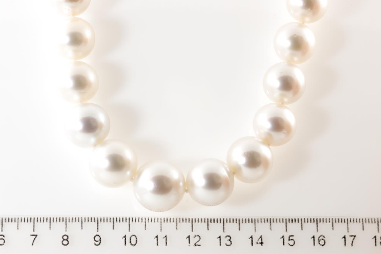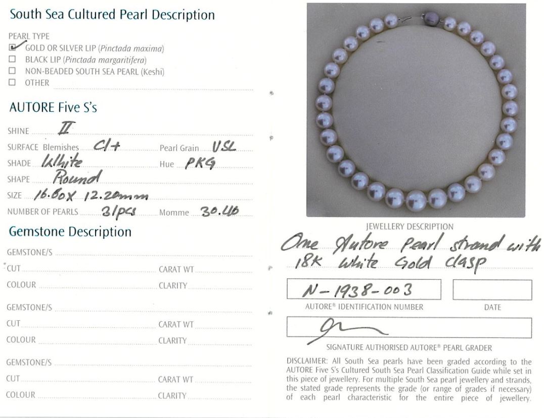Autore pearl necklace with 31 graduated round Australian South Sea Pearls of 16.6mm-12.2mm. With 18ct white gold Autore clasp. Length: 46cm. With Autore certificate #N-1938-003. Weight: 115g. (New)
