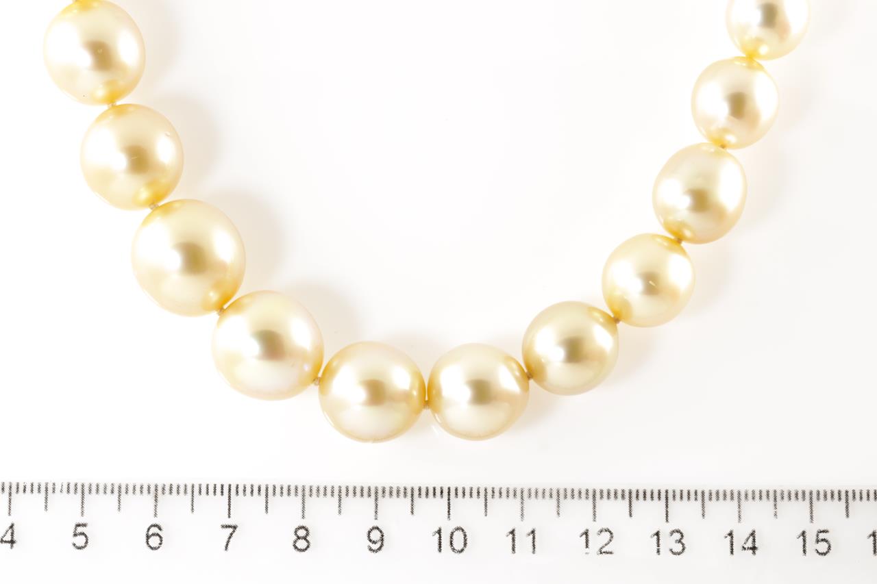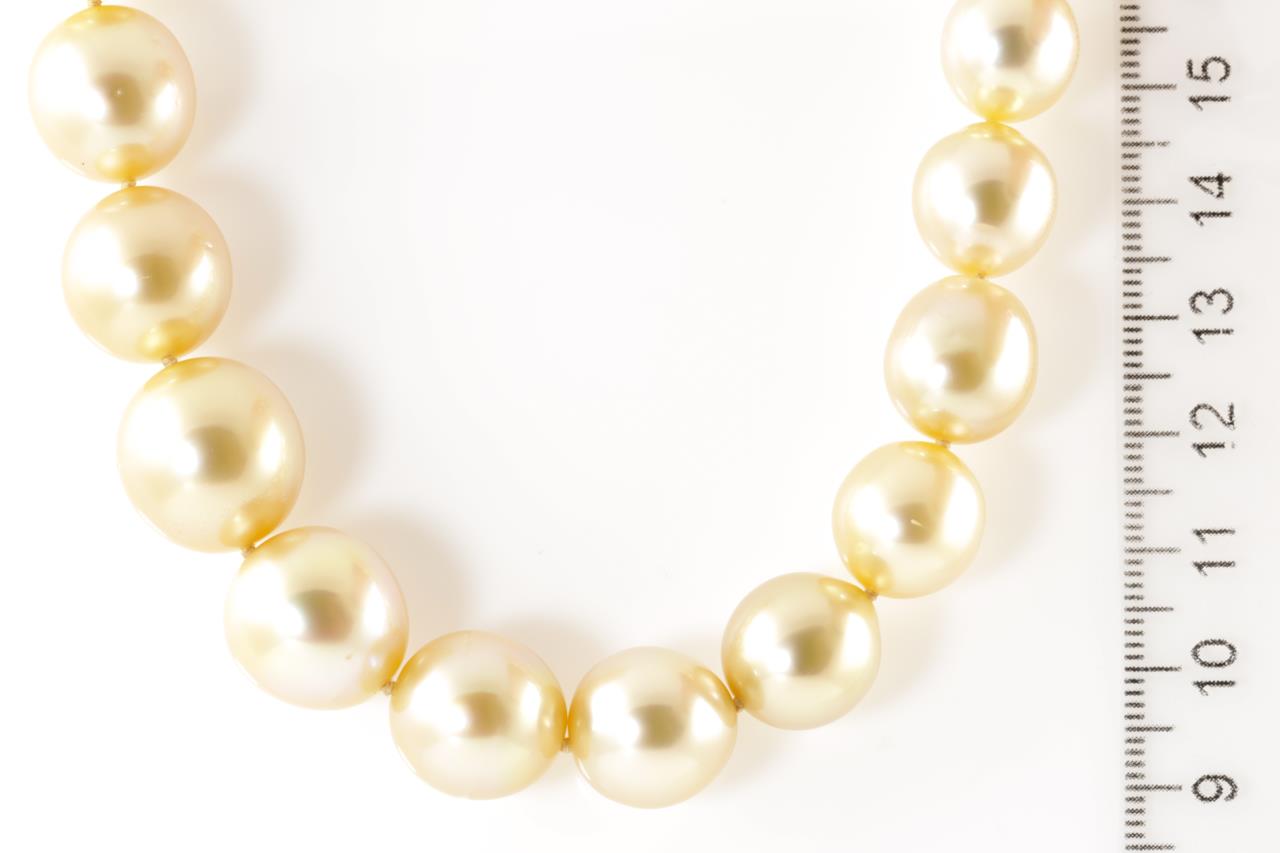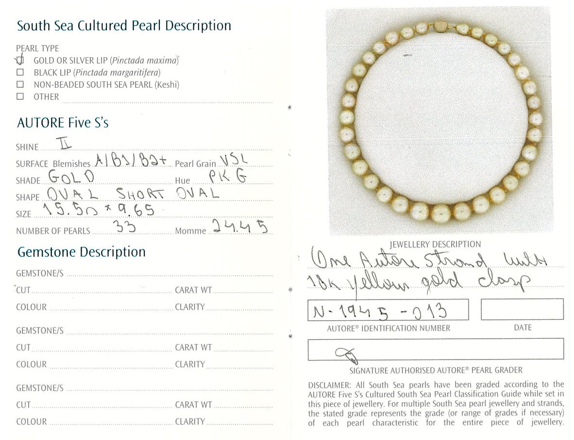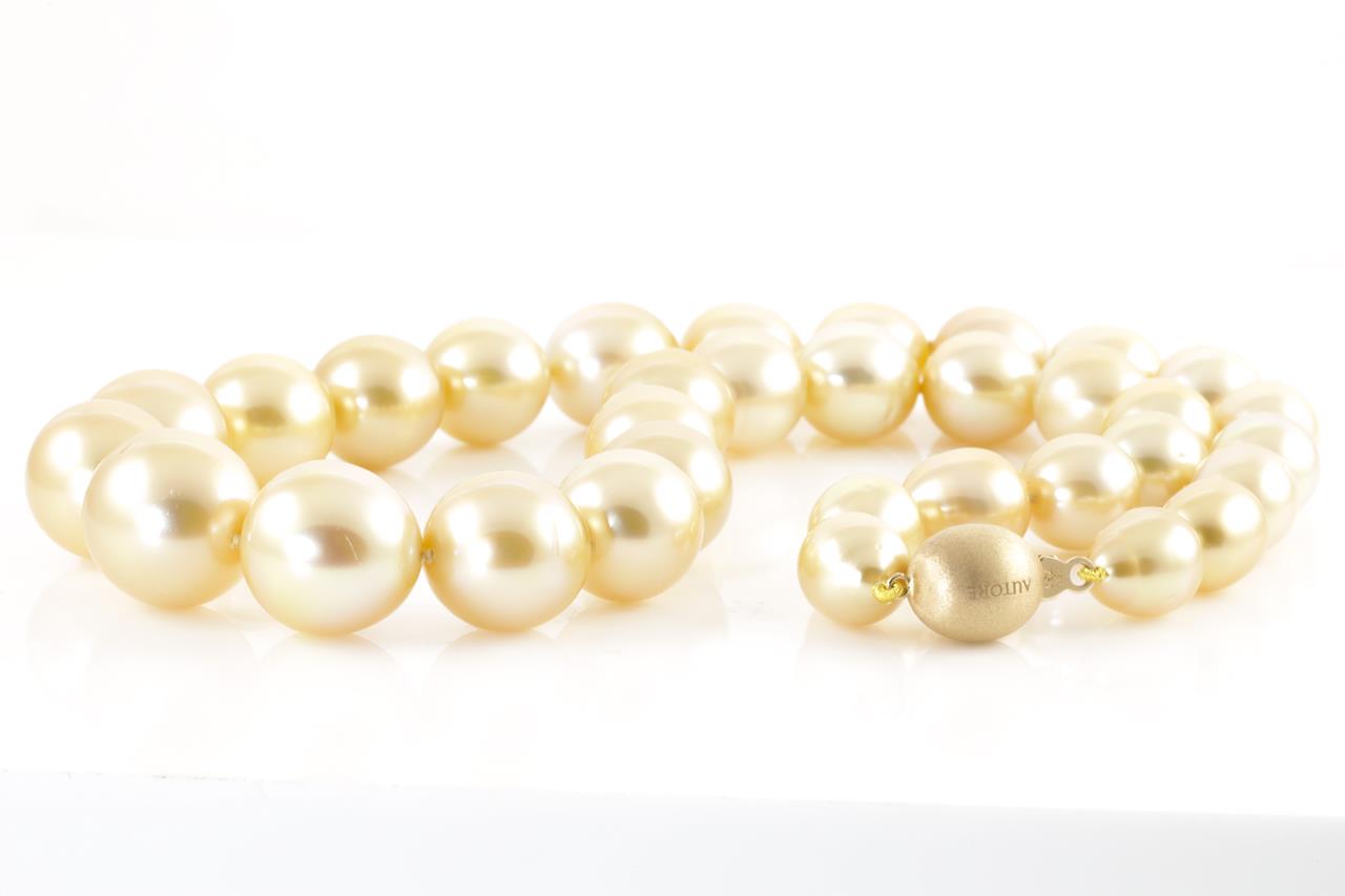 Autore Pearl necklace with 33 graduated Golden South Sea oval short oval Pearls of 15.5mm-9.6mm. With 18ct yellow gold Autore clasp. Length: 42cm. Weight: 92.2g. With Autore certificate #N-1945-013. (New)