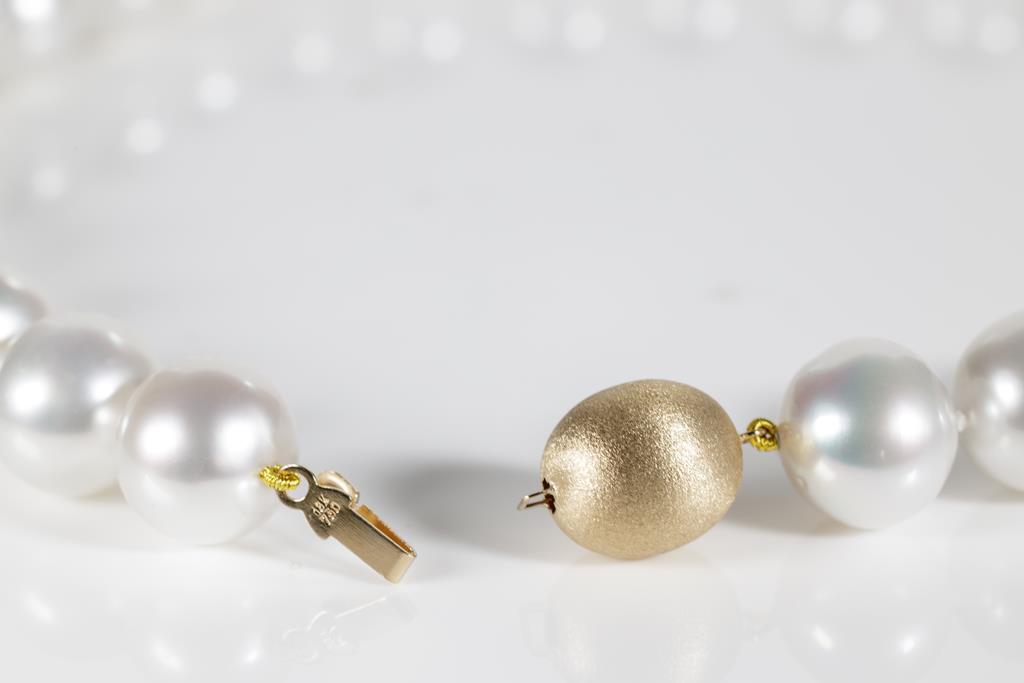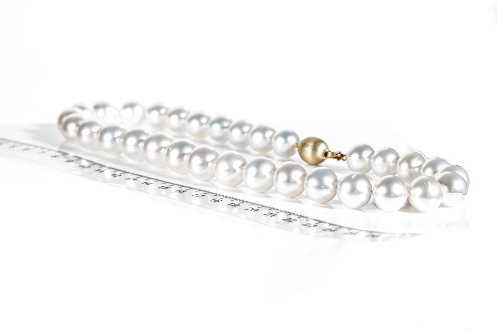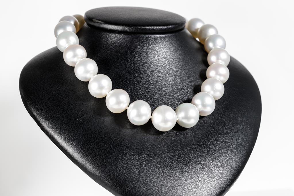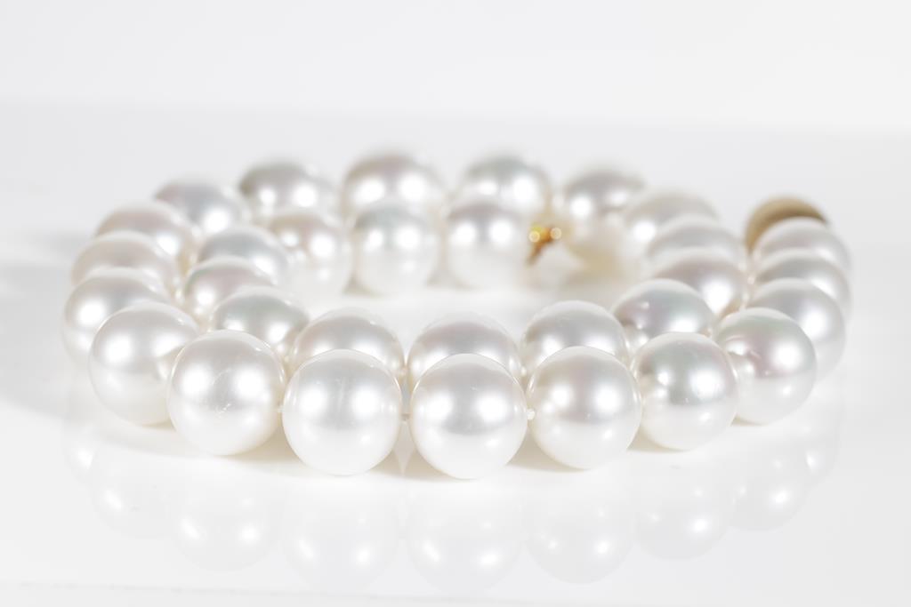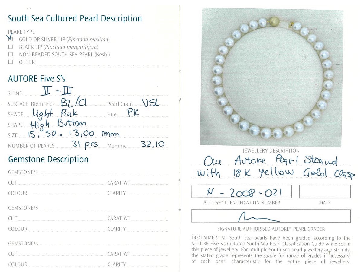 Autore pearl necklace with 31 high button light pinkish white South Sea Pearls of 13.0mm - 15.5mm. With 18ct yellow gold Autore clasp. Weight: 121g. Length: 46cm. With Autore authenticity certificate #N-2008-021. (As new)