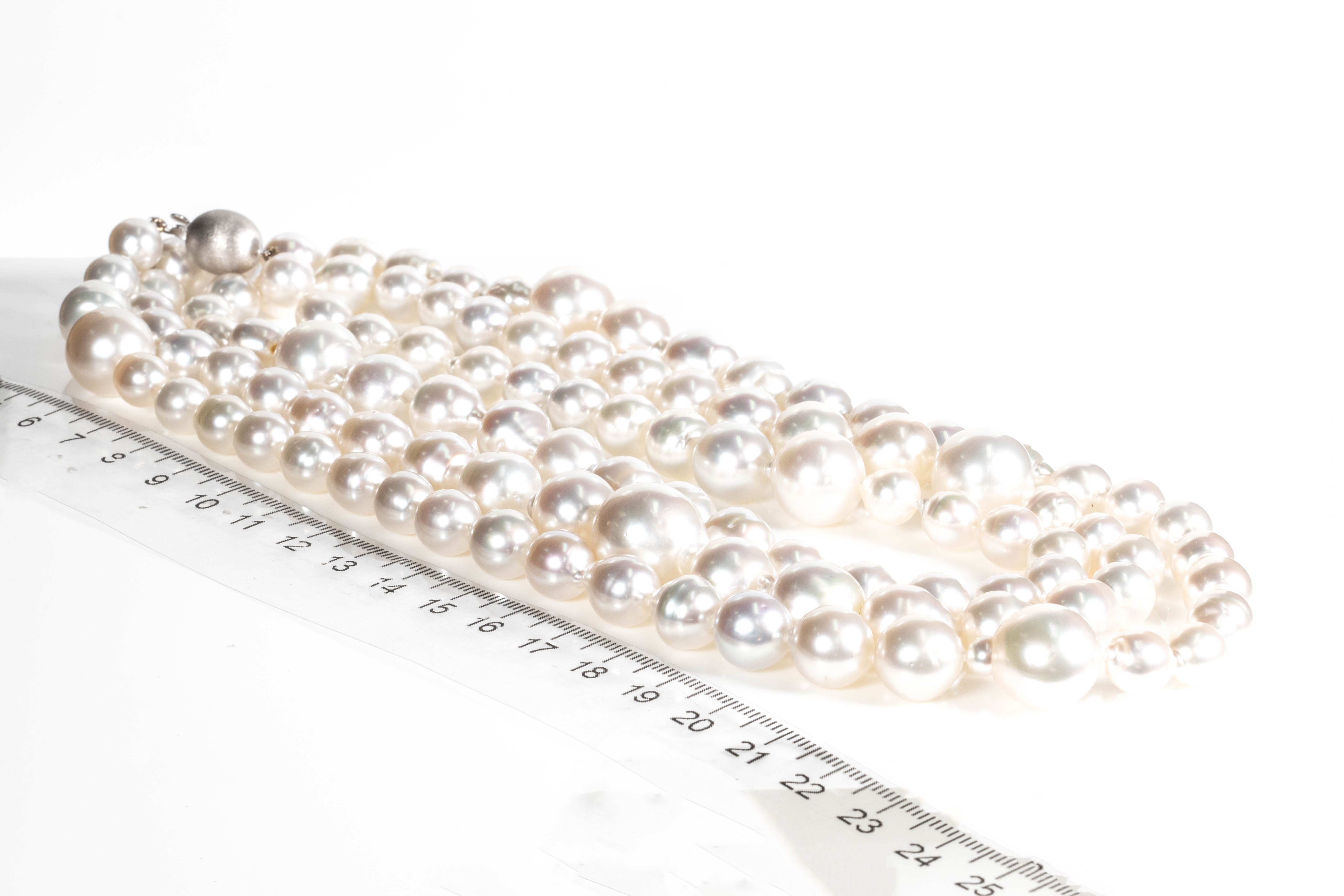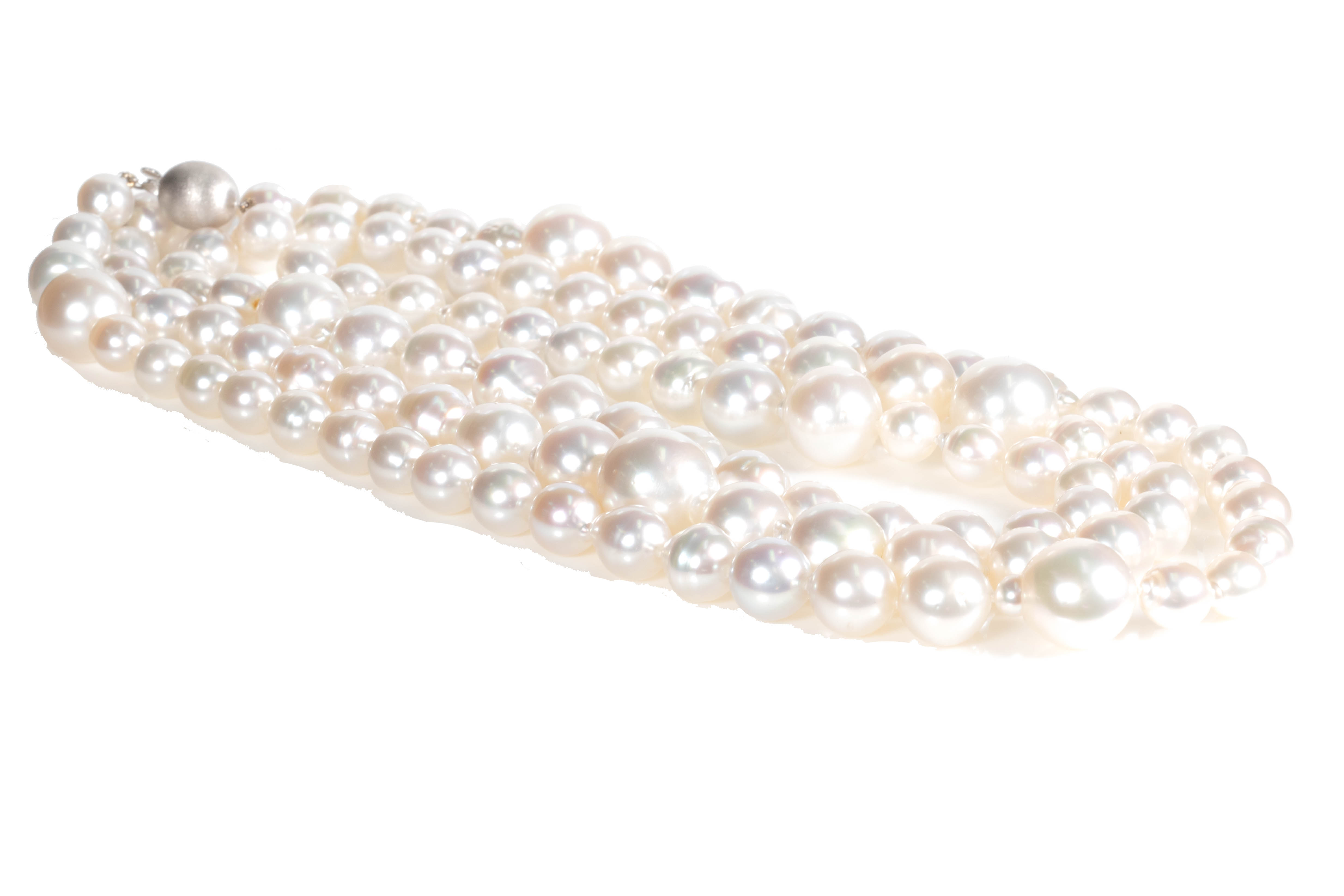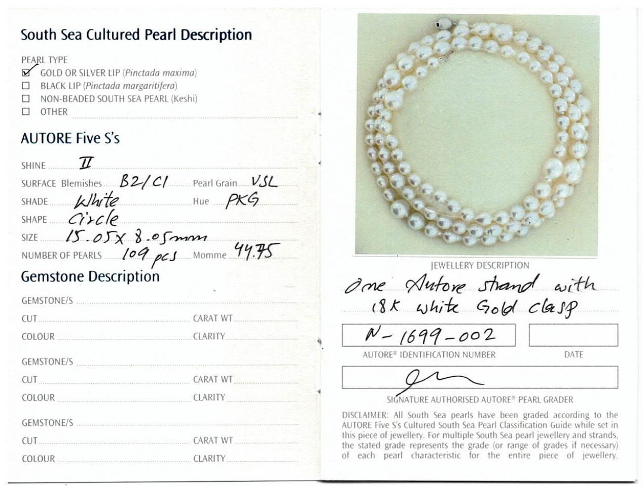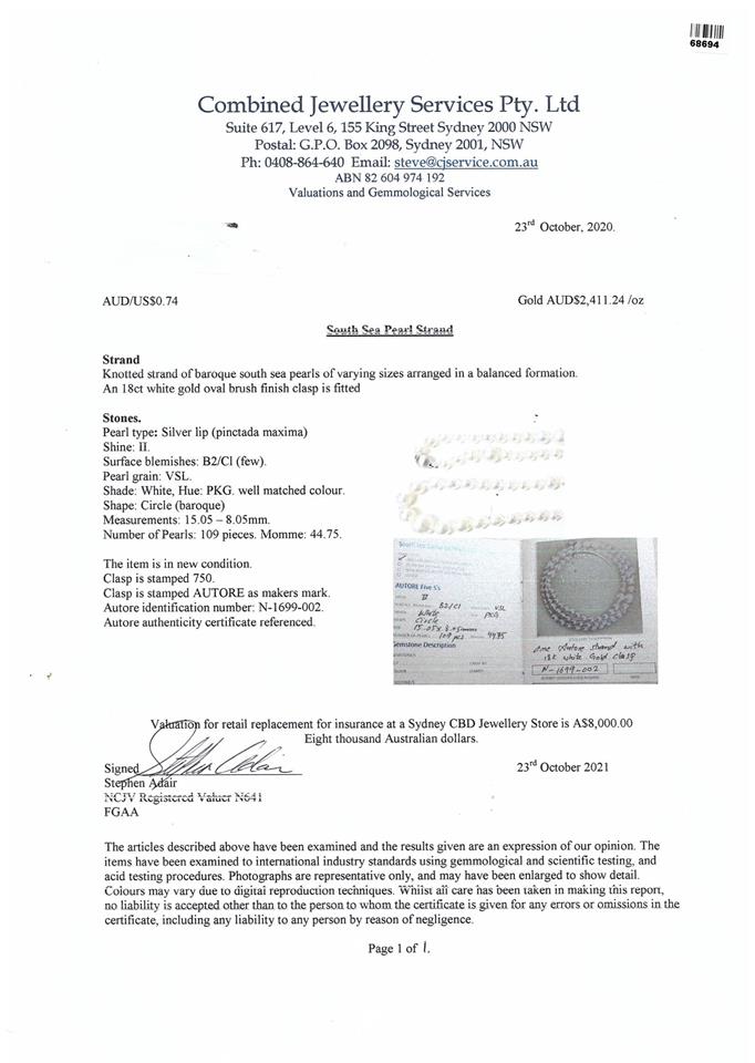 Autore South Sea Pearl Necklace with graduated off-round Pearls 8.05-15.05mm. 109 Pearls. 18ct white gold. Length 130cm. Weight 167.7g. With Valuation and pouch. (Pre-owned)