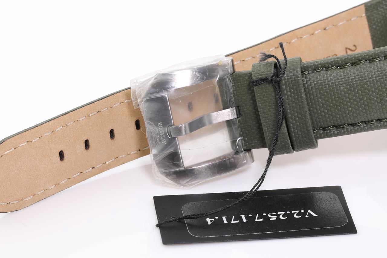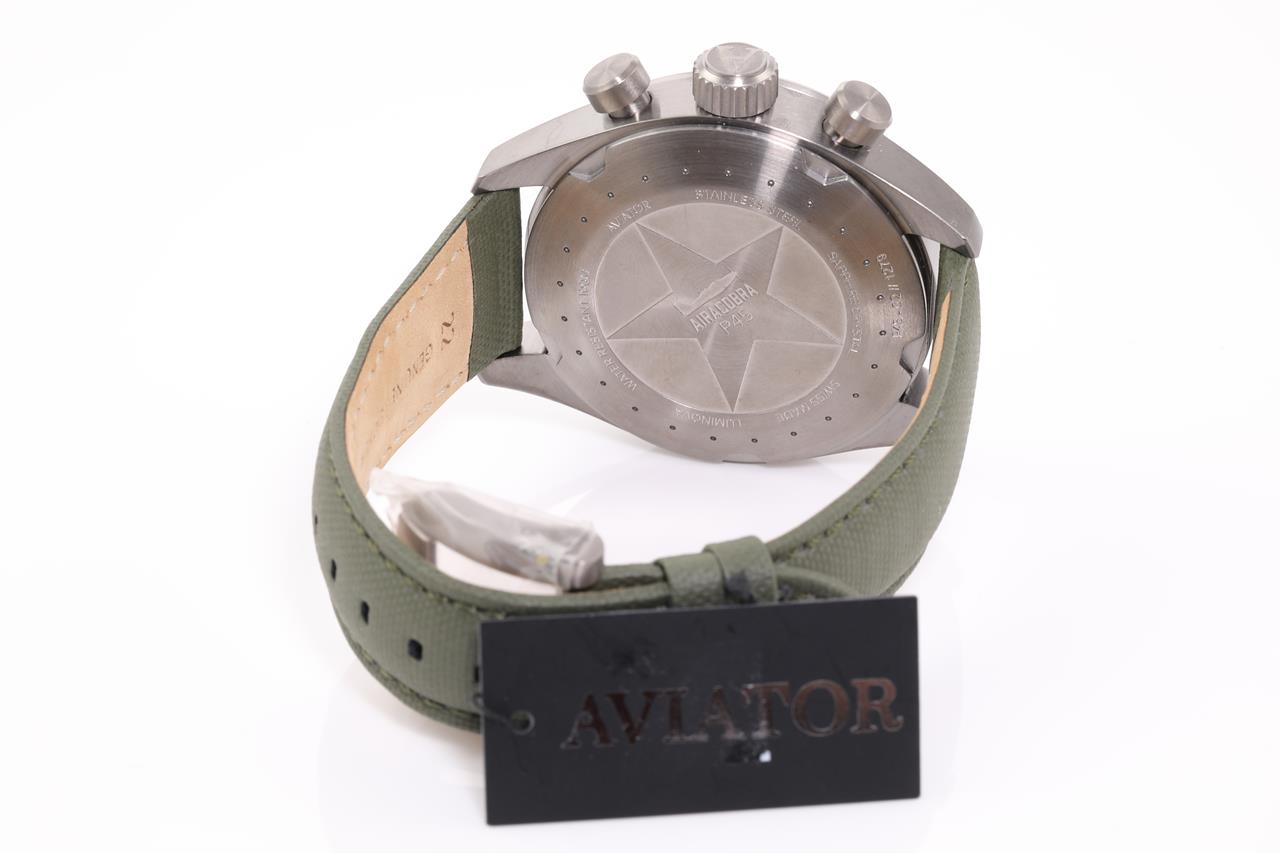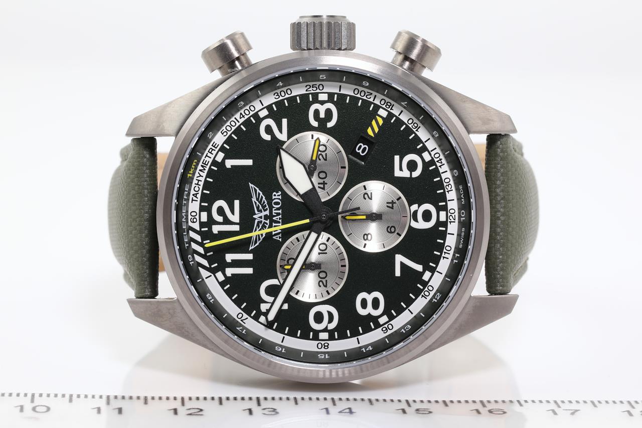 Aviator Airacobra Chrono P45 titanium PVD coated stainless steel quartz mens watch. Green chronograph dial, date, case diameter: 45mm, length: 22cm, Swiss made. Ref# V.2.25.7.171.4. With Aviator green leather strap and clasp. Note: light wear on strap and minor scratches on case due to being display stock. 12 month FSA warranty. (As New)