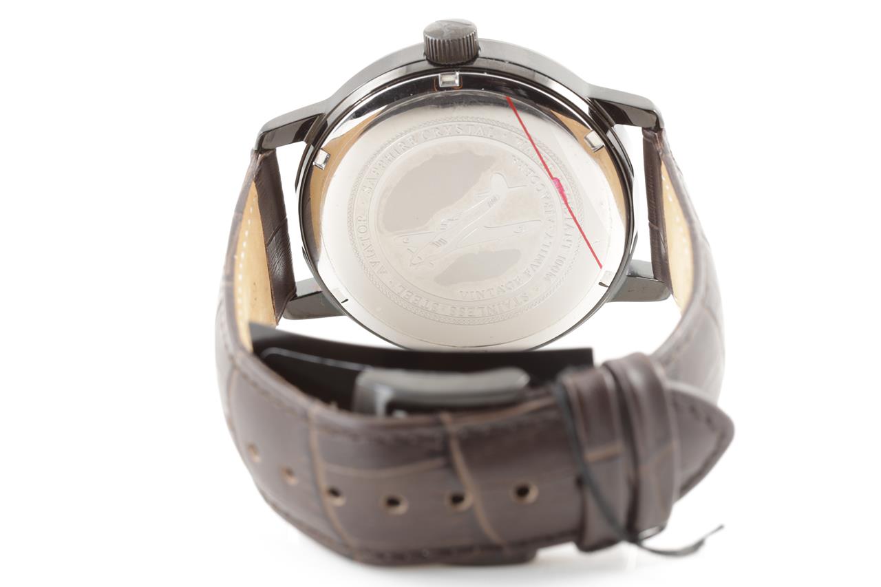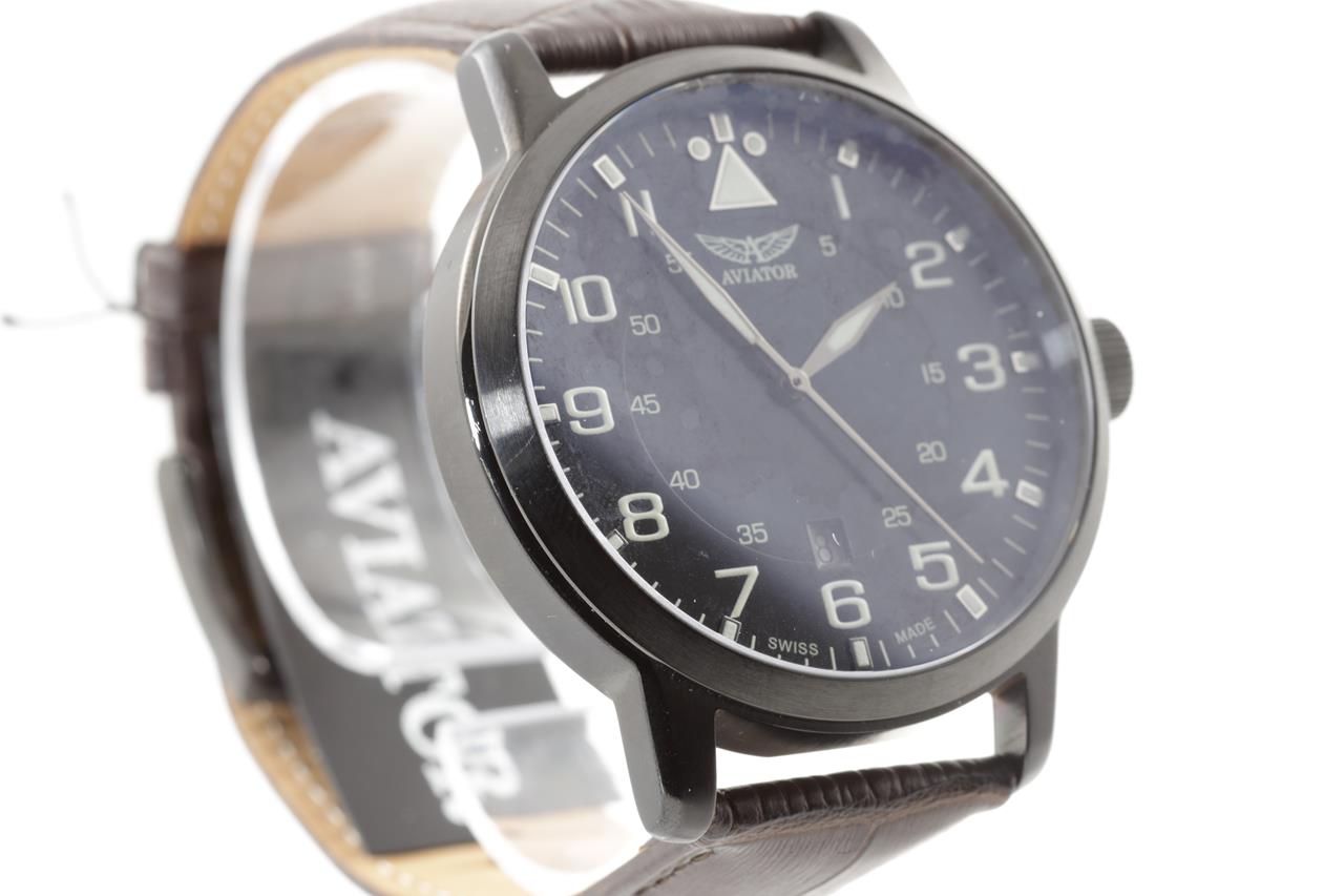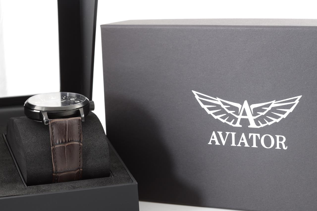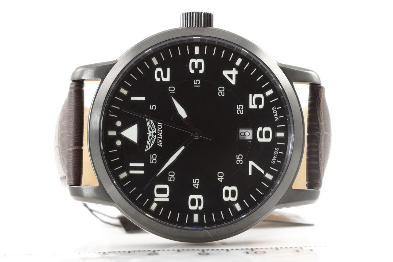 Aviator Airacobra black PVD coated stainless steel quartz mens watch. Black dial, date, case diameter: 45mm, length: 22.5cm, Swiss made. Ref# V.1.11.5.037.4. With Aviator brown leather strap and buckle. Note: light wear on strap and scratches on case due to being display stock. With Aviator box. 12 month FSA warranty. (As New)