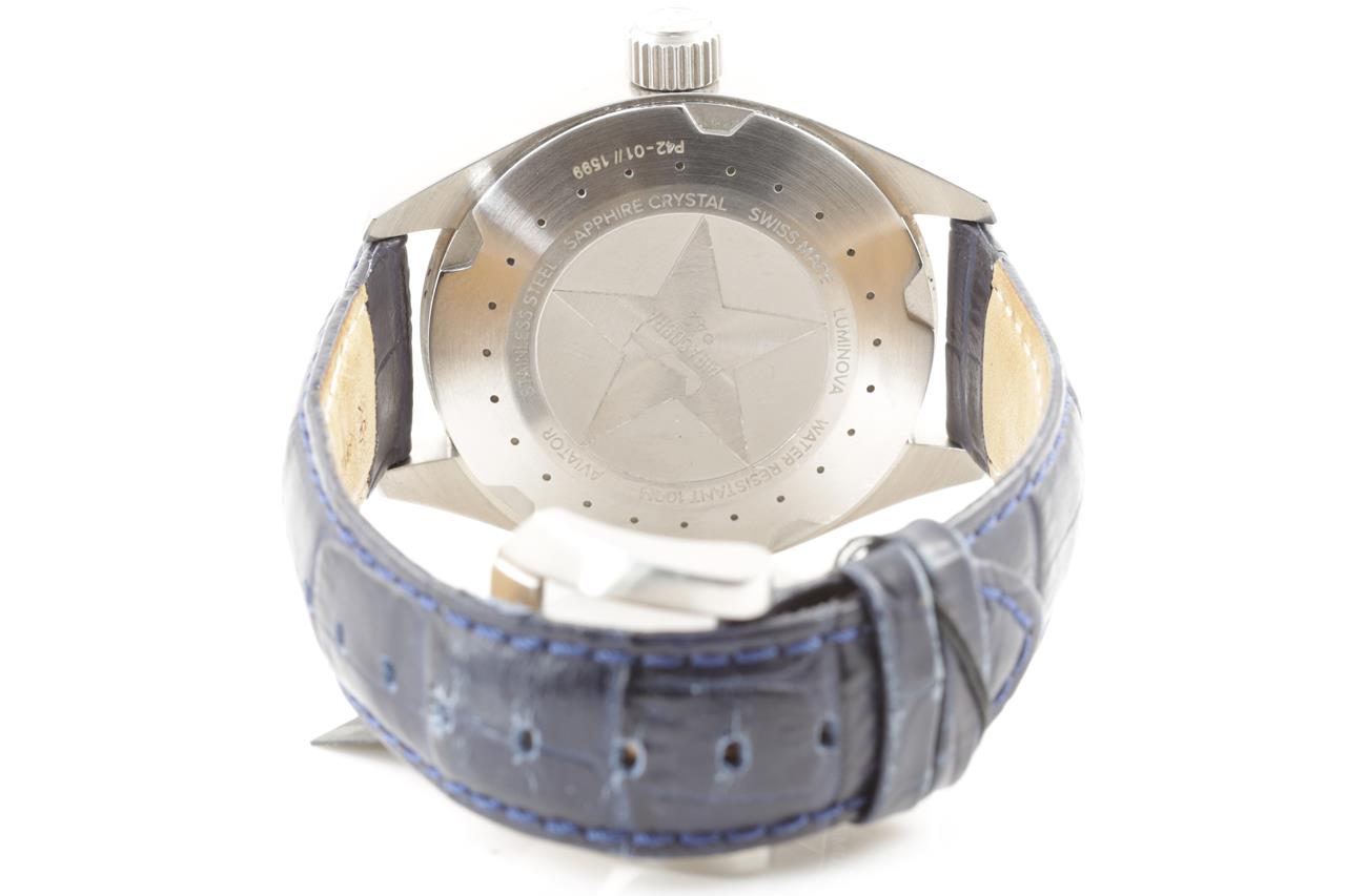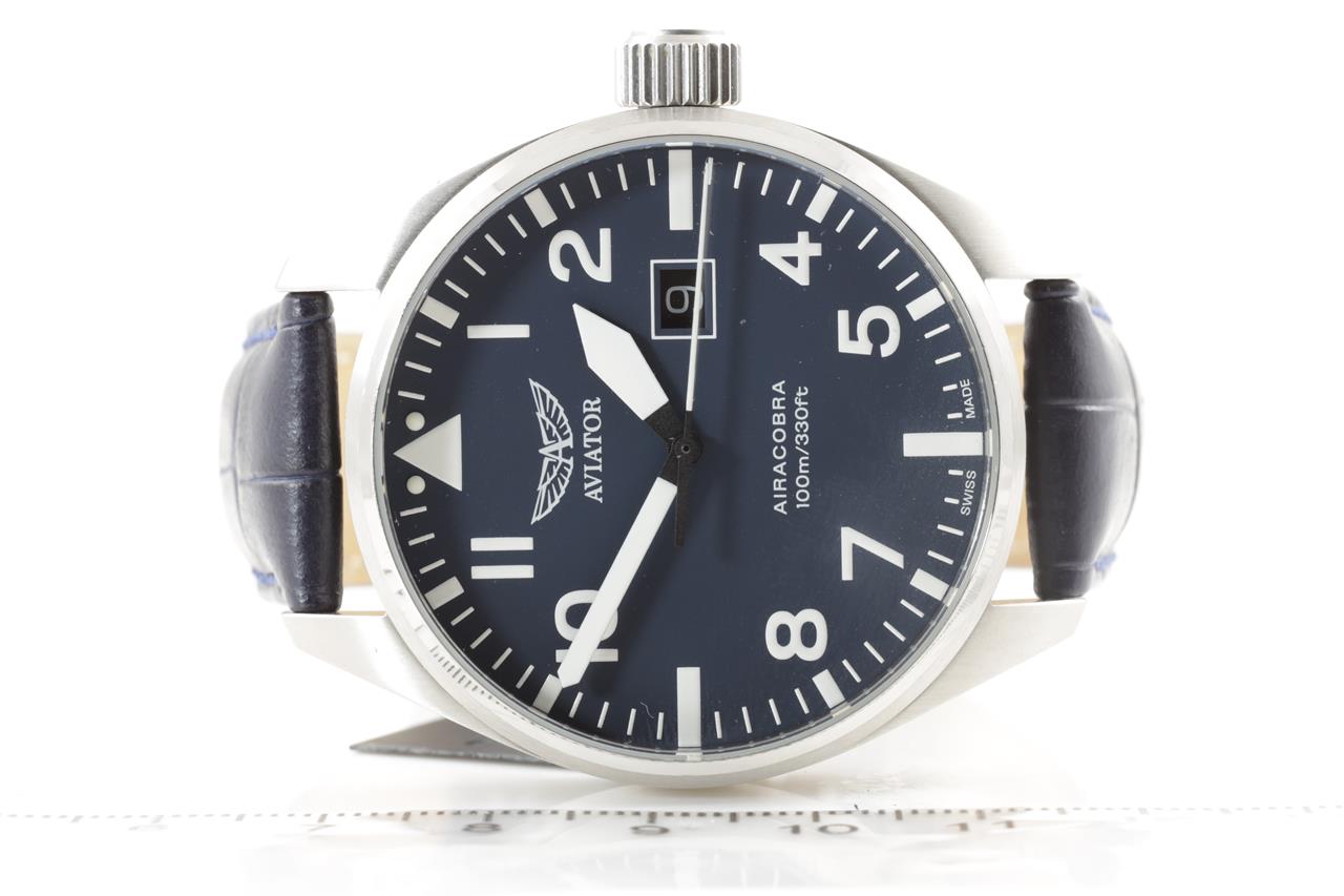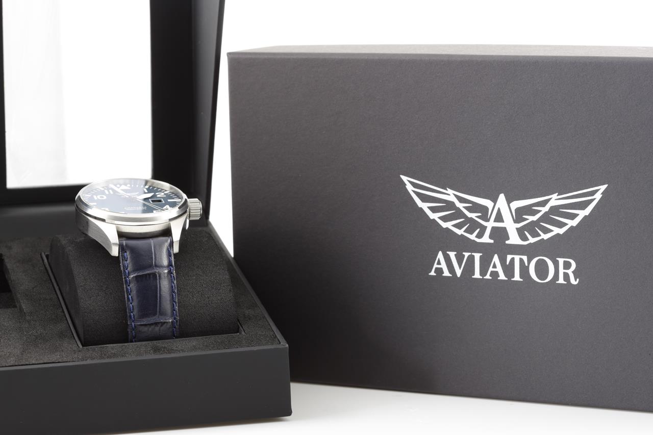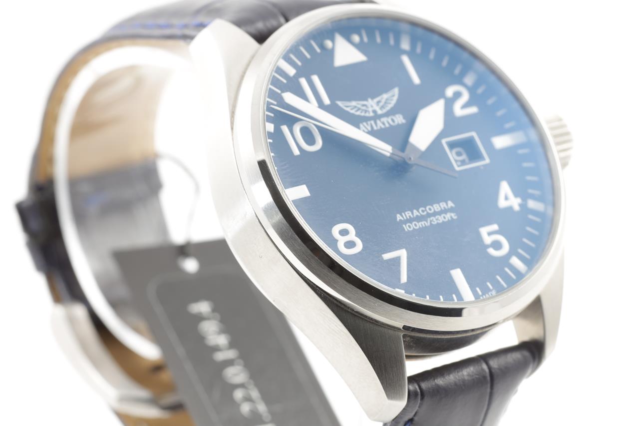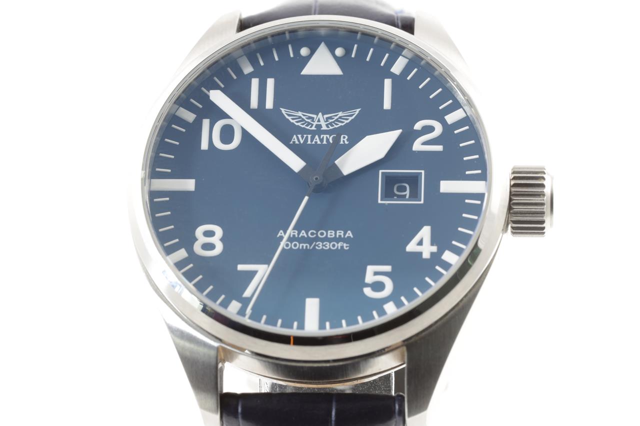 Aviator Aircobra P42 stainless steel quartz mens watch. Blue dial, date, case diameter:42mm, length: 21.5cm, Swiss made. Ref# V.1.22.0.149.4. With Aviator blue leather strap and buckle. Note: showing wear on strap and scratches on case due to being display stock. With Aviator box. 12 month FSA warranty. (As New)
