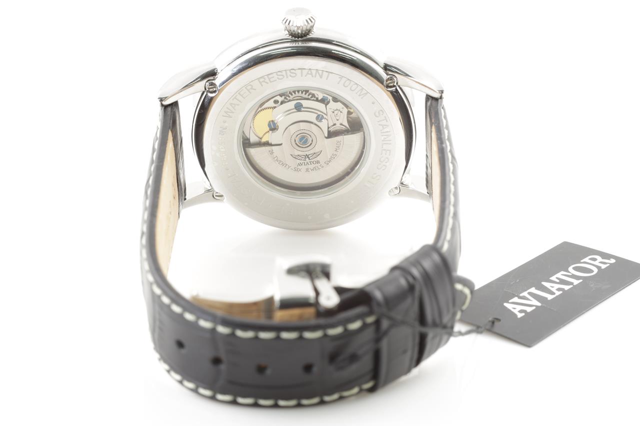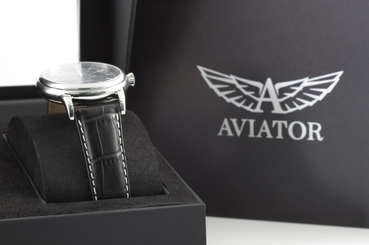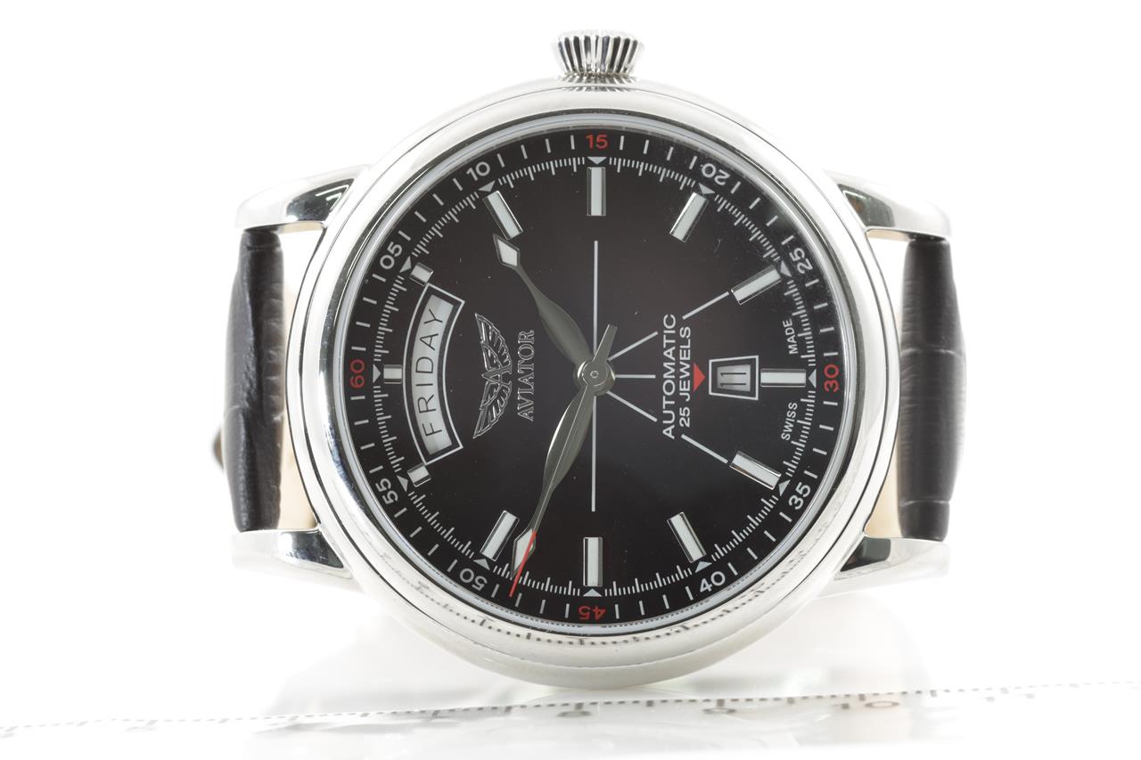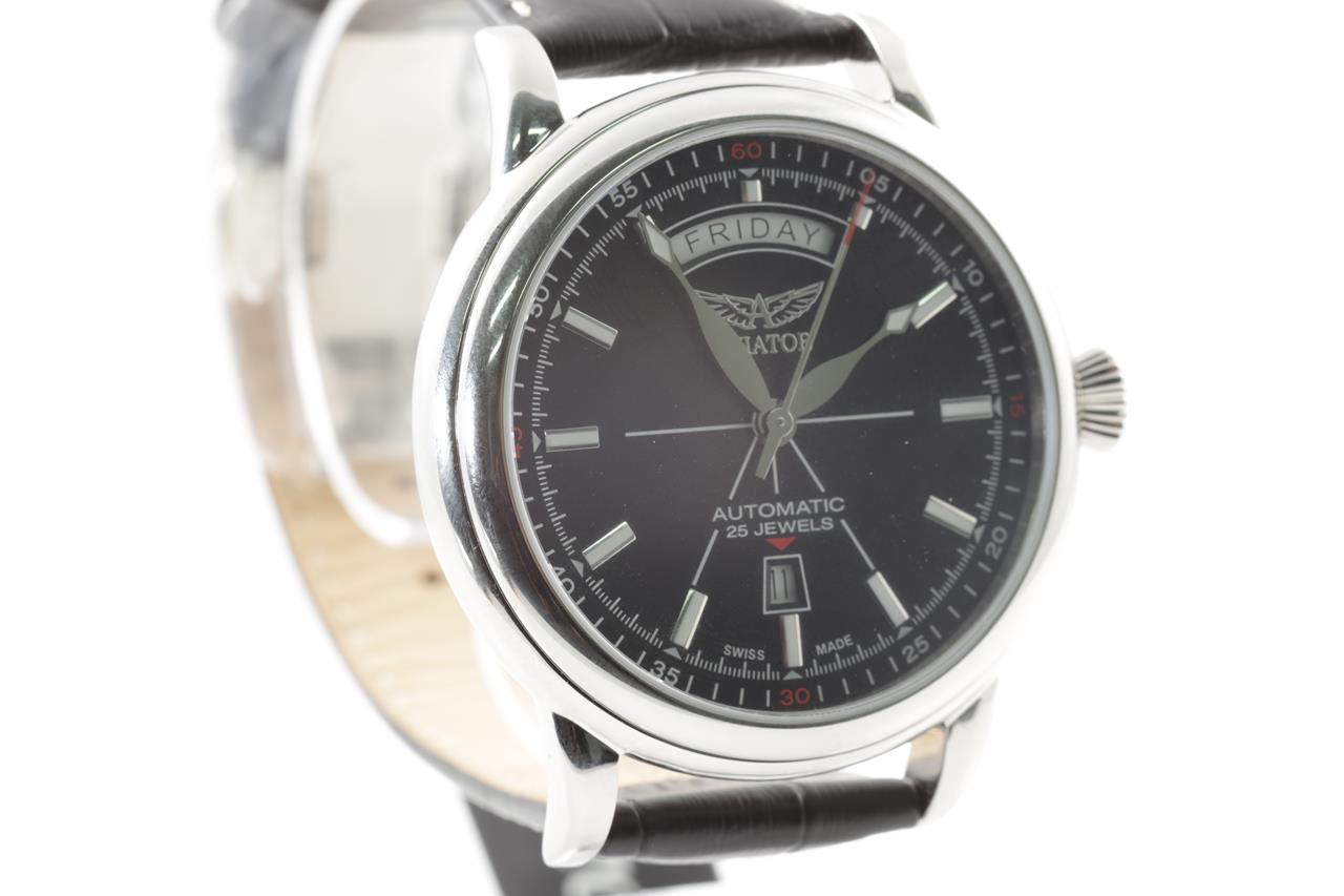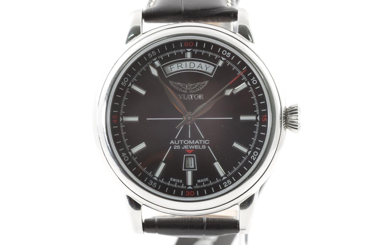 Aviator Douglas Day-Date stainless steel automatic mens watch. Black dial, day & date, case diameter: 45mm, wrist size: 22cm, Swiss made. Ref# V.3.20.0.142.4. With Aviator black leather strap and clasp. Note: minor scratches on case due to being display stock. With Aviator box. 12 month FSA warranty. (As New)