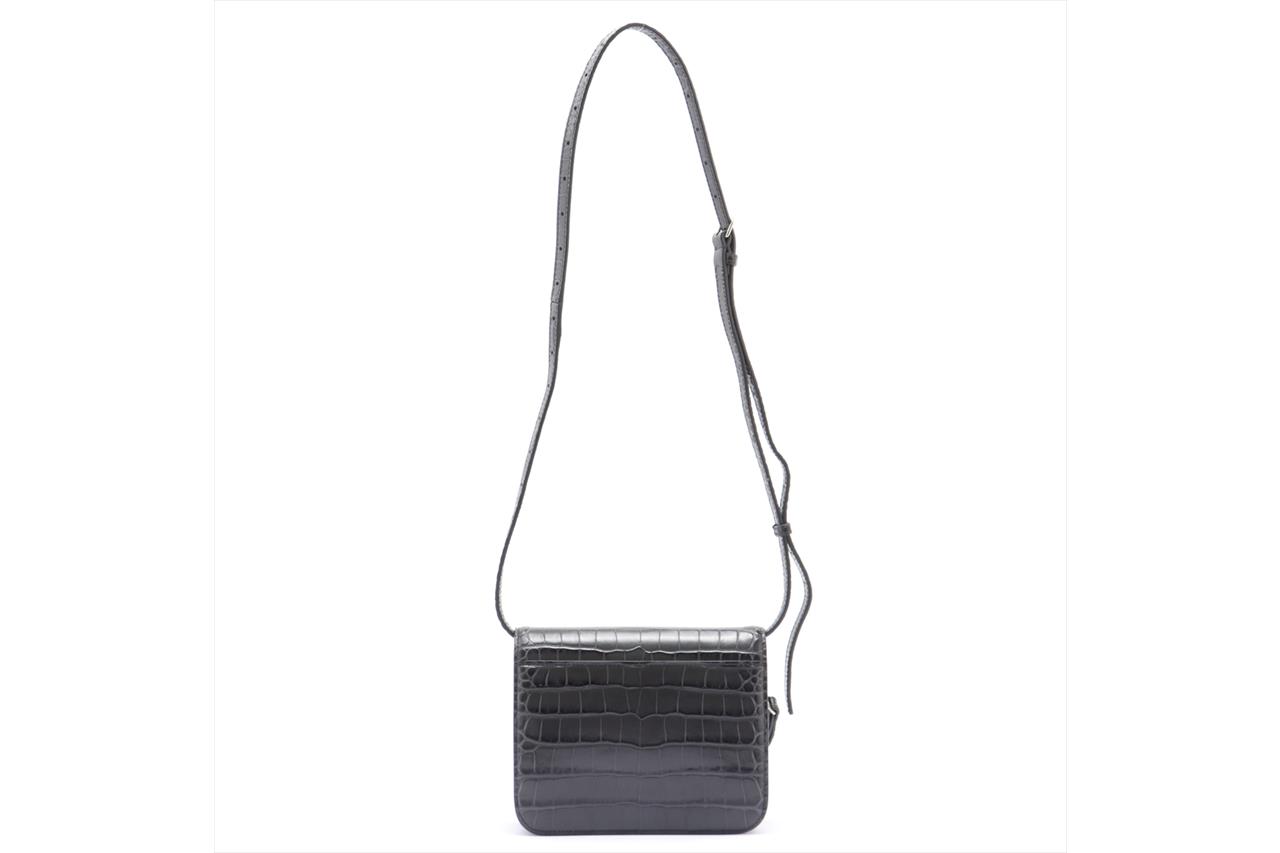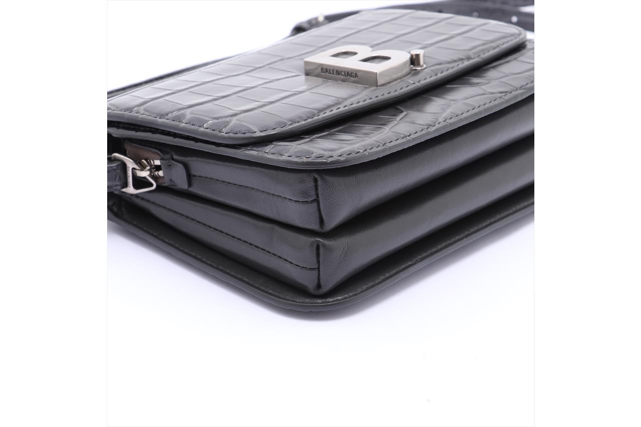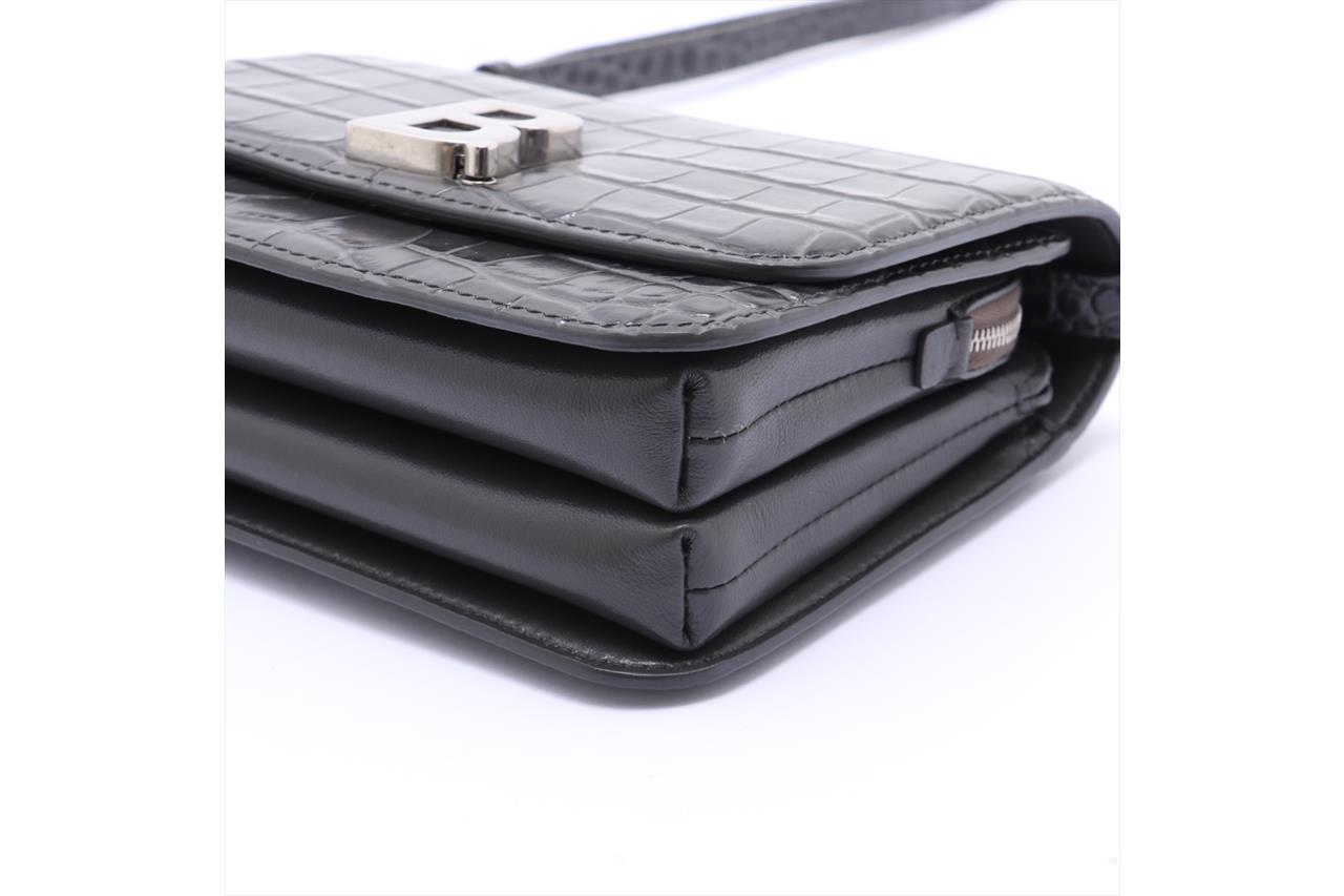 Balenciaga B Plaque Cross Body Bag. Dark grey leather embossed with a crocodile effect. Silver-tone hardware. Approximate dimensions: 18cm (L) x 14cm (H) x 7cm (D). Includes a adjustable and detachable strap of 60cm and 12cm wrist strap. With Balenciaga dust bag and Entrupy Certificate of Authenticity. (Pre-owned)
