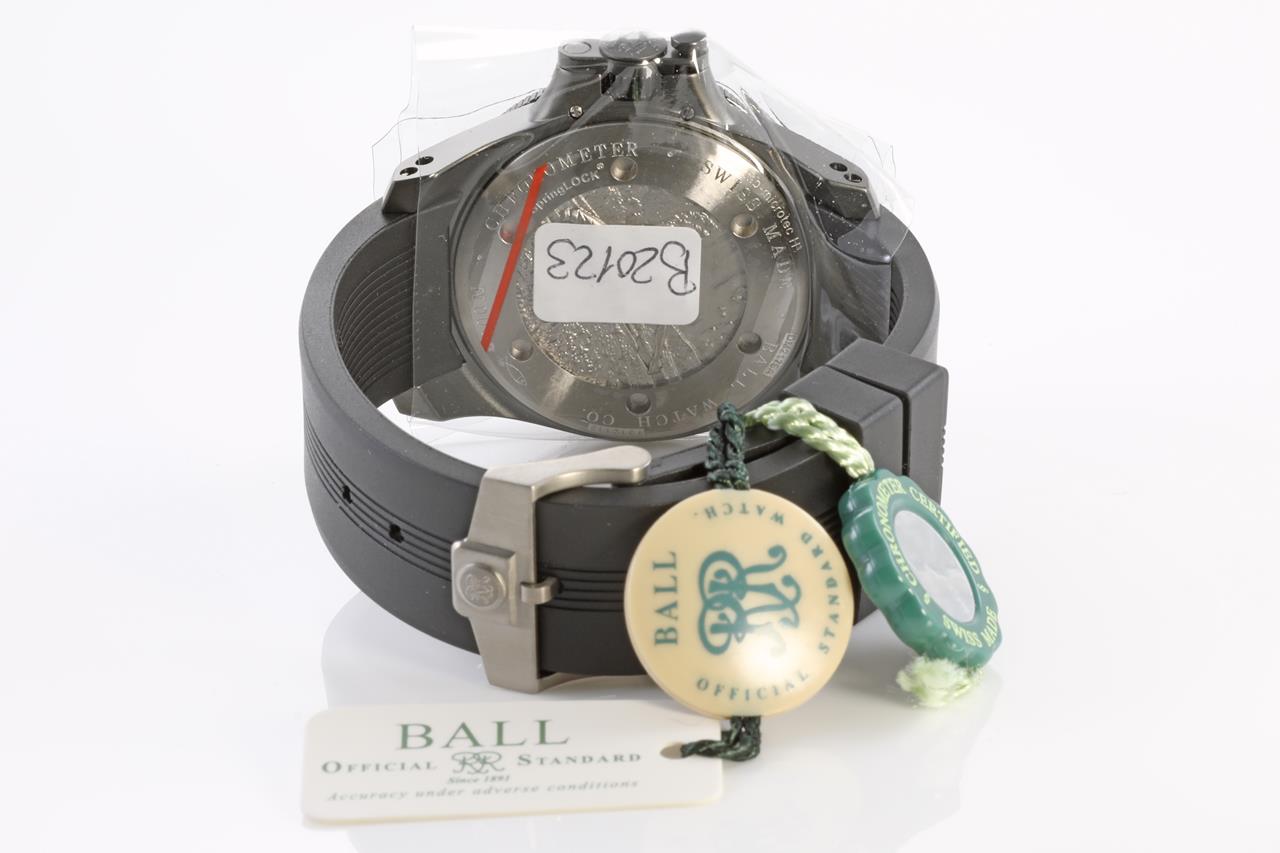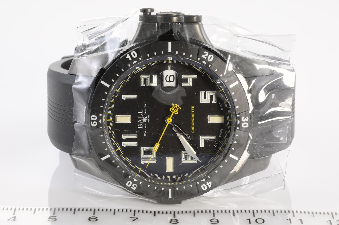 Ball Engineer Hydrocarbon Spacemaster black DLC coated stainless steel automatic mens watch. Black dial, date, case diameter: 42mm, Swiss made. Ref# DM2176A-P1CAJ-BK. With Ball rubber strap and clasp. With Ball QR code linking to user manual, International warranty card and chronometer certificate inside Ball box. 2 year manufacturer warranty. (New, in original wrapping)