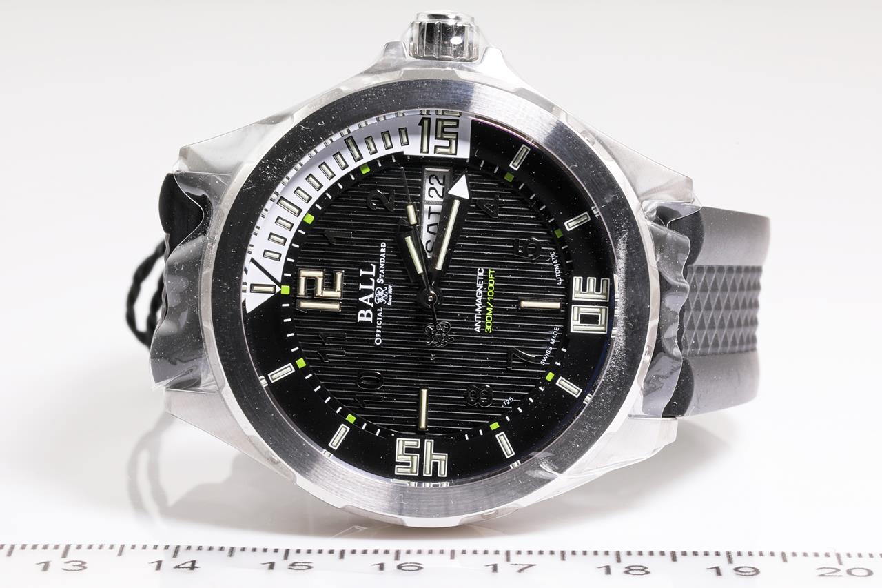 Ball Engineer Master II Diver stainless steel automatic mens watch. Black dial, day & date, case diameter: 42cm, length: 23cm, Swiss made. Ref# DM3020A-PAJ-BK. With Ball black rubber strap and clasp. With Ball Premium International warranty certificate card (not stamped), Ball QR code linking to user manual and Ball box. 2 year manufacturer warranty. (New, in original wrapping)