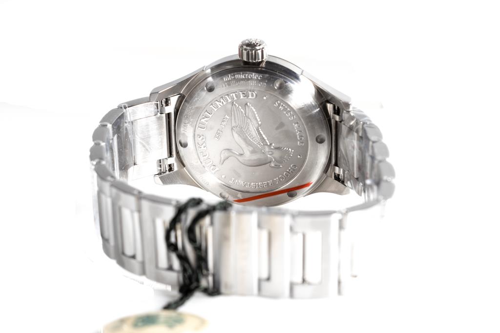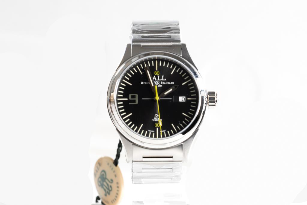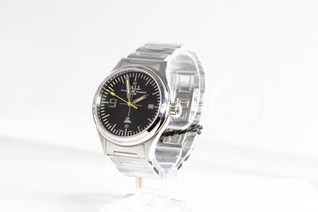 BALL Fireman Duck Unlimited stainless steel automatic mens watch. Black dial, date, case diameter: 40mm, wrist size: 19cm, Swiss made. Ref# NM2188C-S19-BK. With BALL stainless steel bracelet & clasp. With BALL Premium International Warranty Certificate Card, Ball QR code linking to user manual and Ball box. 2-year manufacturer warranty. (New, in original wrapping)