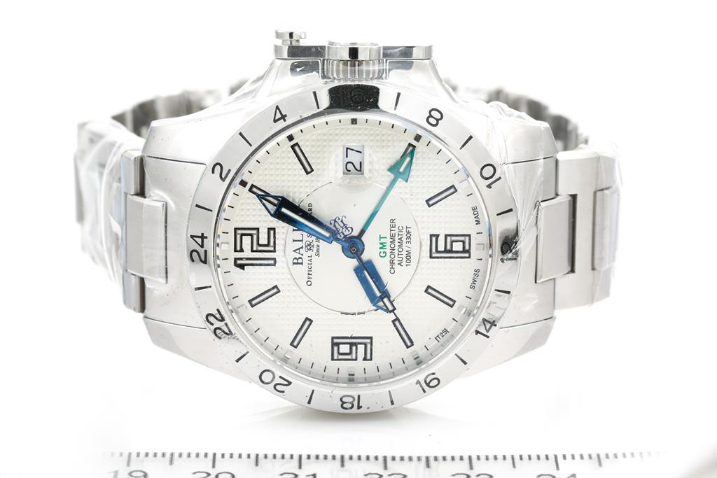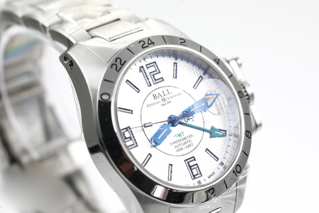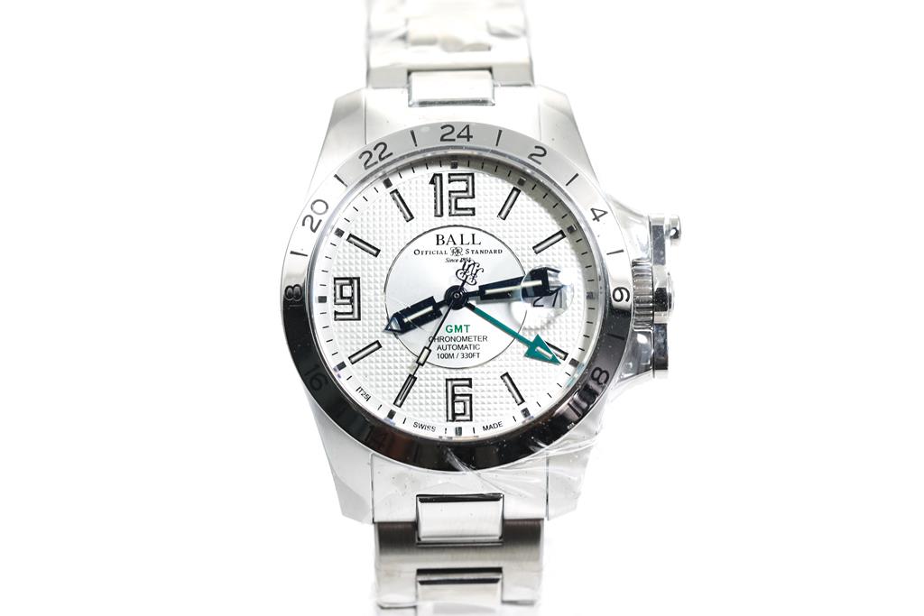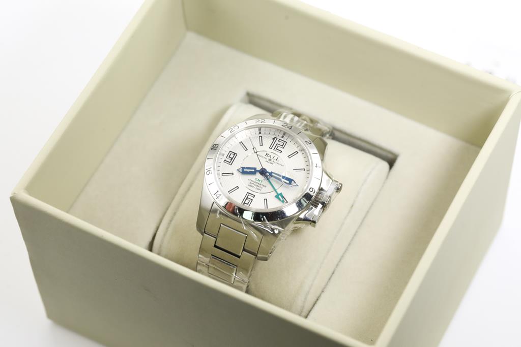 BALL Hydrocarbon Magnate GMT stainless steel automatic mens watch. White dial, date, case diameter: 40mm, wrist size: 20cm, Swiss made. Ref# GM2098C-SCAJ-WH. With BALL stainless steel bracelet and clasp. With BALL Premium International Warranty Certificate Card, Chronometer Certificate Card, BALL QR code linking to user manual and BALL box. 2-year manufacturer warranty. (New, in original wrapping)