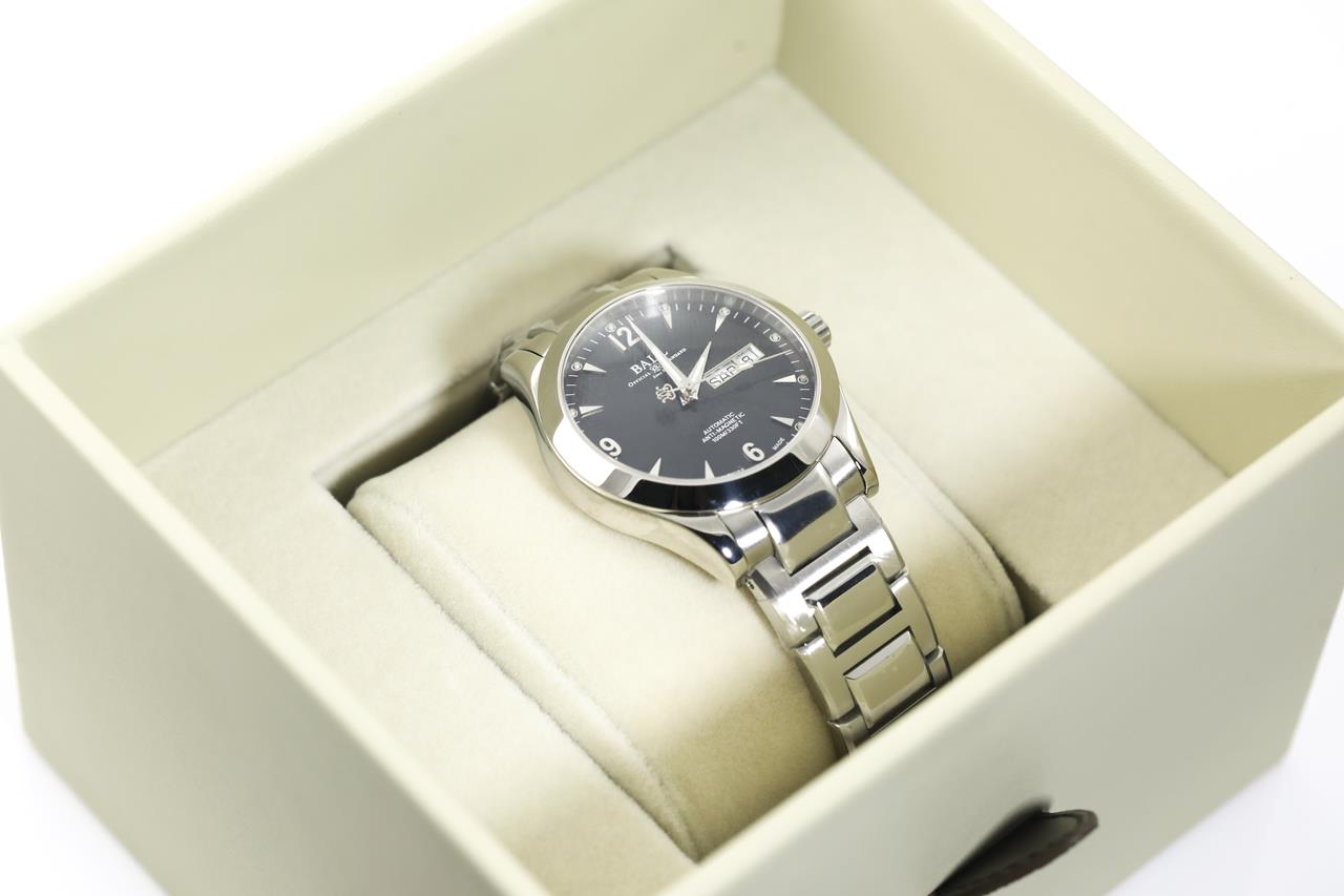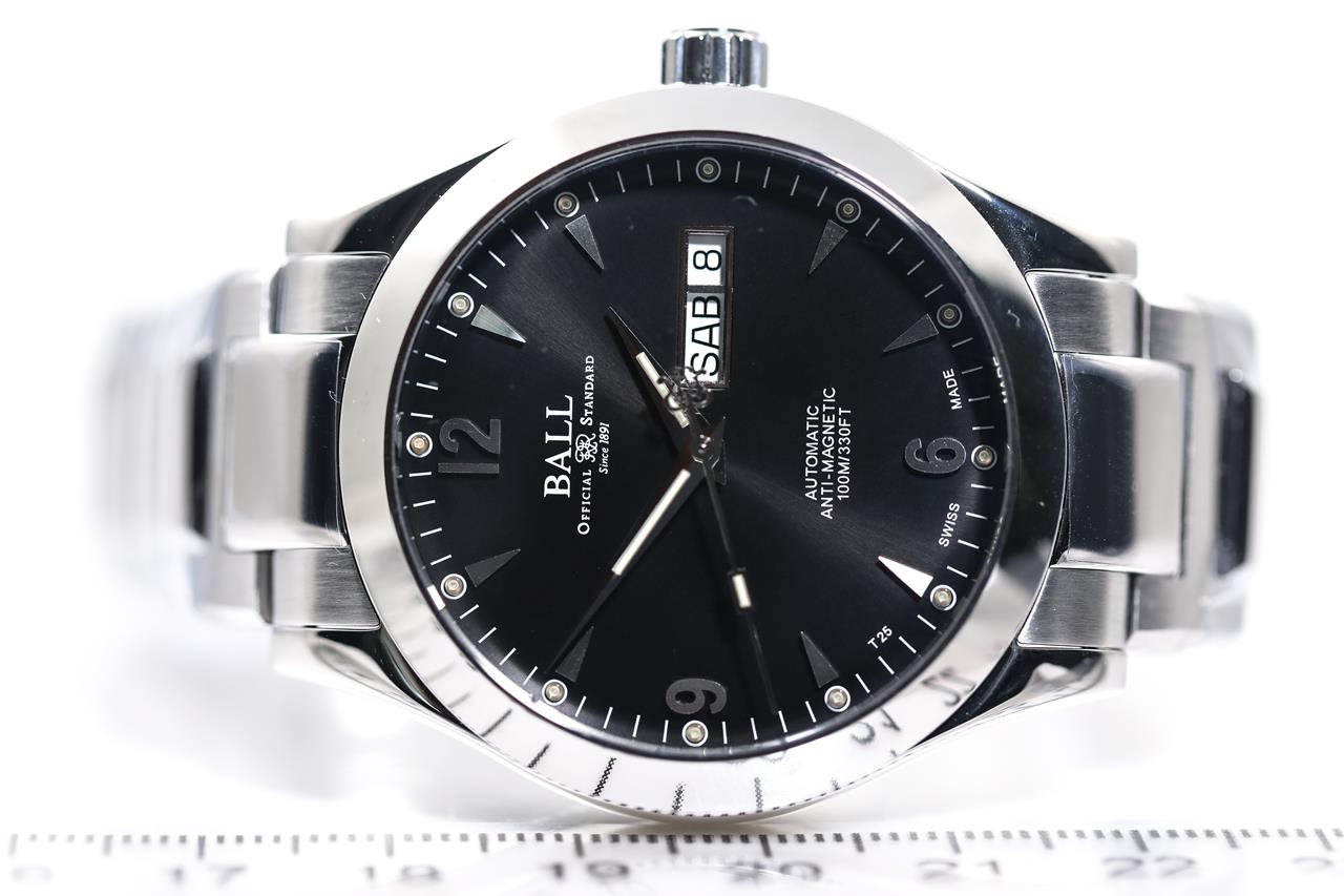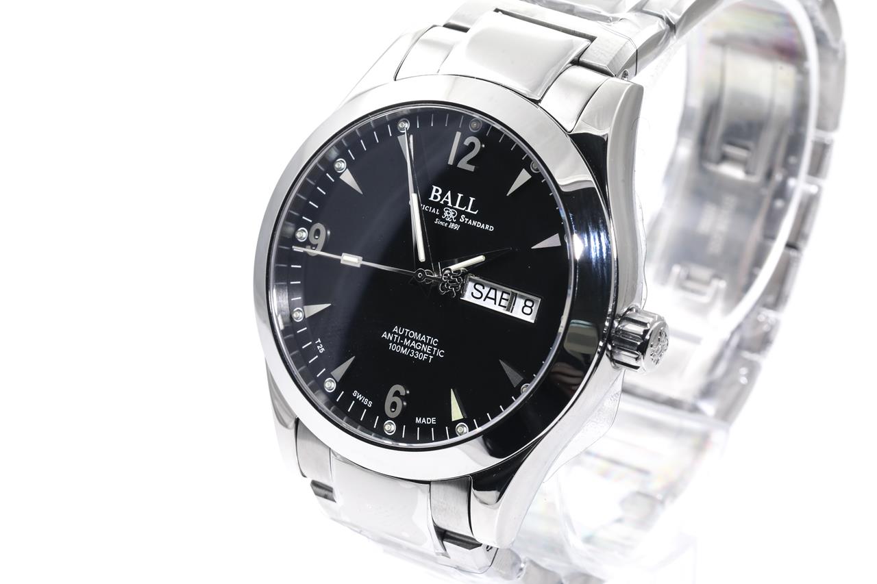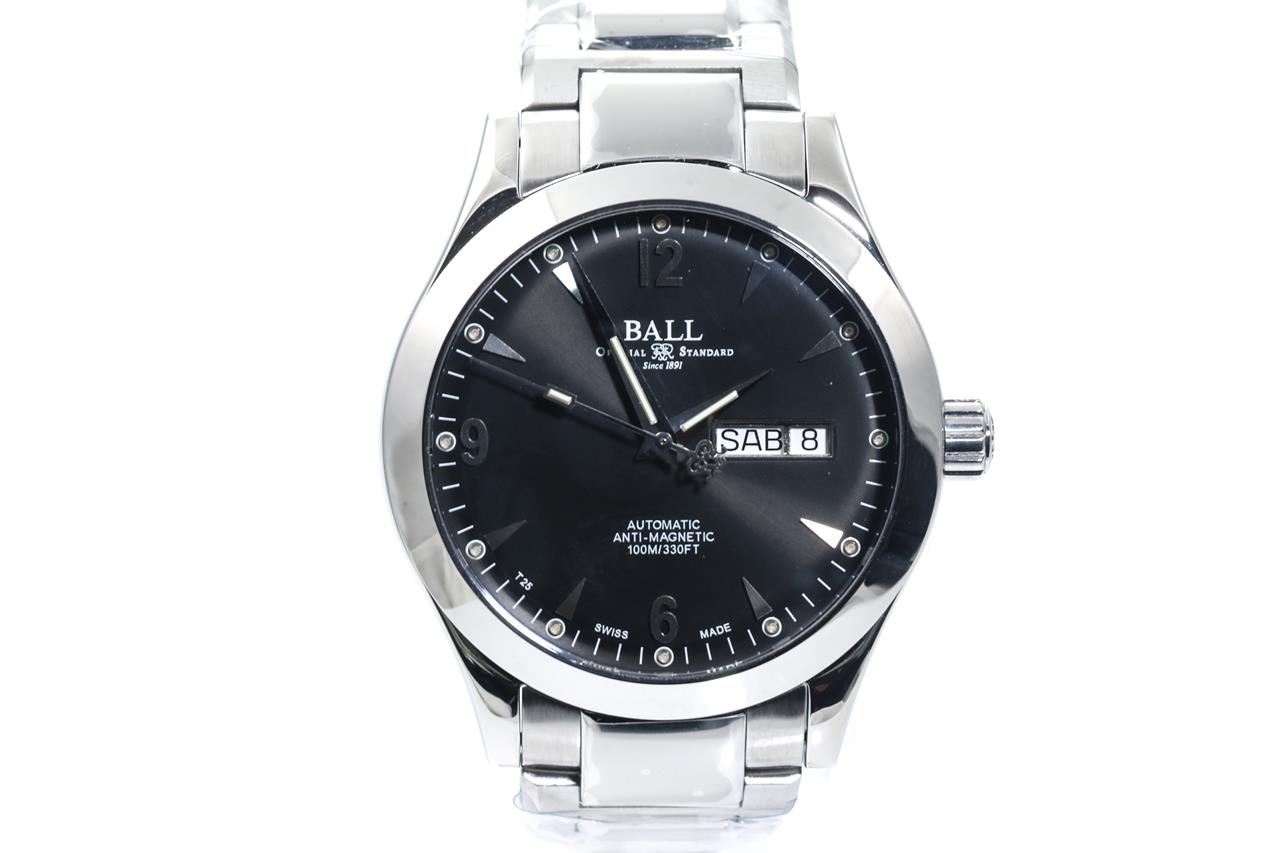 BALL Ohio stainless steel automatic watch. Black dial, day & date, case diameter: 40mm, wrist size: 18cm, Swiss made. Ref# NM2026C-S5J-BK. With BALL stainless steel bracelet and clasp. With BALL QR code linking to user manual, Premium International Warranty Certificate Card and BALL box. 2-year manufacturer warranty. (New, in original wrapping)