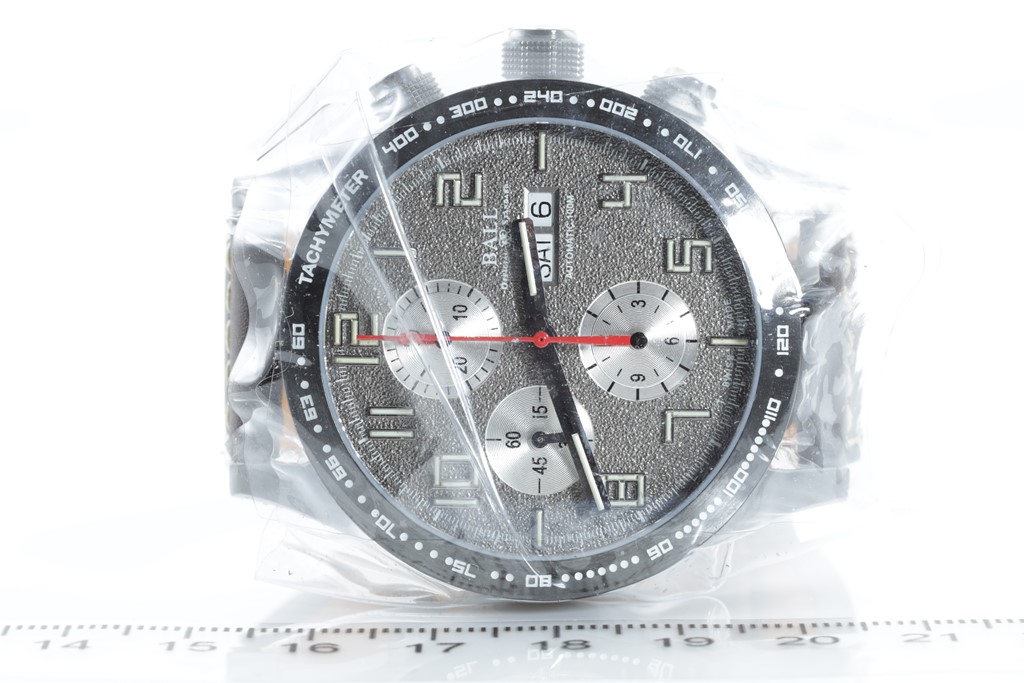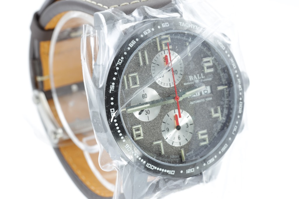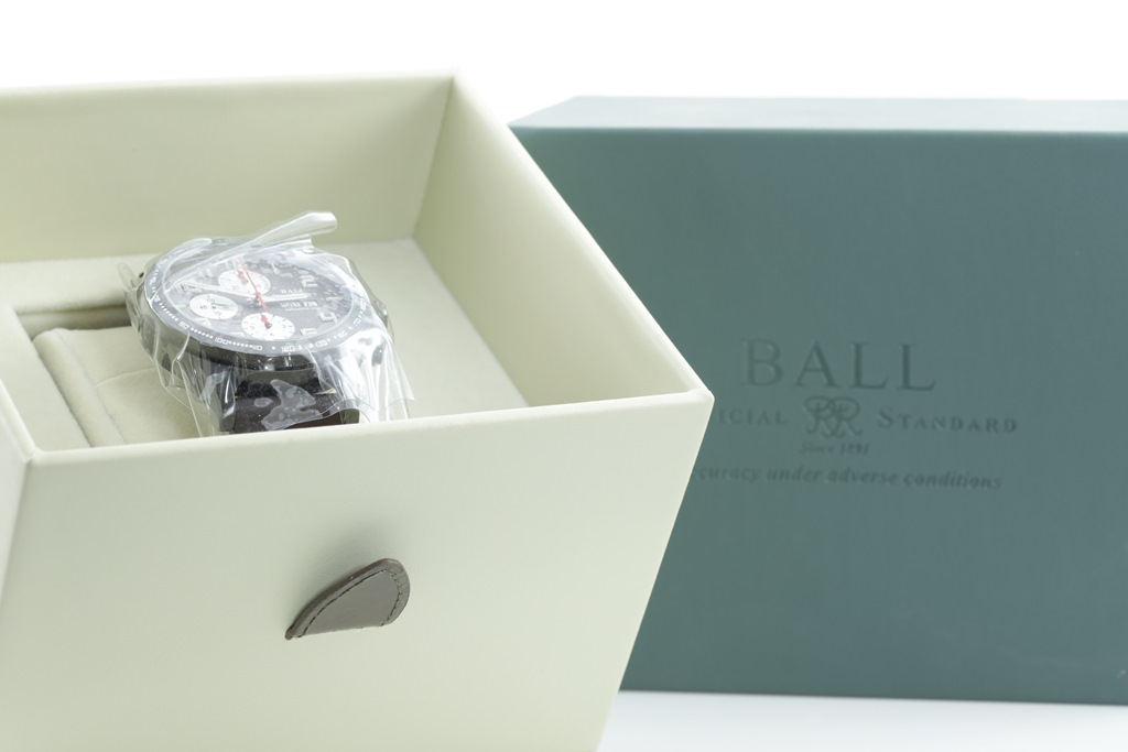 BALL Fireman Storm Chaser Limited Edition of 1999 black DLC coated steel automatic mens watch. Grey chronograph dial, day & date, case diameter: 43mm, length: 21.5cm, Swiss made. Ref# CM2192C-L4A-GY. With Ball brown leather strap and buckle. With BALL Premium International Warranty Certificate Card, Limited-Edition Certificate Card, BALL QR code linking to user manual and BALL box. 2-year manufacturer warranty. (New, in original wrapping)