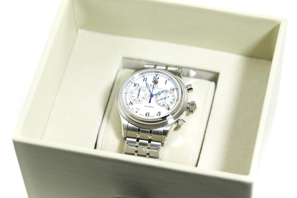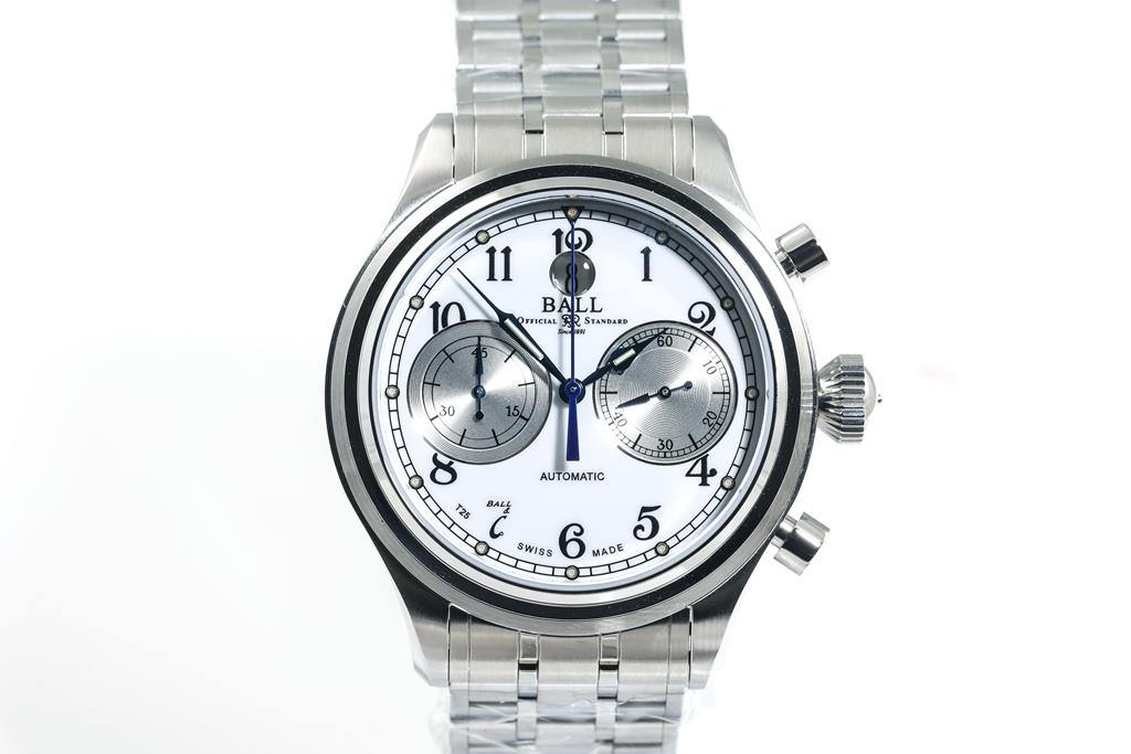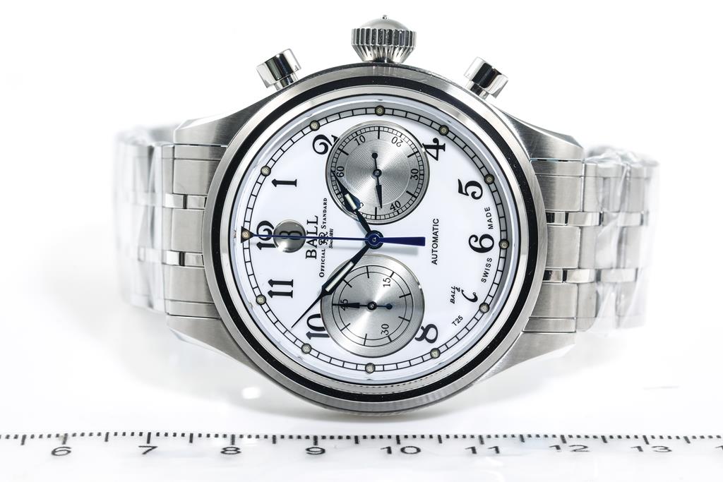 BALL Trainmaster Cannonball stainless steel automatic mens watch. White chronograph dial, date, case diameter: 43mm, wrist size: 19cm, Swiss made. Ref# CM1052D-S3J-WH. With BALL stainless steel bracelet and clasp. With BALL QR code linking to user manual, Premium International Warranty Certificate Card and BALL box. 2-year manufacturer warranty. (New, in original wrapping)