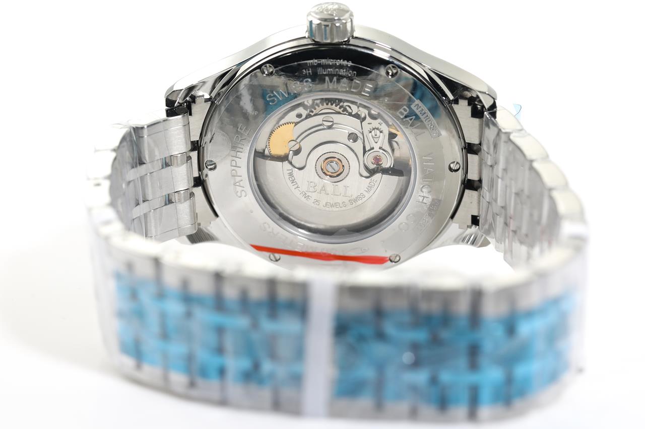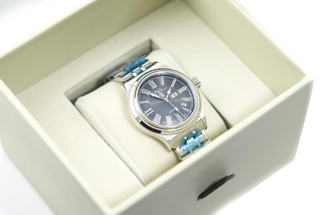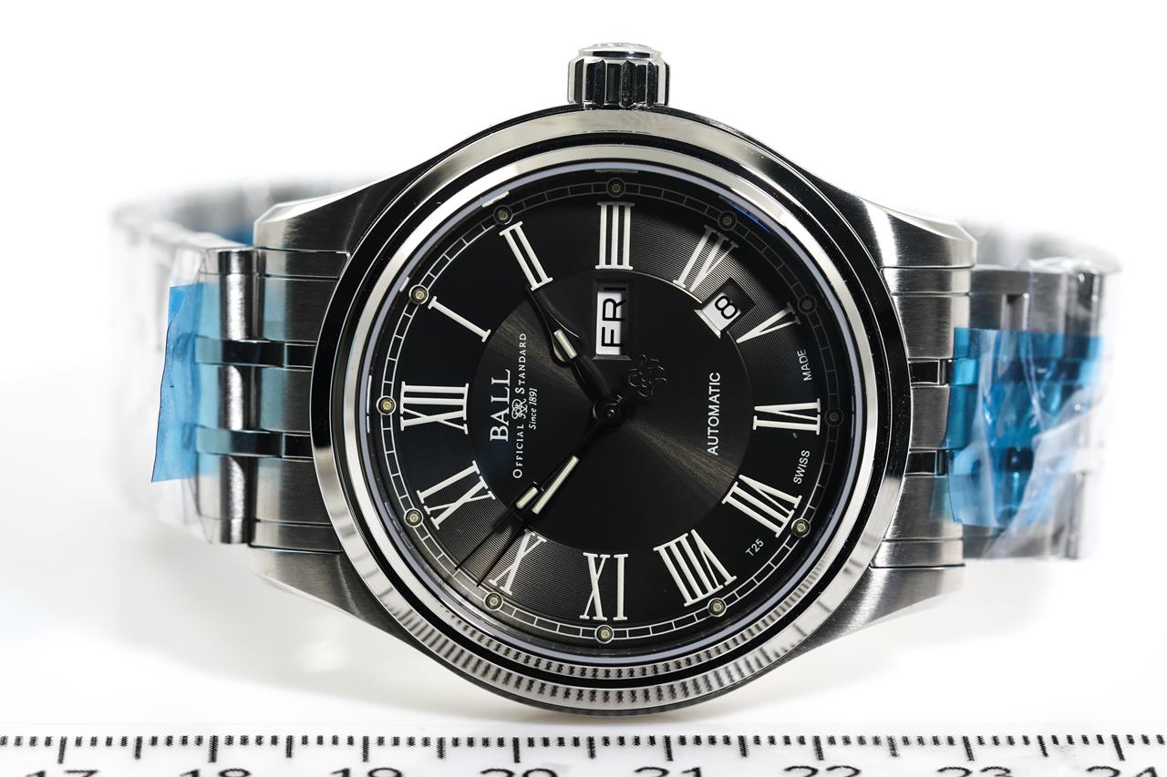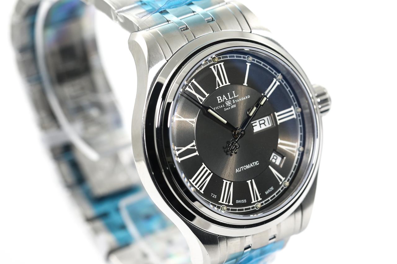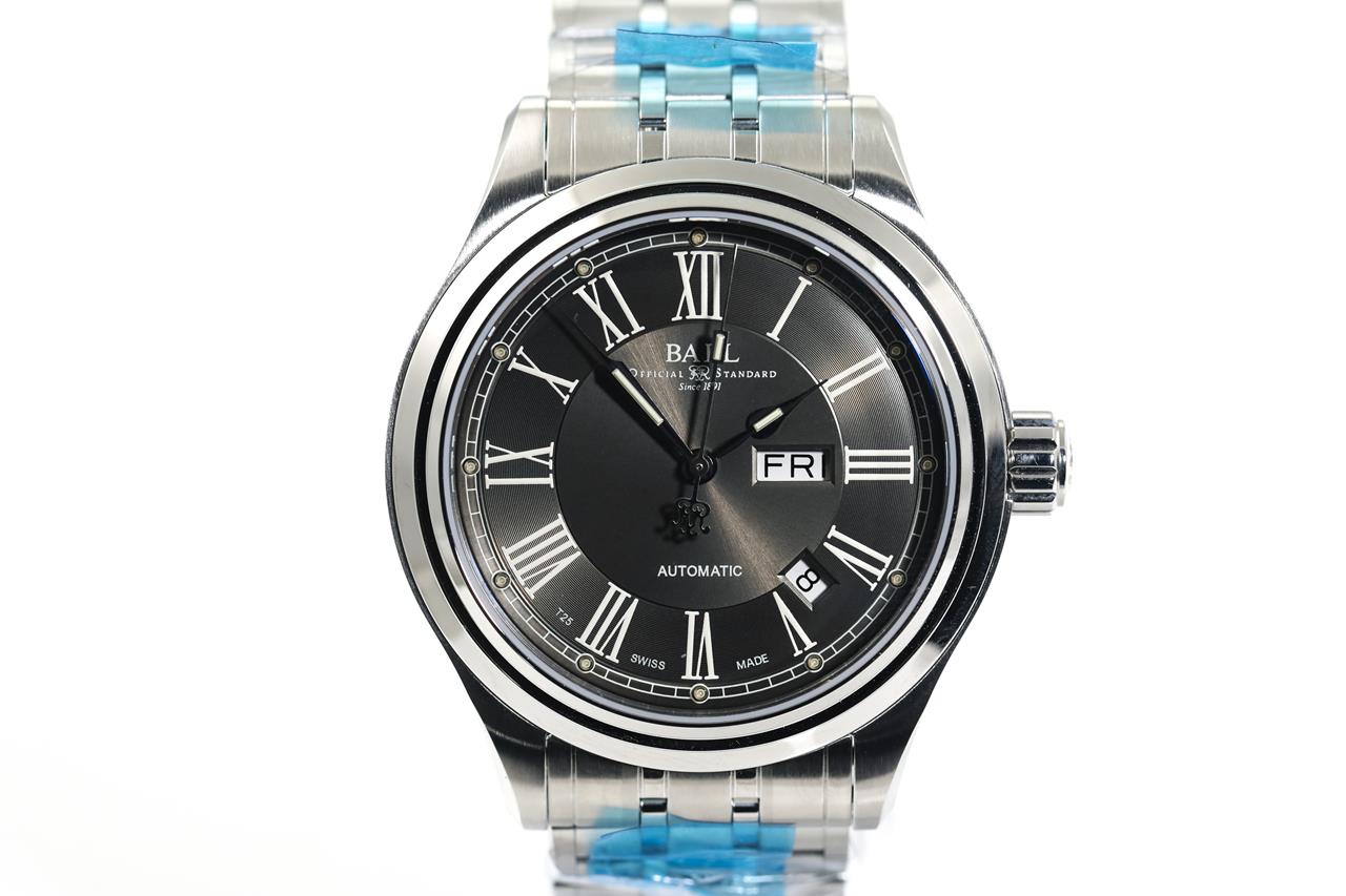 BALL Trainmaster Roman stainless steel automatic mens watch. Grey dial, day & date, case diameter: 41mm, wrist size: 19cm, Swiss made. Ref# NM1058D-S4J-GY. With BALL stainless steel bracelet and clasp. With BALL QR code linking to user manual, Premium International Warranty Certificate Card and BALL box. 2-year manufacturer warranty. (New, in original wrapping)