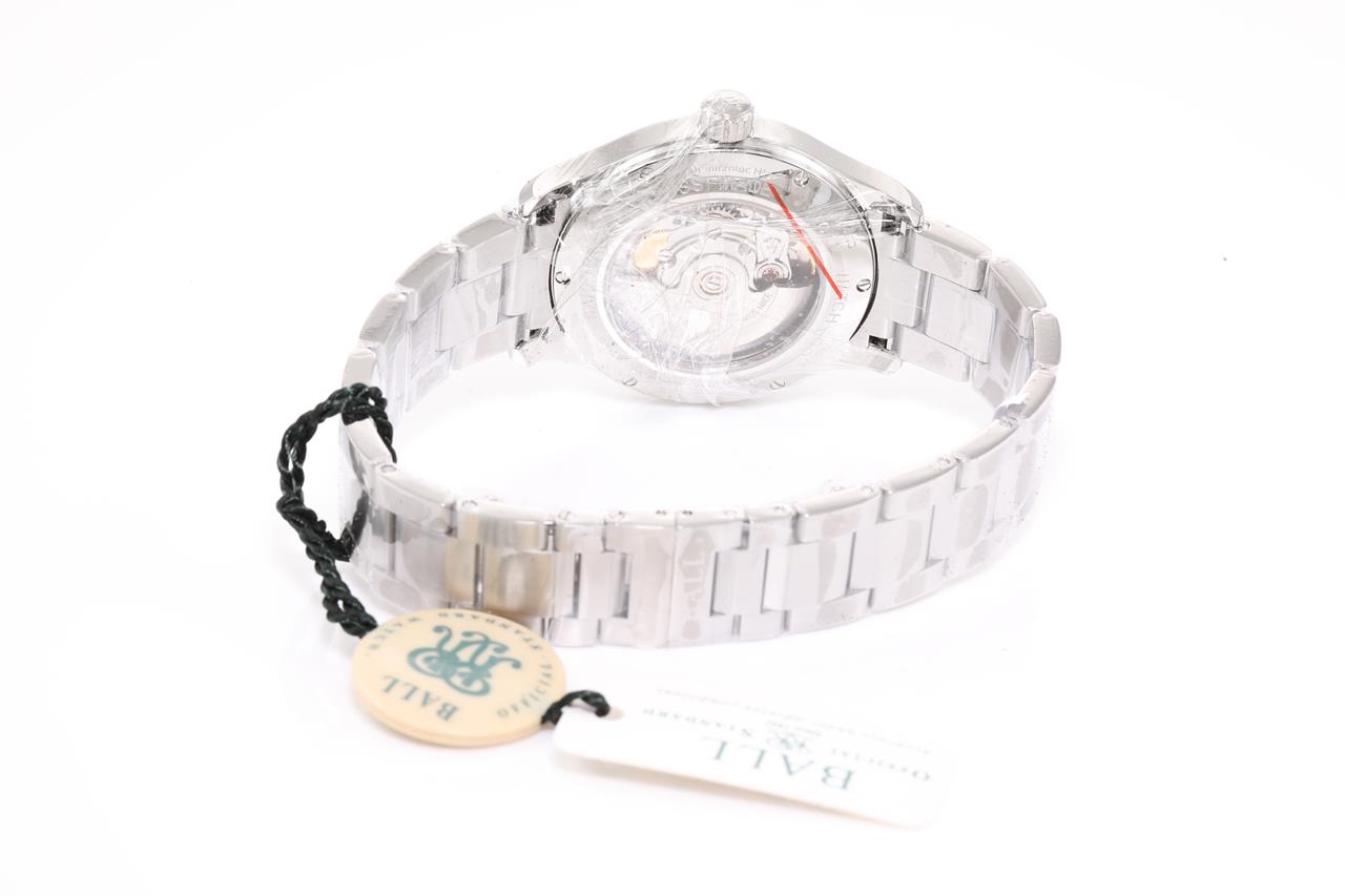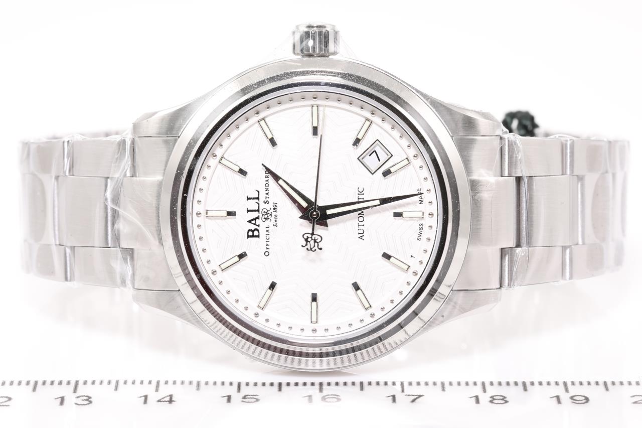 Ball Trainmaster Streamliner stainless steel automatic mens watch. Silver dial, date, case diameter: 39cm, wrist size: 19cm, Swiss made. Ref# NM1060D-S5-SL. With Ball stainless steel bracelet and clasp. With Ball Premium International warranty certificate card (not stamped), Ball QR code linking to user manual and Ball box. 2 year manufacturer warranty. (New, in original wrapping)